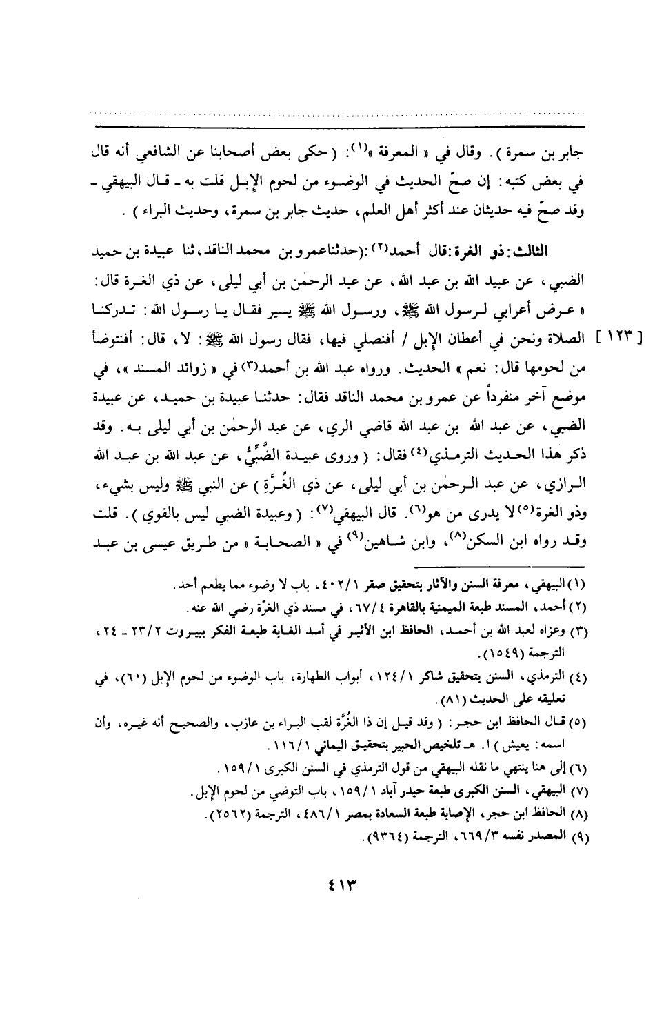 الثالث: ذو الغرة: قال أحمد: (حدثنا عمرو بن محمد الناقد، ثنا عبيدة بن حميد الضبي، عن عبيد الله بن عبد الله، عن عبد الرحمن بن أبي ليلى، عن ذي الغرة قال: "عرض" أعرابي لرسول الله - صلى الله عليه وسلم -، ورسول الله - صلى الله عليه وسلم - يسير فقال يا رسول الله: تدركنا الصلاة ونحن في أعطان الإبل أفنصلي فيها، فقال رسول الله - صلى الله عليه وسلم -: لا، قال: أفنتوضأ من لحومها قال: نعم" الحديث. ورواه عبد الله بن أحمد في "زوائد المسند"، في موضع آخر منفردًا عن عمرو بن محمد الناقد فقال: حدثنا عبيدة بن حميد، عن عبيدة الضبي، عن عبد الله بن عبد الله قاضي الري، عن عبد الرحمن بن أبي ليلى به. وقد ذكر هذا الحديث الترمذي فقال: (وروى عبيدة الضَّبِّيُّ، عن عبد الله بن عبد الله الرازي، عن عبد الرحمن بن أبي ليلى، عن ذي الغُرَّةِ) عن النبي - صلى الله عليه وسلم - وليس بشيء، وذو الغرة لا يدرى من هو. قال البيهقي: (وعبيدة الضبي ليس بالقوي). قلت وقد رواه ابن السكن، وابن شاهين في "الصحابة" من طريق عيسى بن عبد