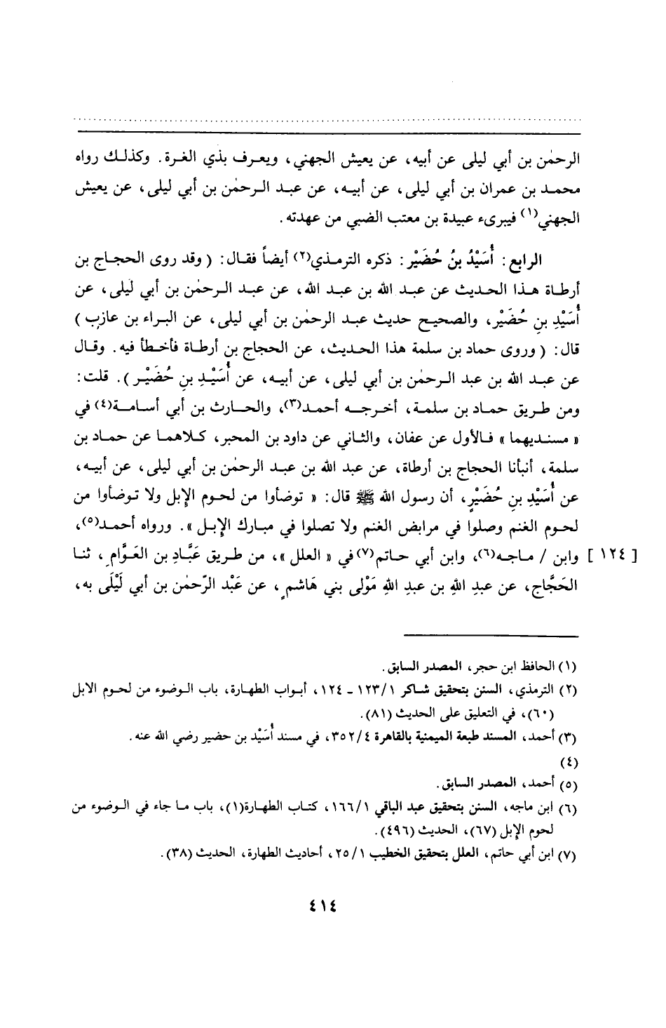 الرابع: أُسَيْدُ بنُ حُضَيْر: ذكره الترمذي أيضًا فقال: (وقد روى الحجاج بن أرطاة هذا الحديث عن عبد الله بن عبد الله، عن عبد الرحمن بن أبي ليلى، عن أُسَيْدِ بنِ حُضَيْر، والصحيح حديث عبد الرحمن بن أبي ليلى، عن البراء بن عازب) قال: (وروى حماد بن سلمة هذا الحديث، عن الحجاج بن أرطاة فأخطأ فيه. وقال عن عبد الله بن عبد الرحمن بن أبي ليلى، عن أبيه، عن أُسَيْدِ بنِ حُضَيْر). قلت: ومن طريق حماد بن سلمة، أخرجه أحمد، والحارث بن أبي أسامة في "مسنديهما" فالأول عن عفان، والثاني عن داود بن المحبر، كلاهما عن حماد بن سلمة، أنبأنا الحجاج بن أرطاة، عن عبد الله بن عبد الرحمن بن أبي ليلى، عن أبيه، عن أسَيْدِ بنِ حُضَيْرٍ، أن رسول الله - صلى الله عليه وسلم - قال: "توضأوا من لحوم الإِبل ولا توضأوا من لحوم الغنم وصلوا في مرابض الغنم ولا تصلوا في مبارك الإبل". ورواه أحمد، وابن ماجه، وابن أبي حاتم في "العلل"، من طريق عبَّادِ بن العَوَّامِ، ثنا الحَجَّاج، عن عبدِ اللهِ بن عبدِ اللهِ مَوْلى بني هَاشم، عن عَبْد الرْحمن بن أبي لَيْلَى به،
