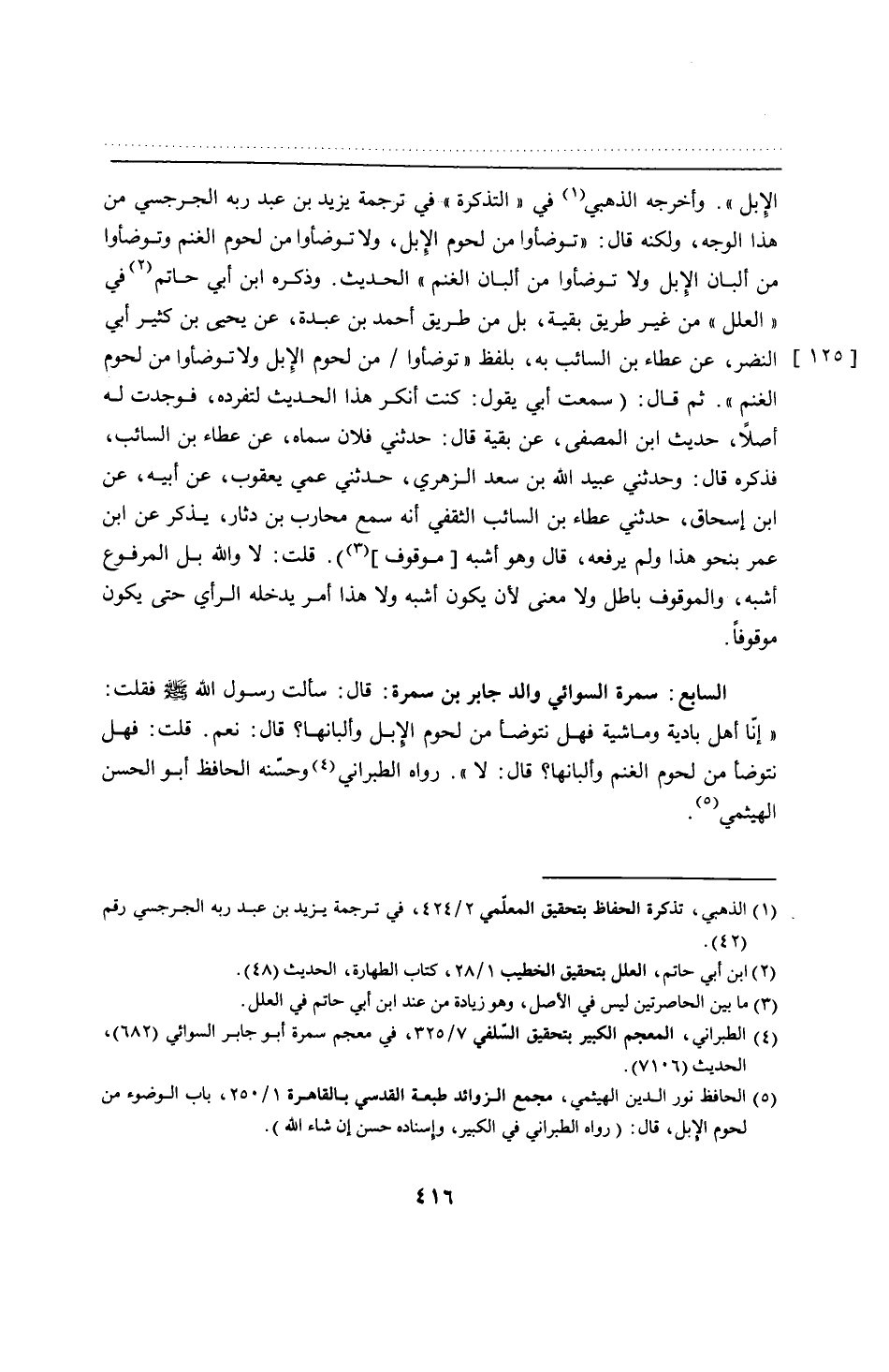 السابع: سمرة السوائي والد جابر بن سمرة: قال: سألت رسول الله - صلى الله عليه وسلم - فقلت: "إنّا أهل بادية وماشية فهل نتوضأ من لحوم الإبل وألبانها؟ قال: نعم. قلت: فهل نتوضأ من لحوم الغنم وألبانها؟ قال: لا". رواه الطبراني وحسّنه الحافظ أبو الحسن الهيثمي.