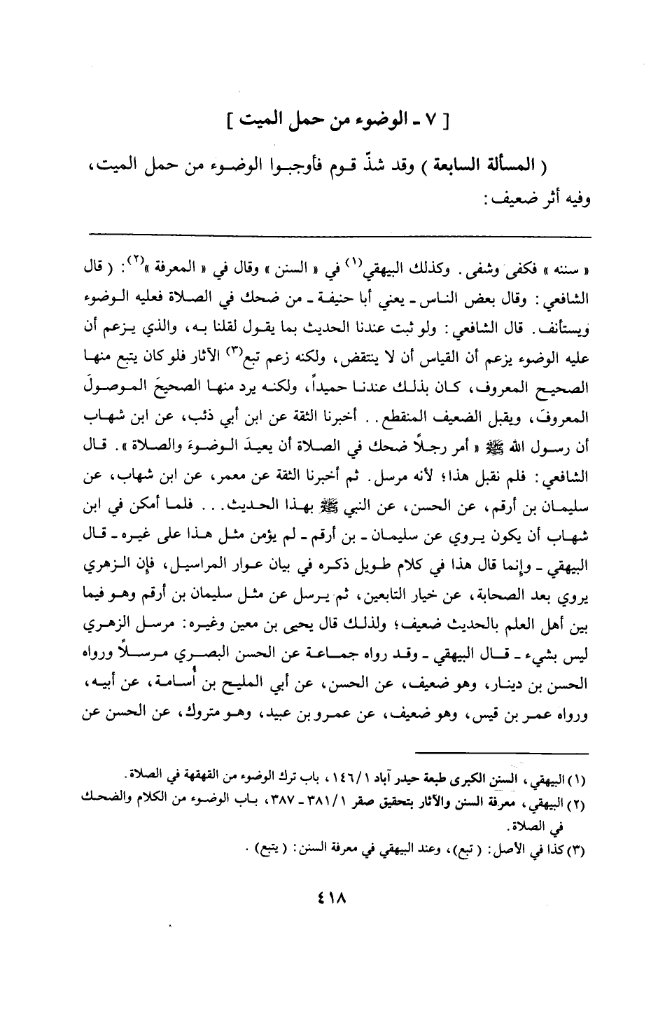 "سننه" فكفى وشفى. وكذلك البيهقي في "السنن" وقال في "المعرفة": (قال الشافعي: وقال بعض الناس -يعني أبا حنيفة- من ضحك في الصلاة فعليه الوضوء ويستأنف. قال الشافعي: ولو ثبت عندنا الحديث بما يقول لقلنا به، والذي يزعم أن عليه الوضوء يزعم أن القياس أن لا ينتقض، ولكنه زعم تبع الآثار فلو كان يتبع منها الصحيح المعروف، كان بذلك عندنا حميدًا، ولكنه يرد منها الصحيحَ الموصولَ المعروفَ، ويقبل الضعيف المنقطع .. أخبرنا الثقة عن ابن أبي ذئب، عن ابن شهاب أن رسول الله - صلى الله عليه وسلم - "أمر رجلًا ضحك في الصلاة أن يعيدَ الوضوءَ والصلاة". قال الشافعي: فلم نقبل هذا؛ لأنه مرسل. ثم أخبرنا الثقة عن معمر، عن ابن شهاب، عن سليمان بن أرقم، عن الحسن، عن النبي - صلى الله عليه وسلم - بهذا الحديث. . . فلما أمكن في ابن شهاب أن يكون يروي عن سليمان -بن أرقم- لم يؤمن مثل هذا على غيره -قال البيهقي- وإنما قال هذا في كلام طويل ذكره في بيان عوار المراسيل، فإِن الزهري يروي بعد الصحابة، عن خيار التابعين، ثم يرسل عن مثل سليمان بن أرقم وهو فيما بين أهل العلم بالحديث ضعيف؛ ولذلك قال يحيى بن معين وغيره: مرسل الزهري ليس بشيء -قال البيهقي- وقد رواه جماعة عن الحسن البصري مرسلًا ورواه الحسن بن دينار، وهو ضعيف، عن الحسن، عن أبي المليح بن أُسامة، عن أبيه، ورواه عمر بن قيس، وهو ضعيف، عن عمرو بن عبيد، وهو متروك، عن الحسن عن