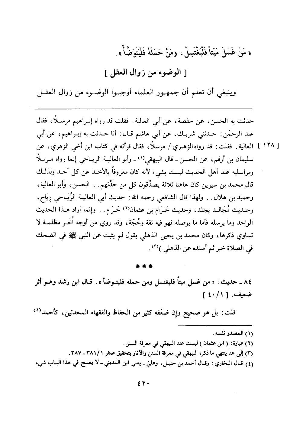 84 - حديث: "من غسل ميتًا فليغتسل ومن حمله فليتوضأ". قال ابن رشد وهو أثر ضعيف.