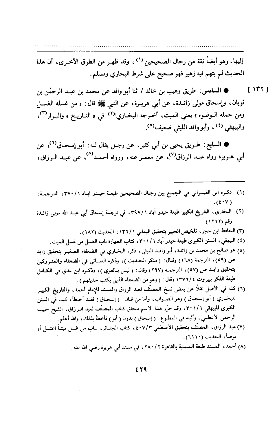 • السادس: طريق وهيب بن خالد ثنا أبو واقد عن محمد بن عبد الرحمن بن ثوبان، وإسحاق مولى زائدة، عن أبي هريرة، عن النبي - صلى الله عليه وسلم - قال: "من غسله الغسل ومن حمله الوضوء" يعني الميت، أخرجه البخاري في "التاريخ" والبزار، والبيهقي، وأبو واقد الليثي ضعيف.