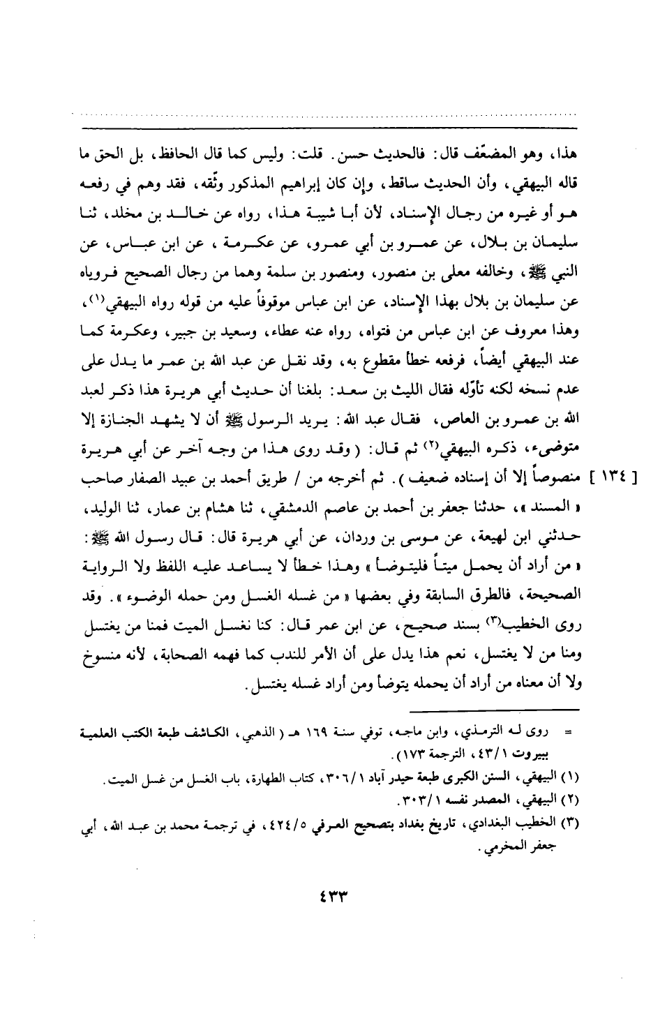 هذا، وهو المضعّف قال: فالحديث حسن. قلت: وليس كما قال الحافظ، بل الحق ما قاله البيهقي، وأن الحديث ساقط، وإن كان إبراهيم المذكور وثّقه، فقد وهم في رفعه هو أو غيره من رجال الإسناد، لأن أبا شيبة هذا، رواه عن خالد بن مخلد، ثنا سليمان بن بلال، عن عمرو بن أبي عمرو، عن عكرمة، عن ابن عباس، عن النبي - صلى الله عليه وسلم -، وخالفه معلى بن منصور، ومنصور بن سلمة وهما من رجال الصحيح فروياه عن سليمان بن بلال بهذا الإسناد، عن ابن عباس موقوفًا عليه من قوله رواه البيهقي, وهذا معروف عن ابن عباس من فتواه، رواه عنه عطاء، وسعيد بن جبير، وعكرمة كما عند البيهقي أيضًا، فرفعه خطأ مقطوع به، وقد نقل عن عبد الله بن عمر ما يدل على عدم نسخه لكنه تأوّله فقال الليث بن سعد: بلغنا أن حديث أبي هريرة هذا ذكر لعبد الله بن عمرو بن العاص، فقال عبد الله: يريد الرسول - صلى الله عليه وسلم - أن لا يشهد الجنازة إلا متوضئ، ذكره البيهقي ثم قال: (وقد روى هذا من وجه آخر عن أبي هريرة منصوصًا إلا أن إسناده ضعيف). ثم أخرجه من طريق أحمد بن عبيد الصفار صاحب "المسند"، حدثنا جعفر بن أحمد بن عاصم الدمشقي، ثنا هشام بن عمار، ثنا الوليد، حدثني ابن لهيعة، عن موسى بن وردان، عن أبي هريرة قال: قال رسول الله - صلى الله عليه وسلم -: "من أراد أن يحمل ميتًا فليتوضأ" وهذا خطأ لا يساعد عليه اللفظ ولا الرواية الصحيحة، فالطرق السابقة وفي بعضها "من غسله الغسل ومن حمله الوضوء". وقد روى الخطيب بسند صحيح، عن ابن عمر قال: كنا نغسل الميت فمنا من يغتسل ومنا من لا يغتسل، نعم هذا يدل على أن الأمر للندب كما فهمه الصحابة، لأنه منسوخ ولا أن معناه من أراد أن يحمله يتوضأ ومن أراد غسله يغتسل.