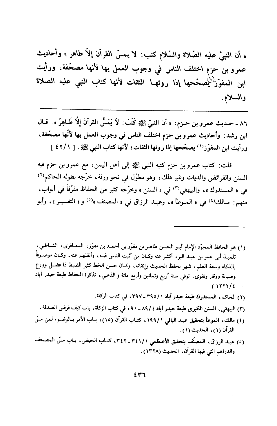 86 - حديث عمرو بن حزم: "أن النبيّ - صلى الله عليه وسلم - كتَبَ: لَا يَمَسُّ القرآنَ إِلَّا طَاهِرٌ". قال ابن رشد: وأحاديث عمرو بن حزم اختلف الناس في وجوب العمل بها لأنّها مصحّفة، ورأيت ابن المفوّز يصحّحها إذا روتها الثقات؛ لأنها كتاب النبي - صلى الله عليه وسلم -.