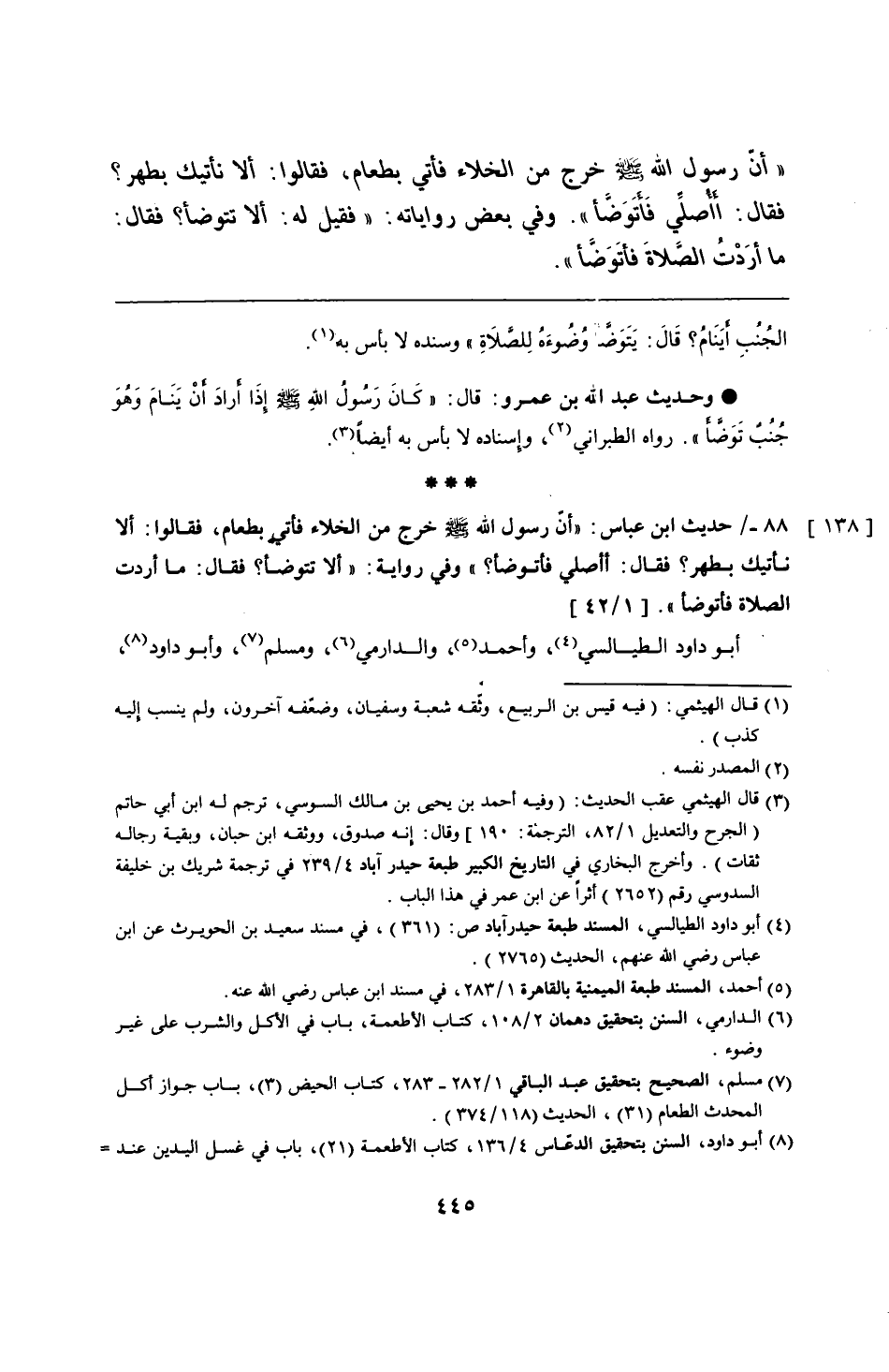 88 - حديث ابن عباس: "أَنّ رسول الله - صلى الله عليه وسلم - خرج من الخلاء فأتي بطعام، فقالوا: ألا نأتيك بطهر؟ فقال: أأصلى فأتوضأ؟ " وفي رواية: "ألا تتوضأ؟ فقال: ما أردت الصلاة فأتوضأ".