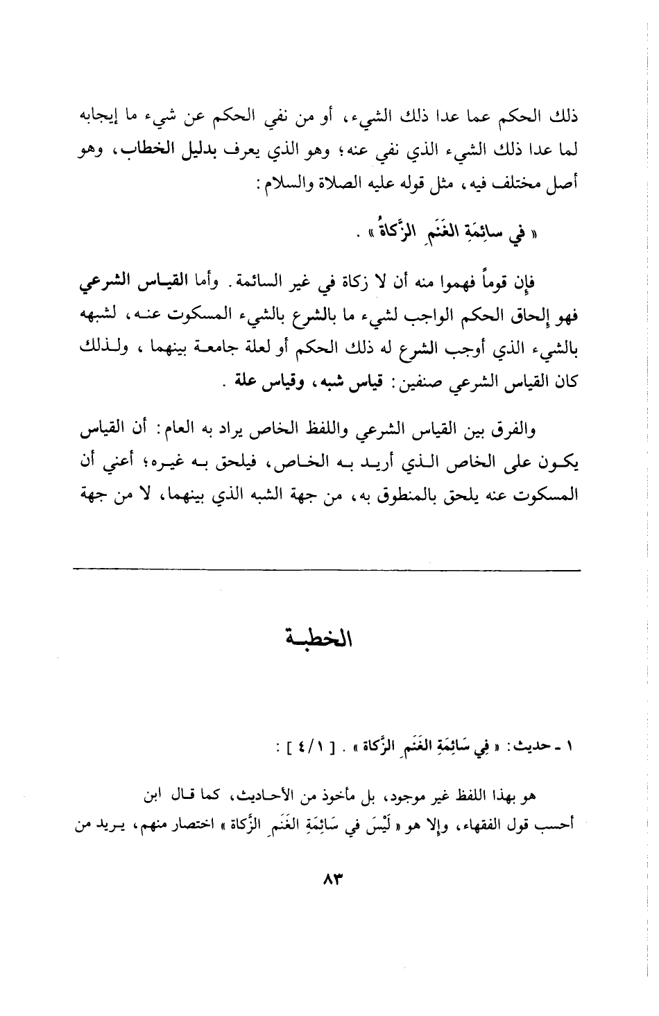 هو بهذا اللفظ غير موجود، بل مأخوذ من الأحاديث، كما قال ابن [الصلاح] (*) أحسب قول الفقهاء [والأصوليين] (**) «في سَائِمَةِ الغَنَمِ الزَّكاة» اختصار منهم، يريد من