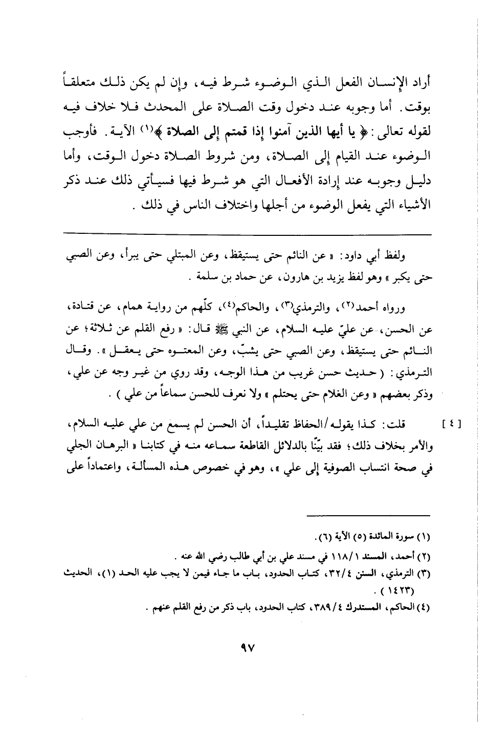 ورواه أحمد، والترمذي، والحاكم، كلّهم من رواية همام، عن قتادة، عن الحسن، عن عليّ -عليه السلام-، عن النبي - صلى الله عليه وسلم - قال: "رفع القلم عن ثلاثة؛ عن النائم حتى يستيقظ، وعن الصبي حتى يشبّ، وعن المعتوه حتى يعقل". وقال الترمذي: (حديث حسن غريب من هذا الوجه، وقد روي من غير وجه عن علي، وذكر بعضهم "وعن الغلام حتى يحتلم" ولا نعرف للحسن سماعاً من علي).