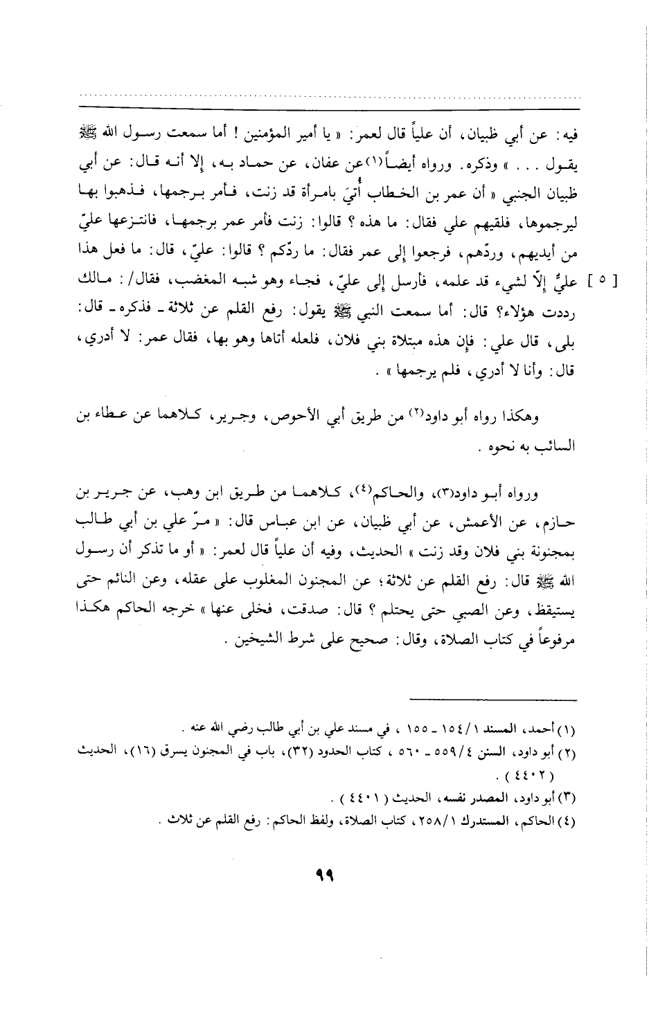 ورواه أبوداود، والحاكم، كلاهما من طريق ابن وهب، عن جرير بن حازم، عن الأعمش، عن أبي ظبيان، عن ابن عباس قال: "مرّ علي بن أبي طالب بمجنونة بني فلان وقد زنت" الحديث، وفيه أن عليًا قال لعمر: "أو ما تذكر أن رسول الله - صلى الله عليه وسلم - قال: رفع القلم عن ثلاثة؛ عن المجنون المغلوب على عقله، وعن النائم حتى يستيقظ، وعن الصبي حتى يحتلم؟ قال: صدقت، فخلى عنها" خرجه الحاكم هكذا مرفوعًا في كتاب الصلاة، وقال: صحيح على شرط الشيخين.