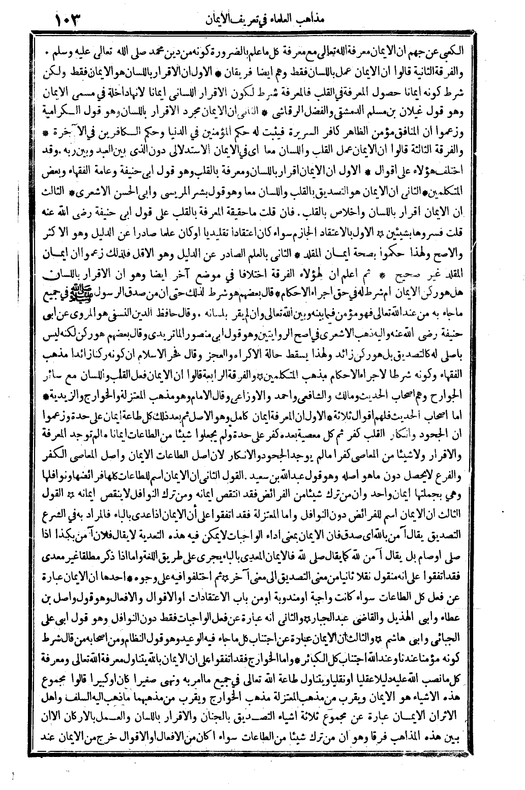 الكعبي عَن جهم أَن الْإِيمَان معرفَة الله تَعَالَى مَعَ معرفَة كل مَا علم بِالضَّرُورَةِ كَونه من دين مُحَمَّد صلى الله عَلَيْهِ وَسلم والفرقة الثَّانِيَة قَالُوا أَن الْإِيمَان عمل بِاللِّسَانِ فقد وهم أَيْضا فريقان الأول أَن الْإِقْرَار بِاللِّسَانِ هُوَ الْإِيمَان فَقَط وَلَكِن شَرط كَونه إِيمَانًا حُصُول الْمعرفَة فِي الْقلب فالمعرفة شَرط لكَون الْإِقْرَار اللساني إِيمَانًا لِأَنَّهَا دَاخِلَة فِي مُسَمّى الْإِيمَان وَهُوَ قَول غيلَان بن مُسلم الدِّمَشْقِي وَالْفضل الرقاشِي الثَّانِي أَن الْإِيمَان مُجَرّد الْإِقْرَار بِاللِّسَانِ وَهُوَ قَول الكرامية وَزَعَمُوا أَن الْمُنَافِق مُؤمن الظَّاهِر كَافِر السريرة فَيثبت لَهُ حكم الْمُؤمنِينَ فِي الدُّنْيَا وَحكم الْكَافرين فِي الْآخِرَة والفرقة الثَّالِثَة قَالُوا أَن الْإِيمَان عمل الْقلب وَاللِّسَان مَعًا أَي فِي الْإِيمَان الاستدلالي دون الَّذِي بَين العَبْد وَبَين ربه وَقد اخْتلف هَؤُلَاءِ على أَقْوَال الأول أَن الْإِيمَان إِقْرَار بِاللِّسَانِ وَمَعْرِفَة بِالْقَلْبِ وَهُوَ قَول أبي حنيفَة وَعَامة الْفُقَهَاء وَبَعض الْمُتَكَلِّمين الثَّانِي أَن الْإِيمَان هُوَ التَّصْدِيق بِالْقَلْبِ وَاللِّسَان مَعًا وَهُوَ قَول بشر المريسي وَأبي الْحسن الْأَشْعَرِيّ الثَّالِث أَن الْإِيمَان إِقْرَار بِاللِّسَانِ وإخلاص بِالْقَلْبِ فَإِن قلت مَا حَقِيقَة الْمعرفَة بِالْقَلْبِ على قَول أبي حنيفَة رَضِي الله عَنهُ قلت فسروها بشيئين الأول بالاعتقاد الْجَازِم سَوَاء كَانَ اعتقادا تقليديا أَو كَانَ علما صادرا عَن الدَّلِيل وَهُوَ الْأَكْثَر وَالأَصَح وَلِهَذَا حكمُوا بِصِحَّة إِيمَان الْمُقَلّد الثَّانِي بِالْعلمِ الصَّادِر عَن الدَّلِيل وَهُوَ الْأَقَل فَلذَلِك زَعَمُوا أَن إِيمَان الْمُقَلّد غير صَحِيح ثمَّ اعْلَم أَن لهَؤُلَاء الْفرْقَة اخْتِلَافا فِي مَوضِع آخر أَيْضا وَهُوَ أَن الْإِقْرَار بِاللِّسَانِ هَل هُوَ ركن الْإِيمَان أم شَرط لَهُ فِي حق إِجْرَاء الْأَحْكَام قَالَ بَعضهم هُوَ شَرط لذَلِك حَتَّى أَن من صدق الرَّسُول صلى الله عَلَيْهِ وَسلم فِي جَمِيع مَا جَاءَ بِهِ من عِنْد الله تَعَالَى فَهُوَ مُؤمن فِيمَا بَينه وَبَين الله تَعَالَى وَإِن لم يقر بِلِسَانِهِ وَقَالَ حَافظ الدّين النَّسَفِيّ هُوَ الْمَرْوِيّ عَن أبي حنيفَة رَضِي الله عَنهُ وَإِلَيْهِ ذهب الْأَشْعَرِيّ فِي أصح الرِّوَايَتَيْنِ وَهُوَ قَول أبي مَنْصُور الماتريدي وَقَالَ بَعضهم هُوَ ركن لكنه لَيْسَ بأصلي لَهُ كالتصديق بل هُوَ ركن زَائِد وَلِهَذَا يسْقط حَالَة الْإِكْرَاه وَالْعجز وَقَالَ فَخر الْإِسْلَام أَن كَونه ركنا زَائِدا مَذْهَب الْفُقَهَاء وَكَونه شرطا لإجراء الْأَحْكَام مَذْهَب الْمُتَكَلِّمين والفرقة الرَّابِعَة قَالُوا أَن الْإِيمَان فعل الْقلب وَاللِّسَان مَعَ سَائِر الْجَوَارِح وهم أَصْحَاب الحَدِيث وَمَالك وَالشَّافِعِيّ وَأحمد وَالْأَوْزَاعِيّ وَقَالَ الإِمَام وَهُوَ مَذْهَب الْمُعْتَزلَة والخوارج والزيدية أما أَصْحَاب الحَدِيث فَلهم أَقْوَال ثَلَاثَة الأول أَن الْمعرفَة إِيمَان كَامِل وَهُوَ الأَصْل ثمَّ بعد ذَلِك كل طَاعَة إِيمَان على حِدة وَزَعَمُوا أَن الْجُحُود وإنكار الْقلب كفر ثمَّ كل مَعْصِيّة بعده كفر على حِدة وَلم يجْعَلُوا شَيْئا من الطَّاعَات إِيمَانًا مَا لم تُوجد الْمعرفَة وَالْإِقْرَار وَلَا شَيْئا من الْمعاصِي كفرا مَا لم يُوجد الْجُحُود وَالْإِنْكَار لِأَن أصل الطَّاعَات الْإِيمَان وأصل الْمعاصِي الْكفْر وَالْفرع لَا يحصل دون مَا هُوَ أَصله وَهُوَ قَول عبد الله بن سعيد القَوْل الثَّانِي أَن الْإِيمَان اسْم للطاعات كلهَا فرائضها ونوافلها وَهِي بجملتها إِيمَان وَاحِد وَأَن من ترك شَيْئا من الْفَرَائِض فقد انْتقصَ إيمَانه وَمن