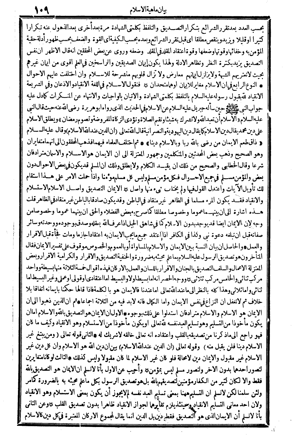 بِحَسب الْعدَد بعد تقرر الشَّرَائِع بتكرار التَّصْدِيق والتلفظ بكلمتي الشَّهَادَة مرّة بعد أُخْرَى بعد الذهول عَنهُ تَكْرَارا كثيرا أَو قَلِيلا وَيزِيد وَينْقص مُطلقًا أَي قبل تقرر الشَّرَائِع وَبعده بِحَسب الْكَيْفِيَّة أَي الْقُوَّة والضعف بِحَسب ظُهُور أَدِلَّة حقية الْمُؤمن بِهِ وخفائها وقوتها وضعفها وَقُوَّة اعْتِقَاد الْمُقَلّد فِي الْمُقَلّد وَضَعفه وروى عَن بعض الْمُحَقِّقين أَنه قَالَ الْأَظْهر أَن نفس التَّصْدِيق يزِيد بِكَثْرَة النّظر وتظاهر الْأَدِلَّة وَلِهَذَا يكون إِيمَان الصديقين والراسخين فِي الْعلم أقوى من إِيمَان غَيرهم بِحَيْثُ لَا تعتريهم الشُّبْهَة وَلَا يزلزل إِيمَانهم معَارض وَلَا تزَال قُلُوبهم منشرحة لِلْإِسْلَامِ وَإِن اخْتلفت عَلَيْهِم الْأَحْوَال النَّوْع الرَّابِع فِي أَن الْإِسْلَام مُغَاير للْإيمَان أَو هما متحدان فَنَقُول الْإِسْلَام فِي اللُّغَة الانقياد والإذعان وَفِي الشَّرِيعَة الانقياد لله بِقبُول رَسُوله صلى الله عَلَيْهِ وَسلم بالتلفظ بكلمتي الشَّهَادَة والإتيان بالواجبات والانتهاء عَن الْمُنْكَرَات كَمَا دلّ عَلَيْهِ جَوَاب النَّبِي صلى الله عَلَيْهِ وَسلم حِين سَأَلَهُ جِبْرِيل عَلَيْهِ السَّلَام عَن الْإِسْلَام فِي الحَدِيث الَّذِي رَوَاهُ أَبُو هُرَيْرَة رَضِي الله عَنهُ حَيْثُ قَالَ النَّبِي صلى الله عَلَيْهِ وَسلم الْإِسْلَام أَن تعبد الله وَلَا تشرك بِهِ شَيْئا وتقيم الصَّلَاة وَتُؤَدِّي الزَّكَاة الْمَفْرُوضَة وتصوم رَمَضَان وَيُطلق الْإِسْلَام على دين مُحَمَّد يُقَال دين الْإِسْلَام كَمَا يُقَال دين الْيَهُودِيَّة والنصرانية قَالَ الله تَعَالَى {إِن الدّين عِنْد الله الْإِسْلَام} وَقَالَ صلى الله عَلَيْهِ وَسلم ذاق طعم الْإِيمَان من رَضِي بِاللَّه رَبًّا وَبِالْإِسْلَامِ دينا ثمَّ اخْتلف الْعلمَاء فيهمَا فَذهب الْمُحَقِّقُونَ إِلَى أَنَّهُمَا متغايران وَهُوَ الصَّحِيح وَذهب بعض الْمُحدثين والمتكلمين وَجُمْهُور الْمُعْتَزلَة إِلَى أَن الْإِيمَان هُوَ الْإِسْلَام والإسمان مُتَرَادِفَانِ شرعا وَقَالَ الْخطابِيّ وَالصَّحِيح من ذَلِك أَن يُقيد الْكَلَام وَلَا يُطلق وَذَلِكَ أَن الْمُسلم قد يكون فِي بعض الْأَحْوَال دون بعض وَالْمُؤمن مُسلم فِي جَمِيع الْأَحْوَال فَكل مُؤمن مُسلم وَلَيْسَ كل مُسلم مُؤمنا وَإِذا حملت الْأَمر على هَذَا استقام لَك تَأْوِيل الْآيَات واعتدل القَوْل فِيهَا وَلم يخْتَلف شَيْء مِنْهَا وأصل الْإِيمَان التَّصْدِيق وأصل الْإِسْلَام الاستسلام والانقياد فقد يكون الْمَرْء مُسلما فِي الظَّاهِر غير منقاد فِي الْبَاطِن وَقد يكون صَادِقا بالباطن غير منقاد فِي الظَّاهِر قلت هَذِه إِشَارَة إِلَى أَن بَينهمَا عُمُوما وخصوصا مُطلقًا كَمَا صرح بِهِ بعض الْفُضَلَاء وَالْحق أَن بَينهمَا عُمُوما وخصوصا من وَجه لِأَن الْإِيمَان أَيْضا قد يُوجد بِدُونِ الْإِسْلَام كَمَا فِي شَاهِق الْجَبَل إِذا عرف الله بعقله وَصدق بِوُجُودِهِ ووحدته وَسَائِر صِفَاته قبل أَن تبلغه دَعْوَة نَبِي وَكَذَا فِي الْكَافِر إِذا اعْتقد جَمِيع مَا يجب الْإِيمَان بِهِ اعتقادا جَازِمًا وَمَات فَجْأَة قبل الْإِقْرَار وَالْعَمَل وَالْحَاصِل أَن بَيَان النِّسْبَة بَين الْإِيمَان وَالْإِسْلَام بالمساواة أَو بِالْعُمُومِ وَالْخُصُوص مَوْقُوف على تَفْسِير الْإِيمَان فَقَالَ الْمُتَأَخّرُونَ هُوَ تَصْدِيق الرَّسُول صلى الله عَلَيْهِ وَسلم بِمَا علم مَجِيئه بِهِ ضَرُورَة وَالْحَنَفِيَّة التَّصْدِيق وَالْإِقْرَار والكرامية الْإِقْرَار وَبَعض الْمُعْتَزلَة الْأَعْمَال وَالسَّلَف التَّصْدِيق بالجنان وَالْإِقْرَار بِاللِّسَانِ وَالْعَمَل بالأركان فَهَذِهِ أَقْوَال خَمْسَة الثَّلَاثَة مِنْهَا بسيطة وَوَاحِد مركب ثنائي وَالْخَامِس مركب ثلاثي وَوجه ا