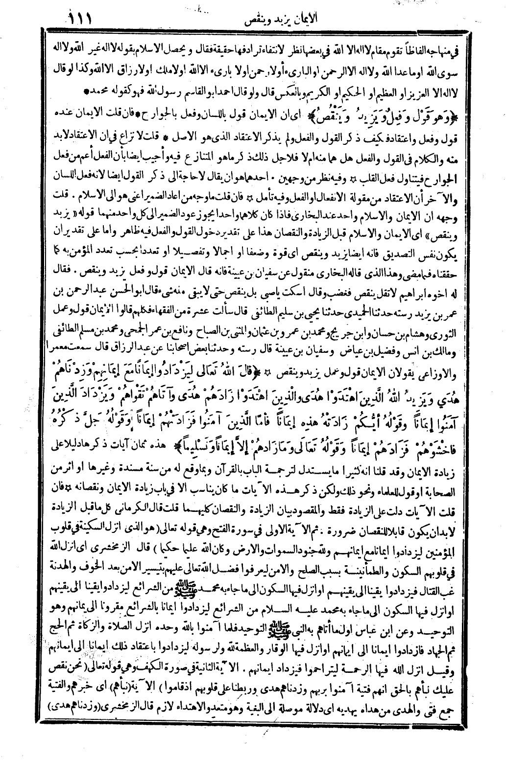 فِي منهاجه ألفاظا تقوم مقَام لَا إِلَه إِلَّا الله فِي بَعْضهَا نظر لانْتِفَاء ترادفها حَقِيقَة فَقَالَ وَيحصل الْإِسْلَام بقوله لَا إِلَه غير الله وَلَا إِلَه سوى الله أَو مَا عدا الله وَلَا إِلَه إِلَّا الرَّحْمَن أَو الباريء أَو لَا رَحْمَن أَو لَا باريء إِلَّا الله أَو لَا ملك أَو لَا رَازِق إِلَّا الله وَكَذَا لَو قَالَ لَا إِلَه إِلَّا الْعَزِيز أَو الْعَظِيم أَو الْحَكِيم أَو الْكَرِيم وَبِالْعَكْسِ قَالَ وَلَو قَالَ أَحْمد أَبُو الْقَاسِم رَسُول الله فَهُوَ كَقَوْلِه مُحَمَّد (وَهُوَ قَول وَفعل وَيزِيد وَينْقص) أَي أَن الْإِيمَان قَول بِاللِّسَانِ وَفعل بالجوارح فَإِن قلت الْإِيمَان عِنْده قَول وَفعل واعتقاد فَكيف ذكر القَوْل وَالْفِعْل وَلم يذكر الِاعْتِقَاد الَّذِي هُوَ الأَصْل قلت لَا نزاع فِي أَن الِاعْتِقَاد لَا بُد مِنْهُ وَالْكَلَام فِي القَوْل وَالْفِعْل هَل هما مِنْهُ أم لَا فَلَا جلّ ذَلِك ذكر مَا هُوَ الْمُتَنَازع فِيهِ وَأجِيب أَيْضا بِأَن الْفِعْل أَعم من فعل الْجَوَارِح فَيتَنَاوَل فعل الْقلب وَفِيه نظر من وَجْهَيْن أَحدهمَا هُوَ أَن يُقَال لَا حَاجَة إِلَى ذكر القَوْل أَيْضا لِأَنَّهُ فعل اللِّسَان وَالْآخر أَن الِاعْتِقَاد من مقولة الانفعال أَو الْفِعْل وَفِيه تَأمل فَإِن قلت مَا وَجه من أعَاد الضَّمِير أَعنِي هُوَ إِلَى الْإِسْلَام قلت وَجهه أَن الْإِيمَان وَالْإِسْلَام وَاحِد عِنْد البُخَارِيّ فَإِذا كَانَ كِلَاهُمَا وَاحِدًا يجوز عود الضَّمِير إِلَى كل وَاحِد مِنْهُمَا قَوْله يزِيد وَينْقص أَي الْإِيمَان وَالْإِسْلَام قبل الزِّيَادَة وَالنُّقْصَان هَذَا على تَقْدِير دُخُول القَوْل وَالْفِعْل فِيهِ ظَاهر وَأما على تَقْدِير أَن يكون نفس التَّصْدِيق فَإِنَّهُ أَيْضا يزِيد وَينْقص أَي قُوَّة وضعفا أَو إِجْمَالا وتفصيلا أَو تعدادا بِحَسب تعدد الْمُؤمن بِهِ كَمَا حققناه فَمَا مضى وَهَذَا الَّذِي قَالَه البُخَارِيّ مَنْقُول عَن سُفْيَان بن عُيَيْنَة فَإِنَّهُ قَالَ الْإِيمَان قَول وَفعل يزِيد وَينْقص فَقَالَ لَهُ أَخُوهُ إِبْرَاهِيم لَا تقل ينقص فَغَضب وَقَالَ اسْكُتْ يَا صبي بل ينقص حَتَّى لَا يبْقى مِنْهُ شَيْء قَالَ أَبُو الْحسن عبد الرَّحْمَن بن عمر بن يزِيد رسته حَدثنَا الْحميدِي حَدثنِي يحيى بن سليم الطَّائِفِي قَالَ سَأَلت عشرَة من الْفُقَهَاء فكلهم قَالُوا الْإِيمَان قَول وَعمل الثَّوْريّ وَهِشَام بن حسان وَابْن جريج وَمُحَمّد بن عَمْرو بن عُثْمَان والمثنى بن الصَّباح وَنَافِع بن عمر الجُمَحِي وَمُحَمّد بن مُسلم الطَّائِفِي وَمَالك بن أنس وفضيل بن عِيَاض وسُفْيَان بن عُيَيْنَة قَالَ رسته وَحدثنَا بعض أَصْحَابنَا عَن عبد الرَّزَّاق قَالَ سَمِعت معمرا وَالْأَوْزَاعِيّ يَقُولَانِ الْإِيمَان قَول وَعمل يزِيد وَينْقص قَالَ الله تَعَالَى {ليزدادوا إِيمَانًا مَعَ إِيمَانهم وزدناهم هدى وَيزِيد الله الَّذِي اهتدوا هدى وَالَّذين اهتدوا زادهم هدى وآتاهم تقواهم ويزداد الَّذين آمنُوا إِيمَانًا} وَقَوله {أَيّكُم زادته هَذِه إِيمَانًا فَأَما الَّذين آمنُوا فزادتهم إِيمَانًا} وَقَوله جلّ ذكره {فَاخْشَوْهُمْ فَزَادَهُم إِيمَانًا} وَقَوله تَعَالَى {وَمَا زادهم إِلَّا إِيمَانًا وتسليما} هَذِه ثَمَان آيَات ذكرهَا دَلِيلا على زِيَادَة الْإِيمَان وَقد قُلْنَا أَنه كثيرا مَا يسْتَدلّ لترجمة الْبَاب بِالْقُرْآنِ وَبِمَا وَقع لَهُ من سنة مُسندَة وَغَيرهَا أَو أثر من الصَّحَابَة أَو قَول للْعُلَمَاء وَنَحْو ذَلِك وَلَكِن ذكر هَذِه الْآيَات مَا كَانَ يُنَاسب إِلَّا فِي بَاب زِيَادَة الْإِيمَان ونقصانه فَإِن قلت الْآيَات دلّت على الزِّيَادَة فَقَط وَالْمَقْصُود بَيَان الزِّيَادَة وَالنُّقْصَان كليهمَا قلت قَالَ الْكرْمَانِي كل مَا قبل الزِّيَادَة لَا بُد أَن يكون قَابلا للنقصان ضَرُو