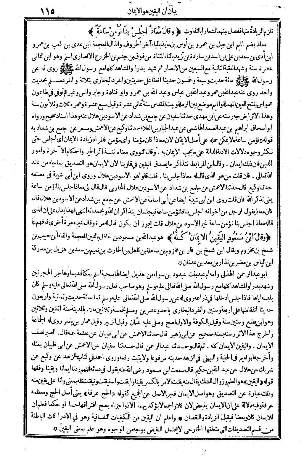 تلْزم الزِّيَادَة مِنْهَا ففصل بَينهمَا إشعارا بالتفاوت (وَقَالَ معَاذ اجْلِسْ بِنَا نؤمن سَاعَة) معَاذ بِضَم الْمِيم ابْن جبل بن عَمْرو بن أَوْس بن عايذ بِالْيَاءِ آخر الْحُرُوف والذال الْمُعْجَمَة ابْن عدي بن كَعْب بن عَمْرو بن أدّى بن سعد بن عَليّ بن أَسد بن ساردة بن تزيد بِالتَّاءِ الْمُثَنَّاة من فَوق بن جشم بن الْخَزْرَج الْأنْصَارِيّ أسم وَهُوَ ابْن ثَمَانِي عشرَة سنة وَشهد الْعقبَة الثَّانِيَة مَعَ السّبْعين من الْأَنْصَار ثمَّ شهد بَدْرًا والمشاهد كلهَا مَعَ رَسُول الله صلى الله عَلَيْهِ وَسلم رُوِيَ لَهُ عَن رَسُول الله صلى الله عَلَيْهِ وَسلم مائَة حَدِيث وَسَبْعَة وَخَمْسُونَ حَدِيثا اتفقَا على حديثين وَانْفَرَدَ البُخَارِيّ بِثَلَاثَة وَانْفَرَدَ مُسلم بِحَدِيث وَاحِد روى عَنهُ عبد الله بن عمر وَعبد الله بن عَبَّاس وَعبد الله بن عَمْرو وَأَبُو قَتَادَة وَجَابِر وَأنس وَغَيرهم توفّي فِي طاعون عمواس بِفَتْح الْعين الْمُهْملَة وَالْمِيم مَوضِع بَين الرملة وَبَيت الْمُقَدّس سنة ثَمَانِي عشرَة وَقيل سبع عشرَة وعمره ثَلَاث وَثَلَاثُونَ سنة وَهَذَا الْأَثر أخرجه رسته عَن ابْن مهْدي حَدثنَا سُفْيَان عَن جَامع بن شَدَّاد عَن الْأسود بن هِلَال عَنهُ وَهَذَا إِسْنَاد صَحِيح وَرَوَاهُ أَبُو إِسْحَاق إِبْرَاهِيم بن عبد الصَّمد الْهَاشِمِي عَن عبد الْجَبَّار بن الْعَلَاء حَدثنَا وَكِيع عَن الْأَعْمَش ومسعر عَن جَامع بن شَدَّاد بِهِ قَوْله نؤمن سَاعَة لَا يُمكن حمله على أصل الْإِيمَان لِأَن معَاذًا كَانَ مُؤمنا وَأي مُؤمن فَالْمُرَاد زِيَادَة الْإِيمَان أَي اجْلِسْ حَتَّى نكثر وُجُوه دلالات الْأَدِلَّة الدَّالَّة على مَا يجب الْإِيمَان بِهِ وَقَالَ النَّوَوِيّ مَعْنَاهُ نتذاكر الْخَيْر وَأَحْكَام الْآخِرَة وَأُمُور الدّين فَإِن ذَلِك إِيمَان وَقَالَ ابْن المرابط نتذاكر مَا يصدق الْيَقِين فِي قُلُوبنَا لِأَن الْإِيمَان هُوَ التَّصْدِيق بِمَا جَاءَ من عِنْد الله تَعَالَى فَإِن قلت من هُوَ الَّذِي قَالَ لَهُ معَاذ اجْلِسْ بِنَا قلت قَالُوا هُوَ الْأسود بن هِلَال وروى ابْن أبي شيبَة فِي مُصَنفه حَدثنَا وَكِيع قَالَ حَدثنَا الْأَعْمَش عَن جَامع بن شَدَّاد عَن الْأسود بن هِلَال الْمحَاربي قَالَ قَالَ لي معَاذ اجْلِسْ بِنَا نؤمن سَاعَة يَعْنِي نذْكر الله فَإِن قلت روى ابْن أبي شيبَة أَيْضا عَن أبي أُسَامَة عَن الْأَعْمَش عَن جَامع بن شَدَّاد عَن الْأسود بن هِلَال قَالَ كَانَ معَاذ يَقُول لرجل من إخوانه اجْلِسْ بِنَا فلنؤمن سَاعَة فيجلسان يتذاكران الله ويحمدانه انْتهى فَهَذَا يدل على أَن الَّذِي قَالَه معَاذ اجْلِسْ بِنَا نؤمن سَاعَة غير الْأسود بن هِلَال قلت يجوز أَن يكون قَالَ لَهُ مرّة وَقَالَ لغيره مرّة أُخْرَى فَافْهَم (وَقَالَ ابْن مَسْعُود الْيَقِين الْإِيمَان كُله) هُوَ عبد الله بن مَسْعُود بن غافل بالغين الْمُعْجَمَة وَالْفَاء ابْن حبيب بن شمخ بن مَخْزُوم وَيُقَال ابْن شمخ بن فار بن مَخْزُوم بن صاهلة بن كَاهِل بن الْحَارِث بن تَمِيم بن سعد بن هزيل بن مدركة بن الياس بن مُضر بن نذار بن معد بن عدنان أَبُو عبد الرَّحْمَن الْهُذلِيّ وَأمه أم عبد بنت عبدود بن سَوَاء من هُذَيْل أَيْضا لَهَا صُحْبَة أسلم بِمَكَّة قَدِيما وَهَاجَر الهجرتين وَشهد بَدْرًا والمشاهد كلهَا مَعَ رَسُول الله صلى الله عَلَيْهِ وَسلم وَهُوَ صَاحب نعل رَسُول الله صلى الله عَلَيْهِ وَسلم كَانَ يلْبسهُ إِيَّاهَا فَإِذا جلس أدخلها فِي ذراعه روى لَهُ عَن رَسُول الله صلى الله عَلَيْهِ وَسلم ثَمَانمِائَة حَدِيث وَثَمَانِية وَأَرْبَعُونَ حَدِيثا اتفقَا مِنْهَا على أَرْبَعَة وَسِتِّينَ وَانْفَرَدَ البُخَارِيّ بِأحد وَعشْرين وَمُسلم بِخَمْسَة وَثَلَاثِينَ مَاتَ بِالْمَدِينَةِ سنة اثْنَتَيْنِ وَثَلَاثِينَ وَهُوَ ابْن بضع وَسِتِّينَ سنة وَق