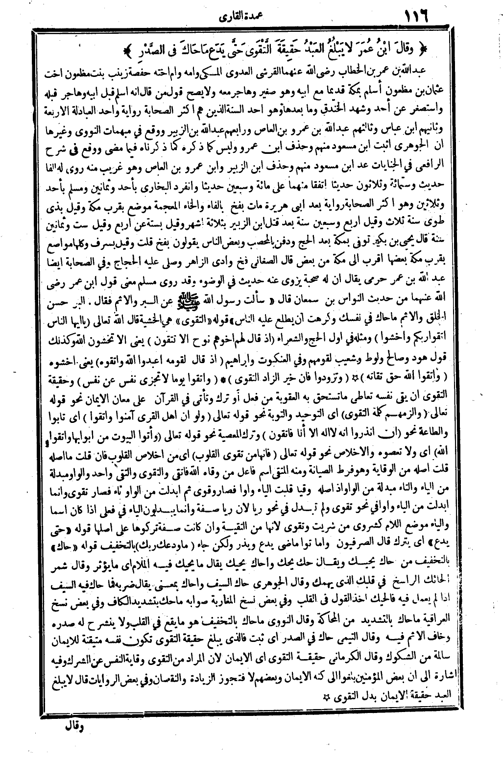 (وَقَالَ ابْن عمر لَا يبلغ العَبْد حَقِيقَة التَّقْوَى حَتَّى يدع مَا حاك فِي الصَّدْر) عبد الله بن عمر بن الْخطاب رَضِي الله عَنْهُمَا الْقرشِي الْعَدو الْمَكِّيّ وَأمه وَأم أُخْته حَفْصَة زَيْنَب بنت مَظْعُون أُخْت عُثْمَان بن مَظْعُون أسلم بِمَكَّة قَدِيما مَعَ أَبِيه وَهُوَ صَغِير وَهَاجَر مَعَه وَلَا يَصح قَول من قَالَ أَنه أسلم قبل أَبِيه وَهَاجَر قبله واستصغر عَن أحد وَشهد الخَنْدَق وَمَا بعْدهَا وَهُوَ أحد السِّتَّة الَّذين هم أَكثر الصَّحَابَة رِوَايَة وَأحد العبادلة الْأَرْبَعَة وثانيهم ابْن عَبَّاس وثالثهم عبد الله بن عَمْرو بن الْعَاصِ ورابعهم عبد الله بن الزبير وَوَقع فِي مبهمات النَّوَوِيّ وَغَيرهَا أَن الْجَوْهَرِي أثبت ابْن مَسْعُود مِنْهُم وَحذف ابْن عَمْرو وَلَيْسَ كَمَا ذكره كَمَا ذَكرْنَاهُ فِيمَا مضى وَوَقع فِي شرح الرَّافِعِيّ فِي الْجِنَايَات عد ابْن مَسْعُود مِنْهُم وَحذف ابْن الزبير وَابْن عَمْرو بن الْعَاصِ وَهُوَ غَرِيب مِنْهُ روى لَهُ ألفا حَدِيث وسِتمِائَة وَثَلَاثُونَ حَدِيثا اتفقَا مِنْهُمَا على مائَة وَسبعين حَدِيثا وَانْفَرَدَ البُخَارِيّ بِأحد وَثَمَانِينَ وَمُسلم بِأحد وَثَلَاثِينَ وَهُوَ أَكثر الصَّحَابَة رِوَايَة بعد أبي هُرَيْرَة مَاتَ بفخ بِالْفَاءِ وَالْخَاء الْمُعْجَمَة مَوضِع بِقرب مَكَّة وَقيل بِذِي طوى سنة ثَلَاث وَقيل أَربع وَسبعين سنة بعد قتل ابْن الزبير بِثَلَاثَة أشهر وَقيل بِسِتَّة عَن أَربع وَقيل سِتّ وَثَمَانِينَ سنة قَالَ يحيى بن بكير توفّي بِمَكَّة بعد الْحَج وَدفن بالمحصب وَبَعض النَّاس يَقُولُونَ بفخ قلت وَقيل بسرف وَكلهَا مَوَاضِع بِقرب مَكَّة بَعْضهَا أقرب إِلَى مَكَّة من بعض قَالَ الصغاني فخ وَادي الزَّاهِر وَصلى عَلَيْهِ الْحجَّاج وَفِي الصَّحَابَة أَيْضا عبد الله بن عمر حرمي يُقَال أَن لَهُ صُحْبَة يرْوى عَنهُ حَدِيث فِي الْوضُوء وَقد روى مُسلم معنى قَول ابْن عمر رَضِي الله عَنْهُمَا من حَدِيث النواس بن سمْعَان قَالَ سَأَلت رَسُول الله صلى الله عَلَيْهِ وَسلم عَن الْبر وَالْإِثْم فَقَالَ الْبر حسن الْخلق وَالْإِثْم مَا حاك فِي نَفسك وكرهت أَن يطلع عَلَيْهِ النَّاس قَوْله التَّقْوَى هِيَ الخشية قَالَ الله تَعَالَى {يَا أَيهَا النَّاس اتَّقوا ربكُم واخشوا} وَمثله فِي أول الْحَج وَالشعرَاء {إِذْ قَالَ لَهُم أخوهم نوح أَلا تَتَّقُون} يَعْنِي أَلا تخشون الله وَكَذَلِكَ قَول هود وَصَالح وَلُوط وَشُعَيْب لقومهم وَفِي العنكبوت وَإِبْرَاهِيم {إِذْ قَالَ لقوم اعبدوا الله واتقوه} يَعْنِي اخشوه {وَاتَّقوا الله حق تُقَاته} {وتزودوا فَإِن خير الزَّاد التَّقْوَى} {وَاتَّقوا يَوْمًا لَا تجزي نفس عَن نفس} وَحَقِيقَة التَّقْوَى أَن يقي نَفسه تعَاطِي مَا تسْتَحقّ بِهِ الْعقُوبَة من فعل أَو ترك وَتَأْتِي فِي الْقُرْآن على معَان الْإِيمَان نَحْو قَوْله تَعَالَى {وألزمهم كلمة التَّقْوَى} أَي التَّوْحِيد وَالتَّوْبَة نَحْو قَوْله تَعَالَى {وَلَو أَن أهل الْقرى آمنُوا وَاتَّقوا} أَي تَابُوا وَالطَّاعَة نَحْو {أَن أنذروا أَنه لَا إِلَه إِلَّا أَنا فاتقون} وَترك الْمعْصِيَة نَحْو قَوْله تَعَالَى {وَأتوا الْبيُوت من أَبْوَابهَا وَاتَّقوا الله} أَي وَلَا تعصوه وَالْإِخْلَاص نَحْو قَوْله تَعَالَى {فَإِنَّهَا من تقوى الْقُلُوب} أَي من إخلاص الْقُلُوب فَإِن قلت مَا أَصله قلت أَصله من الْوِقَايَة وَهُوَ فرط الصيانة وَمِنْه المتقي اسْم فَاعل من وَقَاه الله فاتقى وَالتَّقوى والتقى وَاحِد وَالْوَاو مبدلة من الْيَاء وَالتَّاء مبدلة من الْوَاو إِذْ أَصله وقيا قلت الْيَاء واوا فَصَارَ وقوى ثمَّ أبدلت من الْوَاو تَاء فَصَارَ تقوى وَإِنَّمَا أبدلت من الْيَاء واوا فِي نَحْو تقوى وَلم تبدل فِي نَحْو ريا لِأَن ريا صفة وَإِنَّمَا يبدلون الْيَاء فِي فعلى إِذا كَانَ اسْما وَالْيَاء مَ