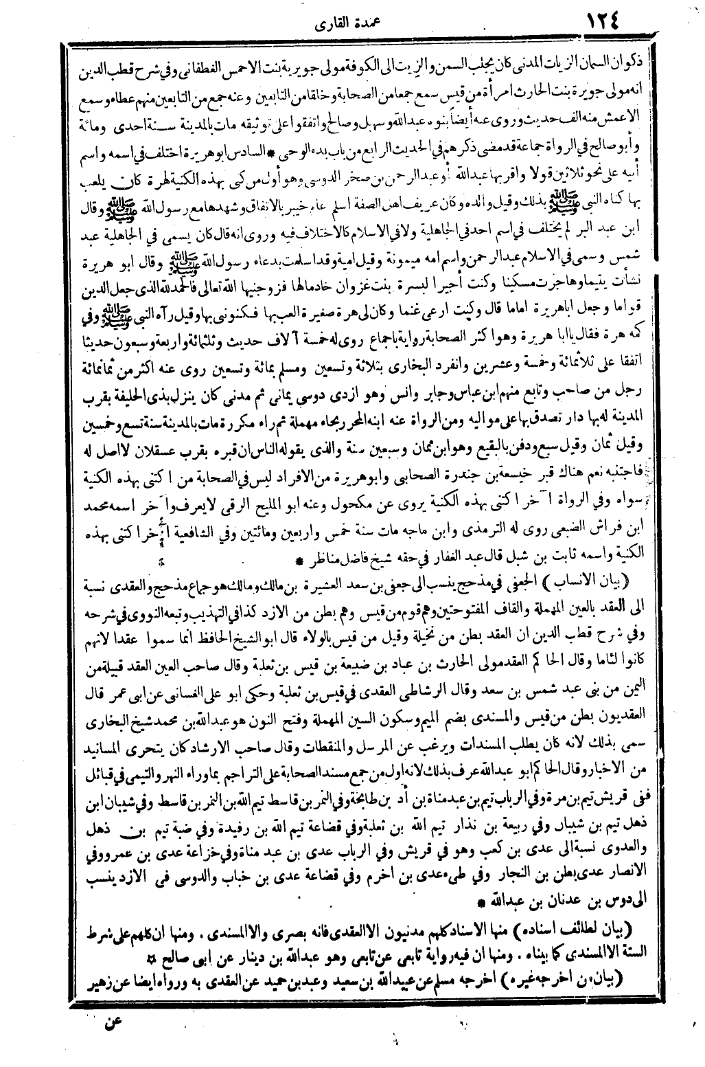 (بَيَان الْأَنْسَاب) الْجعْفِيّ: فِي مذْحج ينْسب إِلَى جعفي بن سعد الْعَشِيرَة بن مَالك: وَمَالك هُوَ جماع مذْحج، والعقدي نِسْبَة إِلَى العقد، بِالْعينِ الْمُهْملَة وَالْقَاف المفتوحتين، وهم قوم من قيس، وهم بطن من الأزد، كَذَا فِي (التَّهْذِيب) وَتَبعهُ النَّوَوِيّ فِي شَرحه، وَفِي شرح قطب الدّين: إِن العقد بطن من نخيلة، وَقيل: من قيس بِالْوَلَاءِ، قَالَ أَبُو الشَّيْخ الْحَافِظ: إِنَّمَا سموا عقدا لأَنهم كَانُوا لِئَامًا، وَقَالَ الْحَاكِم: العقد مولى الْحَارِث بن عباد بن ضبيعة بن قيس بن ثَعْلَبَة، وَقَالَ صَاحب (الْعين) : العقد قَبيلَة من الْيمن من بني عبد شمس بن سعد، وَقَالَ الرشاطي: الْعَقدي فِي قيس بن ثَعْلَبَة، وَحكى أَبُو عَليّ الغساني، عَن أبي عمر قَالَ: العقديون بطن من قيس؛ والمسندي، بِضَم الْمِيم وَسُكُون السِّين الْمُهْملَة وَفتح النُّون، هُوَ عبد الله بن مُحَمَّد شيخ البُخَارِيّ، سمي بذلك لِأَنَّهُ كَانَ يطْلب المسندات ويرغب عَن الْمُرْسل والمنقطات، وَقَالَ صَاحب (الْإِرْشَاد) : كَانَ يتحَرَّى المسانيد من الْأَخْبَار، وَقَالَ الْحَاكِم أَبُو عبد الله: عرف بذلك لِأَنَّهُ أول من جمع مُسْند الصَّحَابَة على التراجم بِمَا وَرَاء النَّهر؛ والتيمي فِي قبائل، فَفِي قُرَيْش: تيم بن مرّة، وَفِي الربَاب: تيم بن عبد مَنَاة بن أد بن طابخة، وَفِي النمر بن قاسط: تيم الله بن النمر بن قاسط، وَفِي شَيبَان ابْن ذهل: تيم بن شَيبَان، وَفِي ربيعَة بن نذار: تيم الله بن ثَعْلَبَة، وَفِي قضاعة: تيم الله بن رفيدة، وَفِي ضبة: تيم بن ذهل. والعدوي نِسْبَة إِلَى عدي بن كَعْب، وَهُوَ فِي قُرَيْش، وَفِي الربَاب: عدي بن عبد مَنَاة، وَفِي خُزَاعَة: عدي بن عَمْرو، وَفِي الْأَنْصَار: عدي بطن بن النجار، وَفِي طَيء: عدي بن أخرم، وَفِي قضاعة: عدي بن خباب، والدوسي فِي الأزد ينْسب إِلَى دوس بن عدنان بن عبد الله.