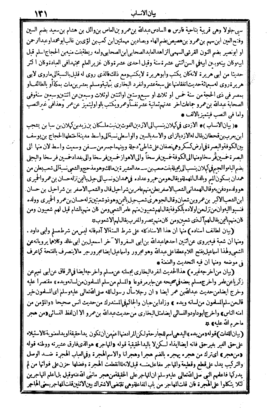 سبي جلولا، وَهِي قريبَة بِنَاحِيَة فَارس. السَّادِس: عبد الله بن عَمْرو بن الْعَاصِ بن وَائِل بن هِشَام بن سعيد، بِضَم السِّين وَفتح الْعين، ابْن سهم بن عَمْرو بن هصيص، بِضَم الْهَاء وبصادين مهملتين، ابْن كَعْب بن لؤَي بن غَالب، أَبُو مُحَمَّد أَو عبد الرَّحْمَن أَو أَبُو نصير، بِضَم النُّون، الْقرشِي السَّهْمِي الزَّاهِد العابد الصَّحَابِيّ ابْن الصَّحَابِيّ، وَأمه، ريطة بنت منيه بن الْحجَّاج، أسلم قبل أَبِيه وَكَانَ بَينه وَبَين أَبِيه فِي السن: اثْنَتَيْ عشرَة سنة، وَقيل: إِحْدَى عشرَة، وَكَانَ غزير الْعلم مُجْتَهدا فِي الْعِبَادَة، وَكَانَ أَكثر حَدِيثا من أبي هُرَيْرَة، لِأَنَّهُ كَانَ يكْتب وَأَبُو هُرَيْرَة لَا يكْتب، وَمَعَ ذَلِك فَالَّذِي رُوِيَ لَهُ قَلِيل بِالنِّسْبَةِ إِلَى مَا رُوِيَ لأبي هُرَيْرَة. رُوِيَ لَهُ سَبْعمِائة حَدِيث اتفقَا مِنْهَا على سَبْعَة عشر، وَانْفَرَدَ البُخَارِيّ بِثمَانِيَة، وَمُسلم بِعشْرين: مَاتَ بِمَكَّة أَو بِالطَّائِف أَو بِمصْر فِي ذِي الْحجَّة من سنة خمس أَو ثَلَاث أَو سبع وَسِتِّينَ، أَو اثْنَتَيْنِ أَو ثَلَاث وَسبعين، عَن اثْنَتَيْنِ وَسبعين سنة. وَفِي الصَّحَابَة عبد الله بن عَمْرو جماعات آخر عدتهمْ: ثَمَانِيَة عشر نفسا. وَعَمْرو، وَيكْتب بِالْوَاو ليتميز عَن عمر، وَهَذَا فِي غير النصب، وَأما فِي النصب فيتميز بِالْألف.