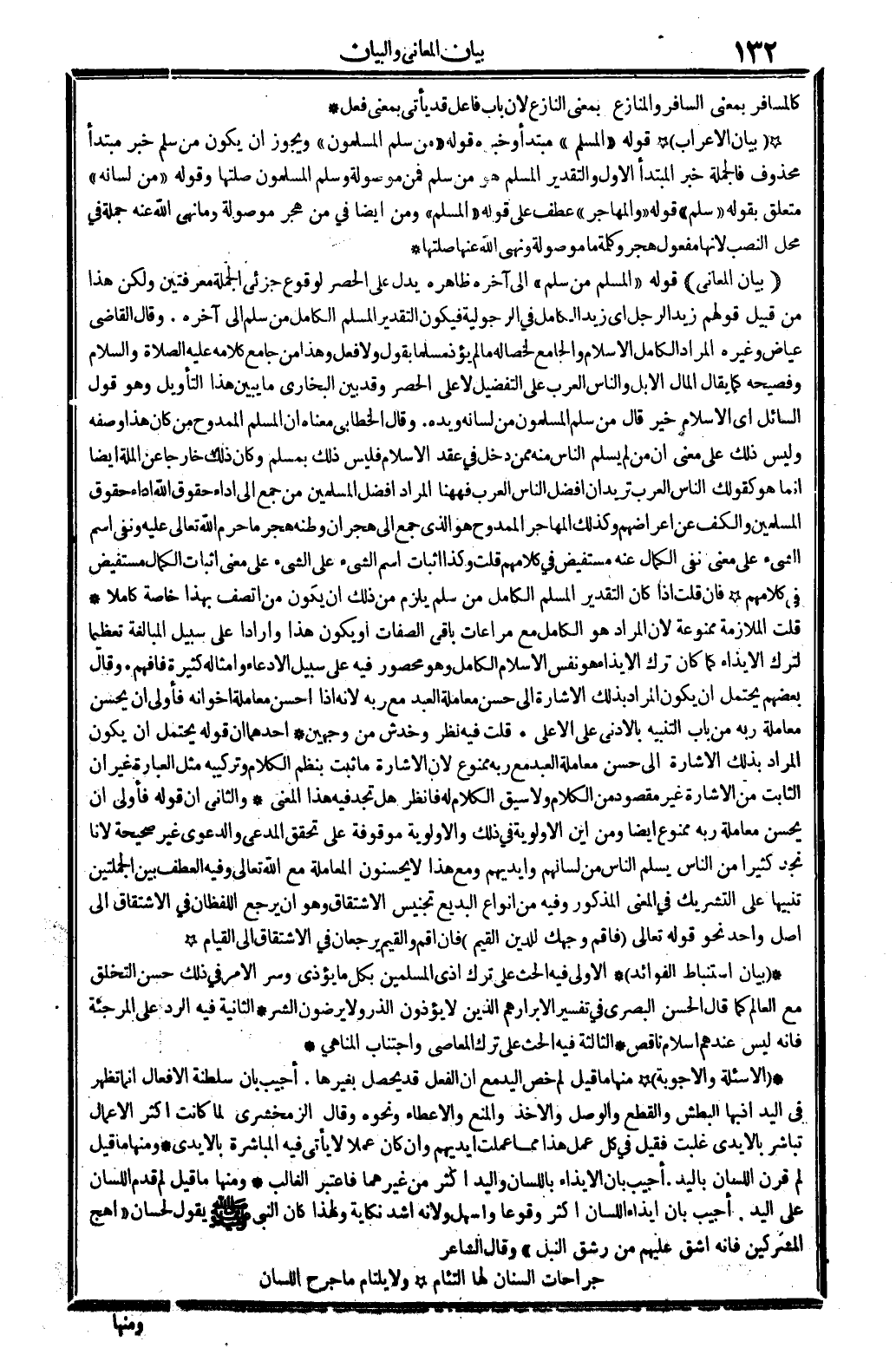 (بَيَان الْمعَانِي) : قَوْله: (الْمُسلم من سلم) إِلَى آخِره ظَاهره يدل على الْحصْر لوُقُوع جزئي الْجُمْلَة معرفتين، وَلَكِن هَذَا من قبيل قَوْلهم: زيد الرجل، أَي: زيد الْكَامِل فِي الرجولية، فَيكون التَّقْدِير: الْمُسلم الْكَامِل من سلم إِلَى آخِره. وَقَالَ القَاضِي عِيَاض وَغَيره: المُرَاد: الْكَامِل الْإِسْلَام وَالْجَامِع لخصاله مَا لم يؤذ مُسلما بقول وَلَا فعل، وَهَذَا من جَامع كَلَامه عَلَيْهِ الصَّلَاة وَالسَّلَام، وفصيحه كَمَا يُقَال: المَال الْإِبِل، وَالنَّاس الْعَرَب، على التَّفْضِيل لَا على الْحصْر، وَقد بَين البُخَارِيّ مَا يبين هَذَا التَّأْوِيل، وَهُوَ قَول السَّائِل: أَي الْإِسْلَام خير؟ قَالَ: من سلم الْمُسلمُونَ من لِسَانه وَيَده. وَقَالَ الْخطابِيّ: مَعْنَاهُ أَن الْمُسلم الممدوح من كَانَ هَذَا وَصفه، وَلَيْسَ ذَلِك على معنى أَن من لم يسلم النَّاس مِنْهُ مِمَّن دخل فِي عقد الْإِسْلَام فَلَيْسَ ذَلِك بِمُسلم، وَكَانَ ذَلِك خَارِجا عَن الْملَّة أَيْضا، إِنَّمَا هُوَ كَقَوْلِك: النَّاس الْعَرَب، تُرِيدُ أَن أفضل النَّاس الْعَرَب، فههنا المُرَاد أفضل الْمُسلمين من جمع إِلَى أَدَاء حُقُوق الله أَدَاء حُقُوق الْمُسلمين والكف عَن أعراضهم، وَكَذَلِكَ المُهَاجر الممدوح هُوَ الَّذِي جمع إِلَى هجران وَطنه مَا حرم الله تَعَالَى عَلَيْهِ، وَنفي اسْم الشَّيْء على معنى نفي الْكَمَال عَنهُ مستفيض فِي كَلَامهم. قلت: وَكَذَا إِثْبَات اسْم الشَّيْء على الشَّيْء على معنى إِثْبَات الْكَمَال مستفيض فِي كَلَامهم. فَإِن قلت: إِذا كَانَ التَّقْدِير: الْمُسلم الْكَامِل من سلم، يلْزم من ذَلِك أَن يكون من اتّصف بِهَذَا خَاصَّة كَامِلا. قلت: الْمُلَازمَة مَمْنُوعَة، لِأَن المُرَاد هُوَ الْكَامِل مَعَ مراعات بَاقِي الصِّفَات، أَو يكون هَذَا وارداً على سَبِيل الْمُبَالغَة تَعْظِيمًا لترك الْإِيذَاء، كَمَا كَانَ ترك الْإِيذَاء هُوَ نفس الْإِسْلَام الْكَامِل، وَهُوَ مَحْصُور فِيهِ على سَبِيل الإدعاء. وَأَمْثَاله كَثِيرَة. فَافْهَم. وَقَالَ بَعضهم: يحْتَمل أَن يكون المُرَاد بذلك الْإِشَارَة إِلَى حسن مُعَاملَة العَبْد مَعَ ربه، لِأَنَّهُ إِذا أحسن مُعَاملَة إخوانه فَأولى، أَن يحسن مُعَاملَة ربه، من بَاب التَّنْبِيه بالأدنى على الْأَعْلَى. قلت: فِيهِ نظر وخدش من وَجْهَيْن. أَحدهمَا: أَن قَوْله: يحْتَمل أَن يكون المُرَاد بذلك الْإِشَارَة إِلَى حسن مُعَاملَة العَبْد مَعَ ربه مَمْنُوع، لِأَن الْإِشَارَة مَا ثَبت بنظم الْكَلَام وتركيبه مثل الْعبارَة، غير أَن الثَّابِت من الْإِشَارَة غير مَقْصُود من الْكَلَام، وَلَا سيق الْكَلَام لَهُ فَانْظُر هَل تَجِد فِيهِ هَذَا الْمَعْنى؟ وَالثَّانِي: أَن قَوْله: فَأولى أَن يحسن مُعَاملَة ربه مَمْنُوع أَيْضا، وَمن أَيْن الْأَوْلَوِيَّة فِي ذَلِك، والأولوية مَوْقُوفَة على تحقق الْمُدَّعِي وَالدَّعْوَى غير صَحِيحَة، لأنَّا نجد كثيرا من النَّاس يسلم النَّاس من لسانهم وأيديهم، وَمَعَ هَذَا لَا يحسنون الْمُعَامَلَة مَعَ الله تَعَالَى؛ وَفِيه الْعَطف بَين الجملتين تَنْبِيها على التَّشْرِيك فِي الْمَعْنى الْمَذْكُور، وَفِيه من أَنْوَاع البديع: تجنيس الِاشْتِقَاق، وَهُوَ أَن يرجع اللفظان فِي الِاشْتِقَاق إِلَى أصل وَاحِد، نَحْو قَوْله تَعَالَى: {فاقم وَجهك للدّين الْقيم} (الرّوم: 43) فَإِن: أقِم والقيم، يرجعان فِي الِاشْتِقَاق إِلَى: الْقيام.