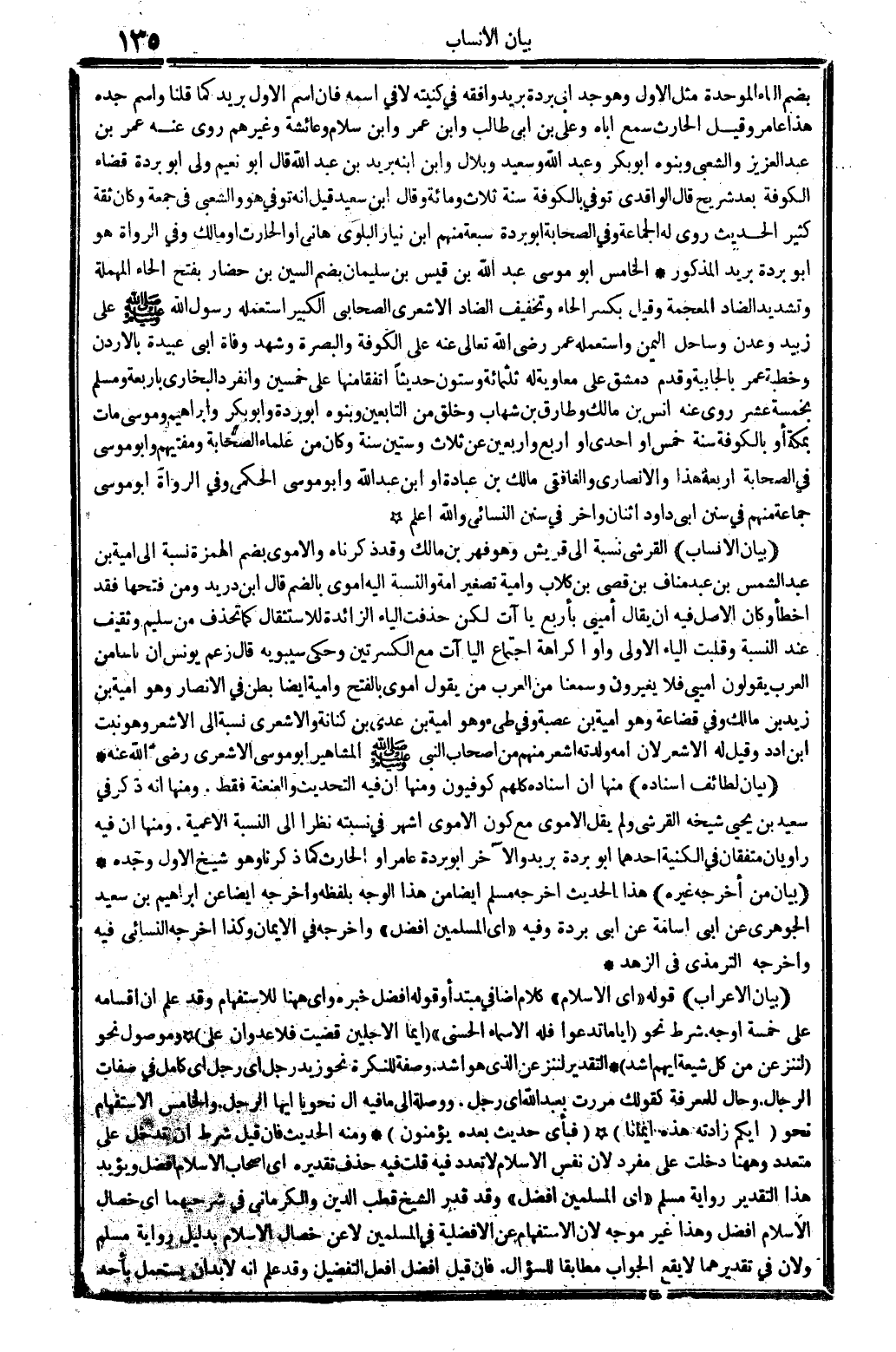 (بَيَان الْأَنْسَاب) الْقرشِي: نِسْبَة إِلَى قُرَيْش، وَهُوَ فهر بن مَالك، وَقد ذَكرْنَاهُ. والأموي، بِضَم الْهمزَة، نِسْبَة إِلَى أُميَّة بن عبد شمس بن عبد منَاف بن قصي بن كلاب، وَأُميَّة تَصْغِير: أمة. وَالنِّسْبَة إِلَيْهِ: أموي، بِالضَّمِّ، قَالَ ابْن دُرَيْد: وَمن فتحهَا فقد أَخطَأ، وَكَانَ الأَصْل فِيهِ أَن يُقَال: أميي، بِأَرْبَع ياآت، لَكِن حذفت الْيَاء الزَّائِدَة للاستثقال، كَمَا تحذف من سليم وَثَقِيف عِنْد النِّسْبَة، وقلبت الْيَاء الأولى واواً كَرَاهَة اجْتِمَاع الياآت مَعَ الكسرتين. وَحكى سِيبَوَيْهٍ قَالَ: زعم يُونُس أَن نَاسا من الْعَرَب يَقُولُونَ أميي، فَلَا يغيرون. وَسَمعنَا من الْعَرَب من يَقُول: أموي بِالْفَتْح، وَأُميَّة أَيْضا بطن من الانصار، وَهُوَ أُميَّة بن زيد بن مَالك، وَفِي قضاعة وَهُوَ: أُميَّة بن عصبَة، وَفِي طَيء وَهُوَ: أُميَّة بن عدي بن كنَانَة، والأشعري: نِسْبَة إِلَى الْأَشْعر، وَهُوَ نبت بن ادد، وَقيل لَهُ: الْأَشْعر، لِأَن أمه وَلدته أشعر، مِنْهُم من أَصْحَاب النَّبِي صلى الله عَلَيْهِ وَسلم الْمَشَاهِير: أَبُو مُوسَى الْأَشْعَرِيّ رَضِي الله عَنهُ.