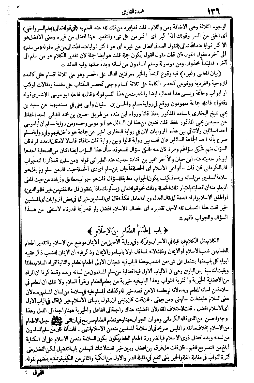(بَيَان الْمعَانِي وَغَيره) فِيهِ وُقُوع الْمُبْتَدَأ وَالْخَبَر معرفتين الدَّال على الْحصْر، وَهُوَ على ثَلَاثَة أَقسَام: عَقْلِي: كالعدد للزوجية والفردية، ووقوعي: كحصر الْكَلِمَة على ثَلَاثَة أَقسَام، وجعلي: كحصر الْكتاب على مُقَدّمَة ومقالات أَو كتب أَو أَبْوَاب وخاتمة، وَيُسمى هَذَا: ادعائياً أَيْضا. والْحَدِيث من هَذَا الْقسم. قَوْله: (قَالَ) فَاعله أَبُو مُوسَى الْأَشْعَرِيّ؛ قَوْله: (قَالُوا) فَاعله جمَاعَة معهودون، وَوَقع فِي رِوَايَة مُسلم وَالْحسن بن سُفْيَان وَأبي يعلى فِي (مسنديهما) عَن سعيد بن يحيى شيخ البُخَارِيّ بِإِسْنَادِهِ الْمَذْكُور، بِلَفْظ: قُلْنَا وَرَوَاهُ ابْن مَنْدَه من طَرِيق حُسَيْن بن مُحَمَّد القباني، أحد الْحفاظ عَن سعيد بن يحيى الْمَذْكُور بِلَفْظ: قلت، فَتعين من هَذَا أَن السَّائِل هُوَ أَبُو مُوسَى وَحده. وَمن رِوَايَة مُسلم أَن أَبَا مُوسَى أحد السَّائِلين، وَلَا تنَافِي بَين هَذِه الرِّوَايَات، لِأَن فِي رِوَايَة البُخَارِيّ أخبر عَن جمَاعَة هُوَ دَاخل فيهم، وَفِي رِوَايَة مُسلم صرح بِأَنَّهُ أحد الْجَمَاعَة السَّائِلين. فَإِن قلت: بَين رِوَايَة: قَالُوا، وَبَين رِوَايَة: قلت، مُنَافَاة. قلت: لَا لِإِمْكَان التَّعَدُّد، فَمرَّة كَانَ السُّؤَال مِنْهُم فَحكى سُؤَالهمْ، وَمرَّة كَانَ مِنْهُ فَحكى سُؤال نَفسه، وَقد سَأَلَ هَذَا السُّؤَال أَيْضا اثْنَان من الصَّحَابَة، أَحدهمَا: أَبُو ذَر، حَدِيثه عِنْد ابْن حبَان، وَالْآخر: عُمَيْر بن قَتَادَة، حَدِيثه عِنْد الطَّبَرَانِيّ. قَوْله: (من سلم) قد ذكرنَا أَنه جَوَاب. قَالَ الْكرْمَانِي: فَإِن قلت: سَأَلُوا عَن الْإِسْلَام أَي: الْخصْلَة. فَأجَاب: بِمن سلم أَي: ذِي الْخصْلَة، حَيْثُ قَالَ: من سلم، وَلم يقل: هُوَ سَلامَة الْمُسلمين من لِسَانه وَيَده، فَكيف يكون الْجَواب مطابقاً للسؤال؟ قلت: هُوَ جَوَاب مُطَابق وَزِيَادَة من حَيْثُ الْمَعْنى، إِذْ يعلم مِنْهُ أَن أفضليته بِاعْتِبَار تِلْكَ الْخصْلَة، وَذَلِكَ نَحْو قَوْله تَعَالَى: {يَسْأَلُونَك مَاذَا يُنْفقُونَ قل مَا أنفقتم من خير فللوالدين} (الْبَقَرَة: 215) أَو أطلق الْإِسْلَام، وَأَرَادَ الصّفة كَمَا يُقَال الْعدْل وَيُرَاد الْعَادِل، فَكَأَنَّهُ قَالَ: أَي الْمُسلمين خير، كَمَا فِي بعض الرِّوَايَات: أَي الْمُسلمين خير؟ قلت: هَذَا التعسف كُله لأجل تَقْدِيره: أَي خِصَال الْإِسْلَام أفضل؟ وَلَو قدر بِمَا قدرناه لاستغنى عَن هَذَا السُّؤَال وَالْجَوَاب. فَافْهَم.