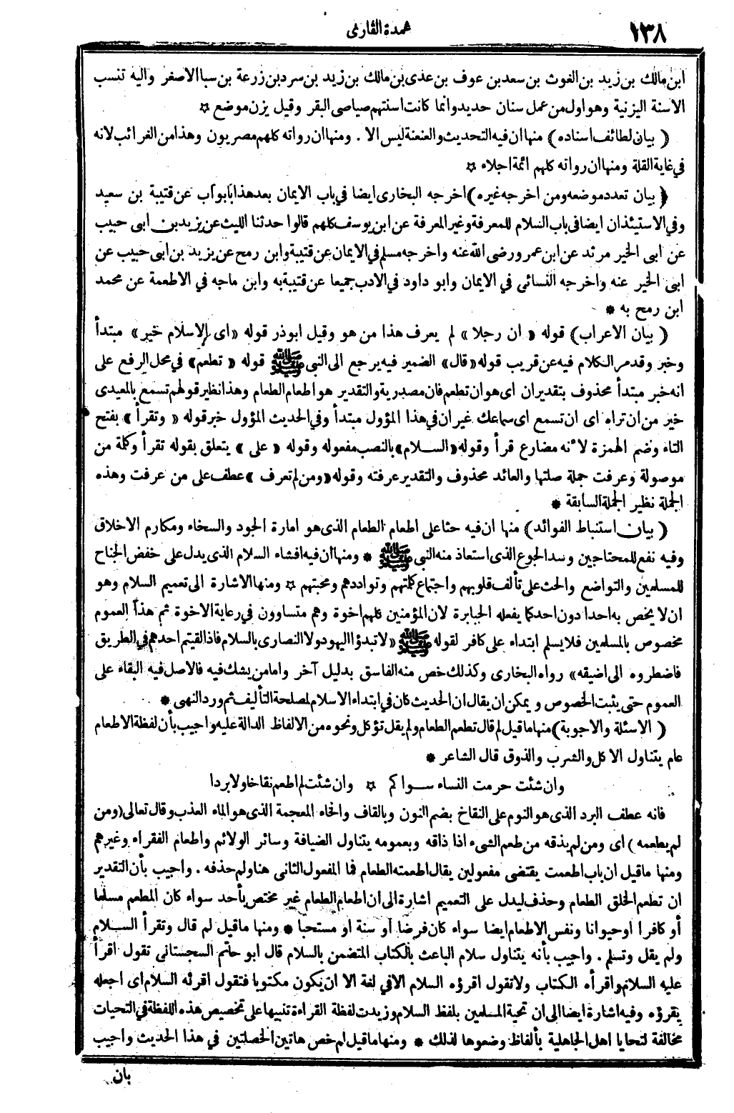 (بَيَان الْإِعْرَاب) : قَوْله: (أَن رجلا) لم يعرف هَذَا من هُوَ، وَقيل: أَبُو ذَر. قَوْله: (أَي الْإِسْلَام خير) ؟ مُبْتَدأ وَخبر، وَقد مر الْكَلَام فِيهِ عَن قريب. قَوْله: (قَالَ) الضَّمِير فِيهِ يرجع إِلَى النَّبِي صلى الله عَلَيْهِ وَسلم. قَوْله: (تطعم) فِي مَحل الرّفْع على أَنه خبر مُبْتَدأ مَحْذُوف بِتَقْدِير: أَن، أَي هُوَ أَن تطعم، فَإِن مَصْدَرِيَّة، وَالتَّقْدِير: هُوَ إطْعَام الطَّعَام. وَهَذَا نَظِير قَوْلهم: تسمع بالمعيدي خير من أَن ترَاهُ، أَي: أَن تسمع، أَي: سماعك، غير أَن فِي هَذَا المؤول مُبْتَدأ، وَفِي الحَدِيث المؤول خبر. قَوْله: (وتقرأ) بِفَتْح التَّاء وَضم الْهمزَة، لِأَنَّهُ مضارع قَرَأَ. قَوْله: (السَّلَام) بِالنّصب مَفْعُوله. وَقَوله: (على) يتَعَلَّق بقوله تقْرَأ، وَكلمَة: من، مَوْصُولَة؛ وَعرفت، جملَة صلتها، والعائد مَحْذُوف، وَالتَّقْدِير عَرفته. وَقَوله: (وَمن لم تعرف) عطف على: من عرفت، وَهَذِه الْجُمْلَة نَظِير الْجُمْلَة السَّابِقَة.