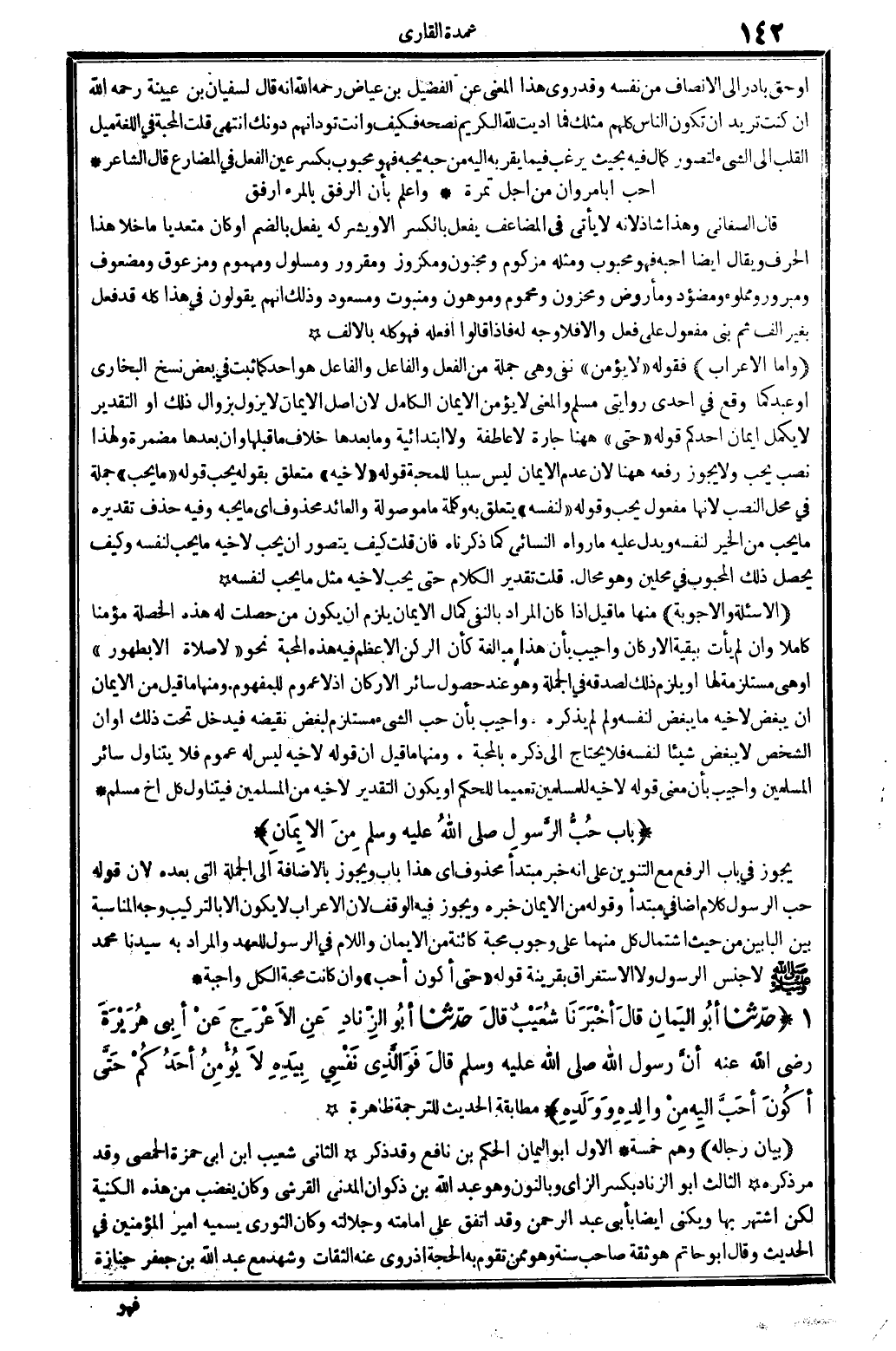 يجوز فِي بَاب الرّفْع مَعَ التَّنْوِين على أَنه خبر مُبْتَدأ مَحْذُوف، أَي: هَذَا بَاب، وَيجوز بِالْإِضَافَة إِلَى الْجُمْلَة الَّتِي بعده، لِأَن قَوْله: حب الرَّسُول، كَلَام إضافي مُبْتَدأ، أَو قَوْله: من الْإِيمَان خَبره، وَيجوز فِيهِ الْوَقْف. لِأَن الْإِعْرَاب لَا يكون إلاَّ بالتركيب. وَجه الْمُنَاسبَة بَين الْبَابَيْنِ من حَيْثُ اشْتِمَال كل مِنْهُمَا على وجوب محبَّة كائنة من الْإِيمَان، وَاللَّام فِي: الرَّسُول، للْعهد، وَالْمرَاد بِهِ: سيدنَا مُحَمَّد صلى الله عَلَيْهِ وَسلم لَا جنس الرَّسُول وَلَا الِاسْتِغْرَاق بِقَرِينَة. قَوْله: (حَتَّى أكون أحب) وَإِن كَانَت محبَّة الْكل وَاجِبَة.