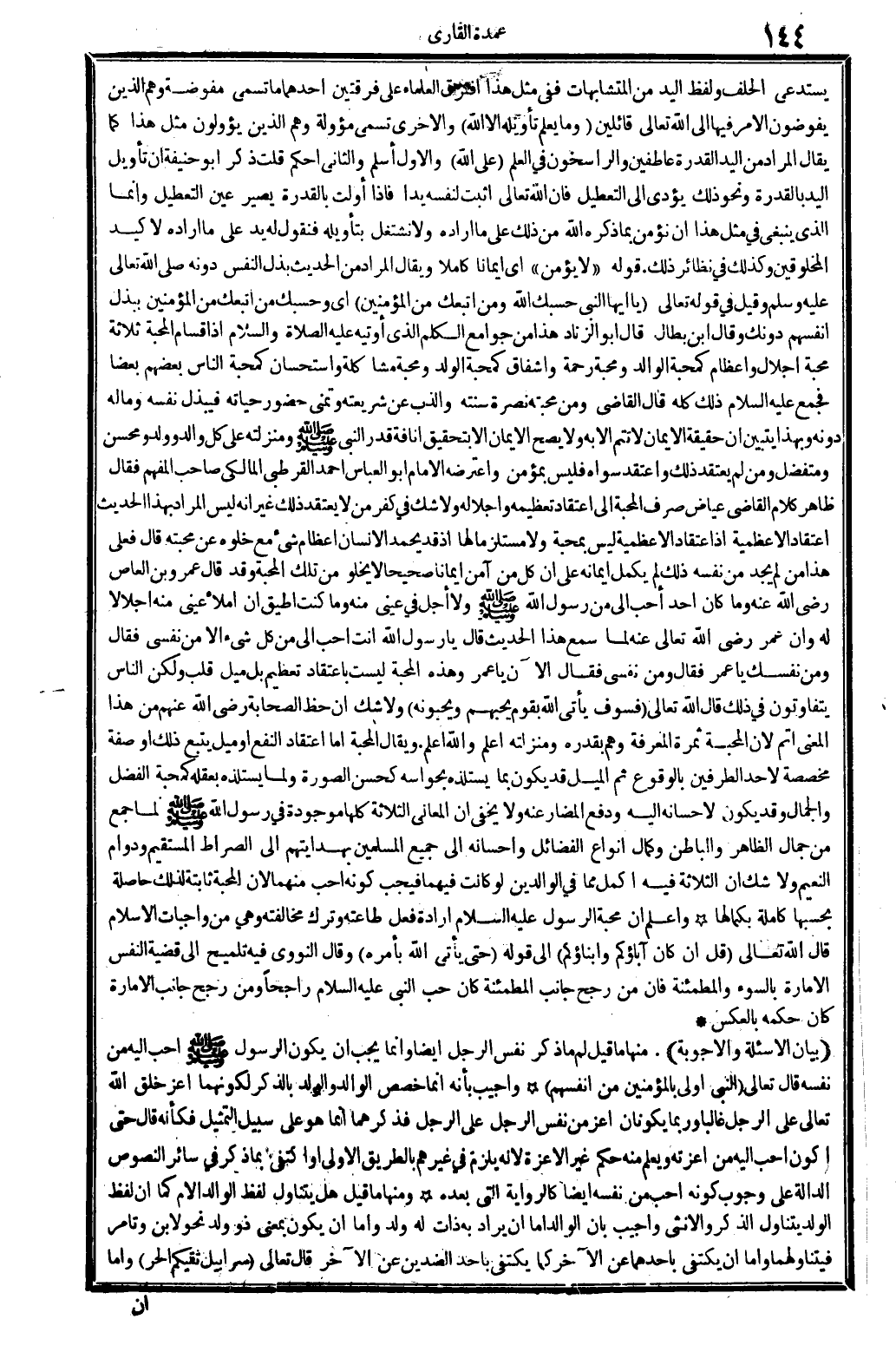 (بَيَان الأسئلة والأجوبة) . مِنْهَا: مَا قيل: لِمَ مَا ذكر نفس الرجل أَيْضا وَإِنَّمَا يجب أَن يكون الرَّسُول صلى الله عَلَيْهِ وَسلم أحب إِلَيْهِ من نَفسه قَالَ تَعَالَى: {النَّبِي أولى بِالْمُؤْمِنِينَ من أنفسهم} (الْأَحْزَاب: 33) وَأجِيب: بِأَنَّهُ إِنَّمَا خصص الْوَالِد وَالْولد بِالذكر لِكَوْنِهِمَا أعز خلق الله تَعَالَى على الرجل غَالِبا، وَرُبمَا يكونَانِ أعز من نفس الرجل على الرجل، فذكرهما إِنَّمَا هُوَ على سَبِيل التَّمْثِيل، فَكَأَنَّهُ قَالَ: حَتَّى أكون أحب إِلَيْهِ من أعزته، وَيعلم مِنْهُ حكم غير الأعزة، لِأَنَّهُ يلْزم فِي غَيرهم بِالطَّرِيقِ الأولى، أَو اكْتفى بِمَا ذكر فِي سَائِر النُّصُوص الدَّالَّة على وجوب كَونه أحب من نَفسه أَيْضا، كالرواية الَّتِي بعده. وَمِنْهَا مَا قيل: هَل يتَنَاوَل لفظ الْوَالِد الْأُم كَمَا أَن لفظ الْوَلَد يتَنَاوَل الذّكر وَالْأُنْثَى؟ وَأجِيب: بِأَن الْوَالِد إِمَّا أَن يُرَاد بِهِ ذَات لَهُ ولد، وَإِمَّا أَن يكون بِمَعْنى ذُو ولد نَحْو لِابْنِ وتامر، فيتناولهما، وَإِمَّا أَن يكْتَفى بِأَحَدِهِمَا عَن الآخر كَمَا يكْتَفى بِأحد الضدين عَن الآخر. قَالَ تَعَالَى: {سرابيل تقيكم الْحر} (النَّحْل: 81) وَإِمَّا