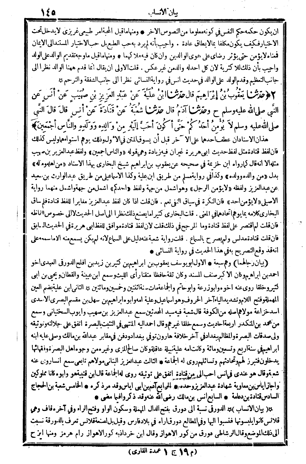 (بَيَان رجالهما) وهم سَبْعَة: الأول: أَبُو يُوسُف يَعْقُوب بن إِبْرَاهِيم بن كثير بن زيد بن أَفْلح الدَّوْرَقِي الْعَبْدي، أَخُو أَحْمد بن إِبْرَاهِيم، وَكَانَ الْأَكْبَر صنف الْمسند، وَكَانَ ثِقَة حَافِظًا متقناً، رأى اللَّيْث، وَسمع: ابْن عُيَيْنَة وَالْقطَّان وَيحيى بن أبي كثير وخلقاً. روى عَنهُ: أَخُوهُ وَأَبُو زرْعَة وَأَبُو حَاتِم وَالْجَمَاعَة. مَاتَ سنة اثْنَتَيْنِ وَخمسين وَمِائَتَيْنِ. الثَّانِي: ابْن علية، بِضَم الْعين الْمُهْملَة وَفتح اللَّام وَتَشْديد الْيَاء آخر الْحُرُوف، وَهُوَ إِسْمَاعِيل، وَعليَّة أمه، وَأَبوهُ إِبْرَاهِيم بن سهل بن مقسم الْبَصْرِيّ الْأَسدي، أَسد خُزَاعَة، مَوْلَاهُم، أَصله من الْكُوفَة، قَالَ شُعْبَة فِيهِ سيد الْمُحدثين، سمع عبد الْعَزِيز بن صُهَيْب، وَأَيوب السّخْتِيَانِيّ، وَسمع من مُحَمَّد بن الْمُنْكَدر أَرْبَعَة أَحَادِيث، وَسمع خلقا غَيرهم. وَقَالَ أَحْمد: إِلَيْهِ الْمُنْتَهى فِي التثبت بِالْبَصْرَةِ، اتّفق على جلالته وتوثيقه، ولي صدقَات الْبَصْرَة والمظالم بِبَغْدَاد فِي آخر خلَافَة هَارُون، توفّي بِبَغْدَاد، وَدفن فِي مَقَابِر عبد الله بن مَالك، وَصلى عَلَيْهِ ابْنه إِبْرَاهِيم فِي سنة أَربع وَتِسْعين وَمِائَة، وَكَانَت أمه علية نبيلة عَاقِلَة، وَكَانَ صَالح الْمزي وَغَيره من وُجُوه أهل الْبَصْرَة وفقهائها يدْخلُونَ فَتبرز لَهُم وتحادثهم وتسائلهم، روى لَهُ الْجَمَاعَة. الثَّالِث: عبد الْعَزِيز الْبنانِيّ، مَوْلَاهُم، تَابِعِيّ، سمع أنسا، روى عَنهُ شُعْبَة، وَقَالَ: هُوَ عِنْدِي فِي أنس أحب إِلَيّ من قَتَادَة، اتّفق على توثيقه، روى لَهُ الْجَمَاعَة، قَالَ ابْن قُتَيْبَة: هُوَ وَأَبوهُ كَانَا مملوكين، وَأَجَازَ إِيَاس بن مُعَاوِيَة شَهَادَة عبد الْعَزِيز وَحده. الرَّابِع: آدم بن أبي إِيَاس، وَقد مر ذكره. الْخَامِس: شُعْبَة بن الْحجَّاج. السَّادِس: قَتَادَة بن دعامة. السَّابِع: أنس بن مَالك رَضِي الله عَنهُ، وَقد ذكرُوا فِيمَا مضى.