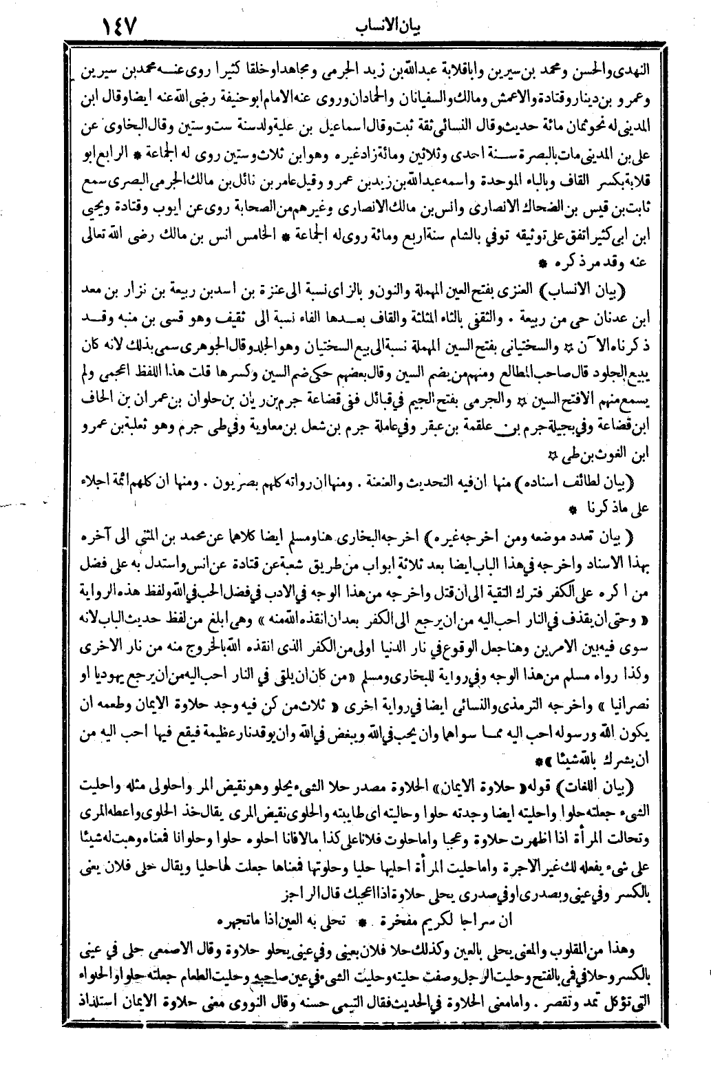 (بَيَان الْأَنْسَاب) الْعَنزي، بِفَتْح الْعين الْمُهْملَة وَالنُّون وبالزاي، نِسْبَة إِلَى عنزة بن أَسد بن ربيعَة بن نزار بن معد بن عدنان حَيّ من ربيعَة. والثقفي: بالثاء الْمُثَلَّثَة وَالْقَاف بعْدهَا الْفَاء نِسْبَة إِلَى ثَقِيف، وَهُوَ: قسي بن مُنَبّه، وَقد ذَكرْنَاهُ الْآن. والسختياني: بِفَتْح السِّين الْمُهْملَة نِسْبَة إِلَى بيع السختيان، وَهُوَ الْجلد؛ وَقَالَ الْجَوْهَرِي: سمي بذلك لِأَنَّهُ كَانَ يَبِيع الْجُلُود قَالَ صَاحب الْمطَالع: وَمِنْهُم من يضم السِّين؛ وَقَالَ بَعضهم: حُكيَ بِضَم السِّين وَكسرهَا. قلت: هَذَا اللَّفْظ أعجمي؟ وَلم يسمع مِنْهُم إلاَّ فتح السِّين. والجرمي: بِفَتْح الْجِيم فِي قبائل، فَفِي قضاعة جرم بن رَيَّان بن حلوان بن عمرَان بن الحاف بن قضاعة، وَفِي بجيلة جرم بن عَلْقَمَة بن عبقر، وَفِي عاملة جرم بن شعل بن مُعَاوِيَة، وَفِي طي جرم وَهُوَ ثَعْلَبَة بن عَمْرو بن الْغَوْث بن طي.