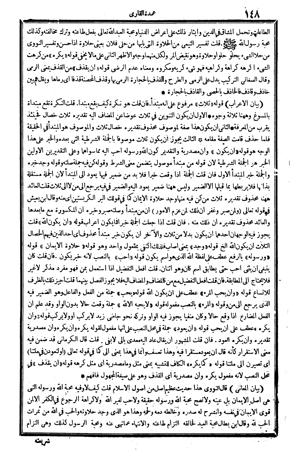 (بَيَان الْإِعْرَاب) قَوْله: (ثَلَاث) مَرْفُوع على أَنه مُبْتَدأ. فَإِن قلت: هُوَ نكرَة كَيفَ يَقع مُبْتَدأ؟ قلت: النكرَة تقع مُبتَدأَة بالمسوغ، وَهَهُنَا ثَلَاثَة وُجُوه. الأول: أَن يكون التَّنْوِين فِي ثَلَاث عوضا عَن الْمُضَاف إِلَيْهِ، تَقْدِيره: ثَلَاث خِصَال، فحينئذٍ يقرب من الْمعرفَة. الثَّانِي: أَن يكون هَذَا صفة لموصوف مَحْذُوف تَقْدِيره: خِصَال ثَلَاث، والموصوف هُوَ الْمُبْتَدَأ فِي الْحَقِيقَة، فَلَمَّا حذف قَامَت الصّفة مقَامه. الثَّالِث: يجوز أَن يكون ثَلَاث مَوْصُوفا بِالْجُمْلَةِ الشّرطِيَّة الَّتِي بعده، وَالْخَبَر على هَذَا الْوَجْه هُوَ قَوْله: (أَن يكون) ، وَأَن مَصْدَرِيَّة، وَالتَّقْدِير: كَون الله وَرَسُوله أحب إِلَيْهِ مِمَّا سواهُمَا. وعَلى التَّقْدِيرَيْنِ الْأَوَّلين الْخَبَر هُوَ الْجُمْلَة الشّرطِيَّة، لِأَن قَوْله: من مُبْتَدأ مَوْصُول يتَضَمَّن معنى الشَّرْط، وَقَوله: كن فِيهِ، جملَة صلته. وَقَوله: وجد، خَبره. وَالْجُمْلَة خبر الْمُبْتَدَأ الأول. فَإِن قلت: الْجُمْلَة إِذا وَقعت خَبرا فَلَا بُد من ضمير فِيهَا يعود إِلَى الْمُبْتَدَأ، لِأَن الْجُمْلَة مُسْتَقلَّة بذاتها فَلَا يربطها بِمَا قبلهَا إلاَّ الضَّمِير، وَلَيْسَ هَهُنَا ضمير يعود إِلَيْهِ، وَالضَّمِير فِي فِيهِ يرجع إِلَى: من، لَا إِلَى ثَلَاث؟ قلت: الْعَائِد هَهُنَا مَحْذُوف تَقْدِيره: ثَلَاث من كن فِيهِ مِنْهَا وجد حلاوة الْإِيمَان، كَمَا فِي قَوْلك: الْبر الكربستين أَي: مِنْهُ، وَقَالَ ابْن يعِيش فِي قَوْله تَعَالَى: {وَلمن صَبر وَغفر إِن ذَلِك لمن عزم الْأُمُور} (الشورى: 43) إِن من مُبْتَدأ، وصلته صَبر، وَخَبره: إِن الْمَكْسُورَة مَعَ مَا بعْدهَا، والعائد مَحْذُوف تَقْدِيره: إِن ذَلِك مِنْهُ. فَإِن قلت: إِذا جعلت الْجُمْلَة خَبرا، فَمَا يكون إِعْرَاب قَوْله: (أَن يكون الله) ؟ قلت: يجوز فِيهِ الْوَجْهَانِ: أَحدهمَا: أَن يكون بَدَلا من ثَلَاث، وَالْآخر: أَن يكون خبر مُبْتَدأ مَحْذُوف، أَي: أحد الَّذين فيهم الْخِصَال الثَّلَاث أَن يكون الله ... الخ. قَوْله: (وجد) بِمَعْنى أصَاب، فَلذَلِك اكْتفى بمفعول وَاحِد، وَهُوَ قَوْله: (حلاوة الْإِيمَان) . قَوْله: (وَرَسُوله) : بِالرَّفْع عطف على لَفْظَة: الله، الَّذِي هُوَ اسْم يكون، قَوْله: (أحب) بِالنّصب لِأَنَّهُ خبر يكون. فَإِن قلت: كَانَ يَنْبَغِي أَن يثني: أحب، حَتَّى يُطَابق اسْم كَانَ، وَهُوَ اثْنَان. قلت: أفعل التَّفْضِيل إِذا اسْتعْمل: بِمن، فَهُوَ مُفْرد مُذَكّر لَا غير فَلَا يحْتَاج إِلَى الْمُطَابقَة. فَإِن قلت: أفعل التَّفْضِيل مَعَ: من، كالمضاف والمضاف إِلَيْهِ، فَلَا يجوز الْفَصْل بَينهمَا. قلت: أُجِيز ذَلِك بالظرف للاتساع. قَوْله: (وَأَن يحب الْمَرْء) عطف على أَن يكون الله. قَوْله: (يحب) جملَة من الْفِعْل وَالْفَاعِل، وَهُوَ الضَّمِير فِيهِ الَّذِي يرجع إِلَى: من وَقَوله: (الْمَرْء) بِالنّصب مَفْعُوله. قَوْله: (لَا يُحِبهُ إلاَّ لله) جملَة وَقعت حَالا بِدُونِ الْوَاو، وَقد علم أَن الْفِعْل الْمُضَارع إِذا وَقع حَالا وَكَانَ منفياً يجوز فِيهِ الْوَاو وَتَركه، نَحْو: جَاءَنِي زيد لَا يركب، أَو: وَلَا يركب. قَوْله: (وَأَن يكره) عطف على: أَن يحب، قَوْله: (أَن يعود) جملَة فِي مَحل النصب على أَنَّهَا مفعول لقَوْله: يكره، وَأَن يكره: وَأَن مَصْدَرِيَّة تَقْدِيره: وَأَن يكره الْعود. فَإِن قلت: الْمَشْهُور أَن يُقَال: عَاد إِلَيْهِ، معدى بإلى لَا بفي. قلت: قَالَ الْكرْمَانِي: قد ضمن فِيهِ معنى الِاسْتِقْرَار، كَأَنَّهُ قَالَ: أَن يعود مُسْتَقرًّا فِيهِ، وَهَذَا تعسف، وَإِنَّمَا: فِي هَذَا بِمَعْنى: إِلَى، كَمَا فِي قَوْله تَعَالَى: {أَو لتعودن فِي ملتنا} (الْأَعْرَاف: 288) أَي: تصيرن إِلَى ملتنا. قَوْله: (كَمَا يكره) : الْكَاف للتشبيه بِمَعْنى: مثل، و: مَا، مَصْدَرِيَّة، أَي: مثل كرهه. قَوْله: (أَن يقذف) فِي مَحل 