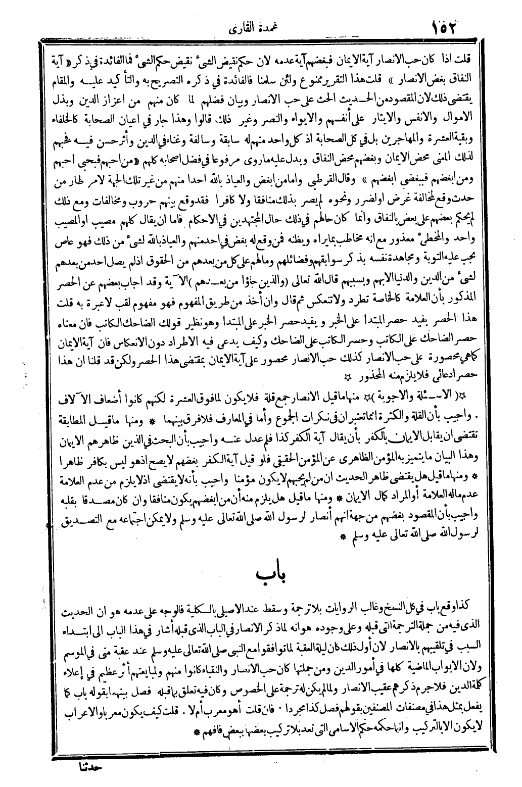 (الأسئلة والأجوبة) مِنْهَا مَا قيل: الْأَنْصَار جمع قلَّة، فَلَا يكون لما فَوق الْعشْرَة لكِنهمْ كَانُوا أَضْعَاف الآلاف؟ وَأجِيب: بِأَن الْقلَّة وَالْكَثْرَة إِنَّمَا تعتبران فِي نكرات الجموع، وَأما فِي المعارف فَلَا فرق بَينهمَا. وَمِنْهَا مَا قيل: الْمُطَابقَة تَقْتَضِي أَن يُقَابل الْإِيمَان بالْكفْر، بِأَن يُقَال: آيَة الْكفْر كَذَا، فَلم عدل عَنهُ؟ وَأجِيب: بِأَن الْبَحْث فِي الَّذين ظَاهِرهمْ الْإِيمَان، وَهَذَا الْبَيَان مَا يتَمَيَّز بِهِ الْمُؤمن الظَّاهِرِيّ عَن الْمُؤمن الْحَقِيقِيّ، فَلَو قيل: آيَة الْكفْر بغضهم، لَا يَصح، إِذْ هُوَ لَيْسَ بِكَافِر ظَاهرا. وَمِنْهَا مَا قيل: هَل يَقْتَضِي ظَاهر الحَدِيث أَن من لم يُحِبهُمْ لَا يكون مُؤمنا؟ وَأجِيب: بِأَنَّهُ لَا يَقْتَضِي إِذْ لَا يلْزم من عدم الْعَلامَة عدم مَا لَهُ الْعَلامَة، أَو المُرَاد: كَمَال الْإِيمَان. وَمِنْهَا مَا قيل: هَل يلْزم مِنْهُ أَن من أبْغضهُم يكون منافقاً، وَإِن كَانَ مُصدقا بِقَلْبِه؟ وَأجِيب: بِأَن الْمَقْصُود بغضهم من جِهَة أَنهم أنصار لرَسُول الله صلى الله عَلَيْهِ وَسلم، وَلَا يُمكن اجتماعه مَعَ التَّصْدِيق لرَسُول الله صلى الله عَلَيْهِ وَسلم.
