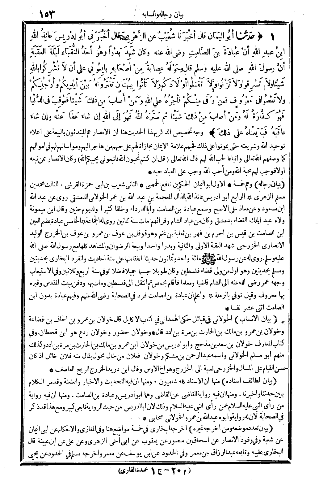 (بَيَان رِجَاله) وهم خَمْسَة. الأول: أَبُو الْيَمَان الحكم بن نَافِع الْحِمصِي. الثَّانِي: شُعَيْب بن أبي حَمْزَة الْقرشِي. الثَّالِث: مُحَمَّد بن مُسلم الزُّهْرِيّ. الرَّابِع: أَبُو إِدْرِيس، عَائِذ الله بِالذَّالِ الْمُعْجَمَة بن عبد الله بن عمر الْخَولَانِيّ الدِّمَشْقِي، روى عَن: عبد الله بن مَسْعُود وَعَن معَاذ على الْأَصَح، وَسمع: عبَادَة بن الصَّامِت وَأَبا الدَّرْدَاء وخلقاً كثيرا، ولد يَوْم حنين، وَقَالَ ابْن مَيْمُونَة ولاه عبد الْملك الْقَضَاء بِدِمَشْق، وَكَانَ من عباد الشَّام وقرائهم، مَاتَ سنة ثَمَانِينَ، روى لَهُ الْجَمَاعَة. الْخَامِس: عبَادَة، بِضَم الْعين، ابْن الصَّامِت بن قيس بن أحرم بن فهر بن ثَعْلَبَة بن غنم وَهُوَ قوقل بن عَوْف بن عَمْرو بن عَوْف بن الْخَزْرَج الْوَلِيد الْأنْصَارِيّ الخزرجي، شهد الْعقبَة الأولى وَالثَّانيَِة وبدراً وأُحداً وبيعة الرضْوَان والمشاهد كلهَا مَعَ رَسُول الله صلى الله عَلَيْهِ وَسلم، رُوِيَ لَهُ عَن رَسُول الله صلى الله عَلَيْهِ وَسلم مائَة وَأحد وَثَمَانُونَ حَدِيثا، اتفقَا مِنْهَا على سِتَّة أَحَادِيث، وَانْفَرَدَ البُخَارِيّ بحديثين، وَمُسلم بحديثين، وَهُوَ أول من ولي قَضَاء فلسطين، وَكَانَ طَويلا جسيماً جميلاً فَاضلا، توفّي سنة أَربع وَثَلَاثِينَ، وَفِي (الِاسْتِيعَاب) : وَجهه عمر رَضِي الله عَنهُ، إِلَى الشَّام قَاضِيا ومعلماً، فَأَقَامَ بحمص، ثمَّ انْتقل إِلَى فلسطين، وَمَات بهَا وَدفن بِبَيْت الْمُقَدّس، وقبره بهَا مَعْرُوف، وَقيل: توفّي بالرملة. وَاعْلَم أَن عبَادَة بن الصَّامِت فَرد فِي الصَّحَابَة، رَضِي الله عَنْهُم، وَفِيهِمْ عبَادَة بِدُونِ ابْن الصَّامِت اثْنَي عشر نفسا.