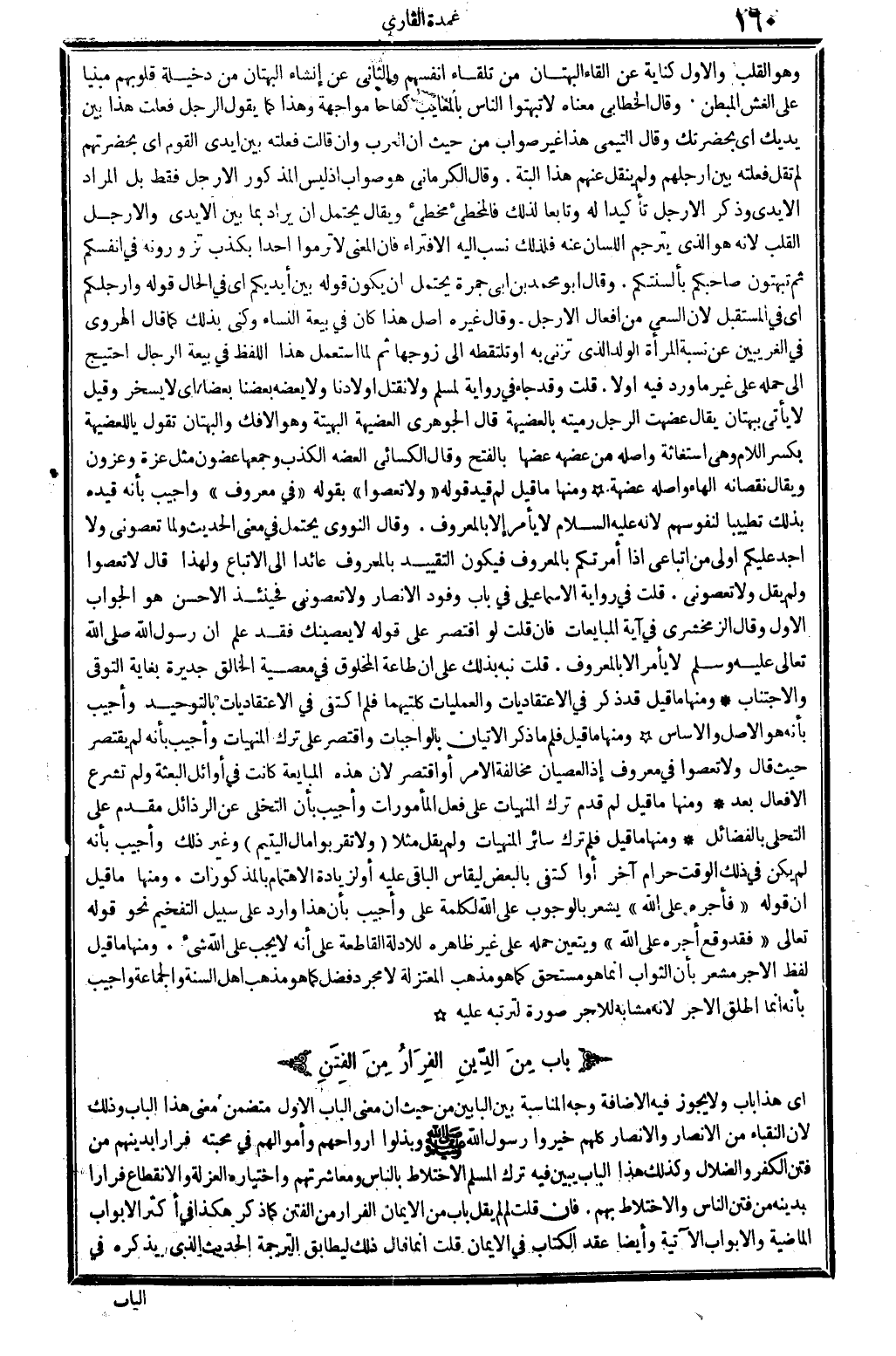 أَي: هَذَا بَاب، وَلَا يجوز فِيهِ الْإِضَافَة. وَجه الْمُنَاسبَة بَين الْبَابَيْنِ من حَيْثُ إِن معنى الْبَاب الأول مُتَضَمّن معنى هَذَا الْبَاب، وَذَلِكَ لِأَن النُّقَبَاء من الْأَنْصَار، والانصار كلهم خيروا رَسُول الله صلى الله عَلَيْهِ وَسلم وبذلوا أَرْوَاحهم وَأَمْوَالهمْ فِي محبته فِرَارًا بدينهم من فتن الْكفْر والضلال، وَكَذَلِكَ هَذَا الْبَاب يبين فِيهِ ترك الْمُسلم الِاخْتِلَاط بِالنَّاسِ ومعاشرتهم، واختياره الْعُزْلَة والانقطاع فِرَارًا بِدِينِهِ من فتن النَّاس والاختلاط بهم. فَإِن قلت: لِمَ لَمْ يقل: بَاب من الْإِيمَان الْفِرَار من الْفِتَن، كَمَا ذكر هَكَذَا فِي أَكثر الْأَبْوَاب الْمَاضِيَة والأبواب الْآتِيَة، وَأَيْضًا عقد الْكتاب فِي الْإِيمَان؟ قلت: إِنَّمَا قَالَ ذَلِك ليطابق التَّرْجَمَة الحَدِيث الَّذِي يذكرهُ فِي