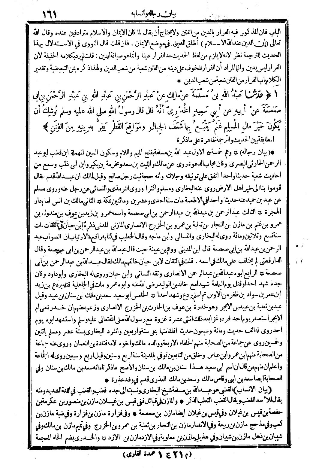 (بَيَان رِجَاله) : وهم خَمْسَة. الأول: عبد الله بن مسلمة، بِفَتْح الْمِيم وَاللَّام وَسُكُون السِّين الْمُهْملَة، ابْن قعنب أَبُو عبد الرَّحْمَن الْحَارِثِيّ الْبَصْرِيّ، وَكَانَ مجاب الدعْوَة، روى عَن: مَالك وَاللَّيْث بن سعد ومخرمة بن بكير وَابْن أبي ذِئْب، وَسمع من أَحَادِيث شُعْبَة حَدِيثا وَاحِدًا اتّفق على توثيقه وجلالته، وَأَنه حجَّة ثَبت رجل صَالح، وَقيل لمَالِك: إِن عبد الله قدم، فَقَالَ: قومُوا بِنَا إِلَى خير أهل الأَرْض. روى عَنهُ: البُخَارِيّ وَمُسلم وأكثرا، وروى التِّرْمِذِيّ وَالنَّسَائِيّ عَن رجل عَنهُ، وروى مُسلم عَن عبد بن حميد عَنهُ حَدِيثا وَاحِدًا فِي الْأَطْعِمَة، مَاتَ سنة إِحْدَى وَعشْرين وَمِائَتَيْنِ بِمَكَّة. الثَّانِي: مَالك بن أنس إِمَام دَار الْهِجْرَة. الثَّالِث: عبد الرَّحْمَن بن عبد الله بن عبد الرَّحْمَن بن أبي صعصعة، واسْمه عَمْرو بن زيد بن عَوْف بن منذول بن عَمْرو بن غنم بن مَازِن بن النجار بن ثَعْلَبَة بن عَمْرو بن الْخَزْرَج الْأنْصَارِيّ الْمَازِني الْمدنِي، ذكره ابْن حبَان فِي (الثِّقَات) مَاتَ سنة تسع وَثَلَاثِينَ وَمِائَة، روى لَهُ البُخَارِيّ وَالنَّسَائِيّ وَابْن مَاجَه. وَقَالَ الْخَطِيب فِي كِتَابه (رَافع الارتياب) : إِن الصَّوَاب عبد الرَّحْمَن بن عبد الله بن أبي صعصعة، قَالَ ابْن الْمَدِينِيّ: وَوهم ابْن عُيَيْنَة حَيْثُ قَالَ: عبد الله بن عبد الرَّحْمَن بن أبي صعصعة. وَقَالَ الدَّارَقُطْنِيّ: لِمَ يخْتَلف على مَالك فِي اسْمه؟ قلت: فِي (الثِّقَات) لِابْنِ حبَان خالفهم مَالك، فَقَالَ: عبد الله بن عبد الرَّحْمَن بن أبي صعصعة. الرَّابِع: أَبوهُ عبد الله بن عبد الرَّحْمَن الْأنْصَارِيّ، وَثَّقَهُ النَّسَائِيّ وَابْن حبَان، وروى لَهُ البُخَارِيّ وَأَبُو دَاوُد، وَكَانَ جده شهد أحدا وَقتل يَوْم الْيَمَامَة شَهِيدا مَعَ خَالِد بن الْوَلِيد رَضِي الله عَنهُ، وَأَبوهُ عَمْرو مَاتَ فِي الْجَاهِلِيَّة، قَتله بردع بن زيد بن عَامر بن سَواد بن ظفر من الْأَوْس، ثمَّ أسلم بردع وَشهد أحدا. الْخَامِس: أَبُو سعيد سعد بن مَالك بن سِنَان بن عبيد، وَقيل: عبد بن ثَعْلَبَة بن عبيد بن الأبجر، وَهُوَ خدرة بن عَوْف بن الْحَارِث بن الْخَزْرَج الْأنْصَارِيّ، وَزعم بَعضهم أَن خدرة هِيَ أم الأبجر، استصغر يَوْم أحد فرُدَّ، وغزا بعد ذَلِك اثْنَتَيْ عشرَة غَزْوَة مَعَ رَسُول الله صلى الله عَلَيْهِ وَسلم، وَاسْتشْهدَ أَبوهُ يَوْم أحد، رُوِيَ لَهُ ألف حَدِيث وَمِائَة وَسَبْعُونَ حَدِيثا، اتفقَا مِنْهَا على سِتَّة وَأَرْبَعين، وَانْفَرَدَ البُخَارِيّ بِسِتَّة عشر، وَمُسلم بِاثْنَتَيْنِ وَخمسين. روى عَن جمَاعَة من الصَّحَابَة، مِنْهُم: الْخُلَفَاء الْأَرْبَعَة ووالده مَالك وَأَخُوهُ لأمه، قَتَادَة بن النُّعْمَان، وروى عَنهُ جمَاعَة من الصَّحَابَة. مِنْهُم: ابْن عمر وَابْن عَبَّاس وَخلق من التَّابِعين، توفّي بِالْمَدِينَةِ سنة أَربع وَسِتِّينَ، وَقيل: أَربع وَسبعين. روى لَهُ الْجَمَاعَة، وَاعْلَم أَن مِنْهُم من قَالَ: إِن اسْم أبي سعيد هَذَا: سِنَان بن مَالك بن سِنَان، وَالأَصَح مَا ذَكرْنَاهُ انه: سعد بن مَالك بن سِنَان، وَفِي الصَّحَابَة أَيْضا: سعد بن أبي وَقاص مَالك وَسعد بن مَالك العذري قدم فِي وَفد عذرة.
