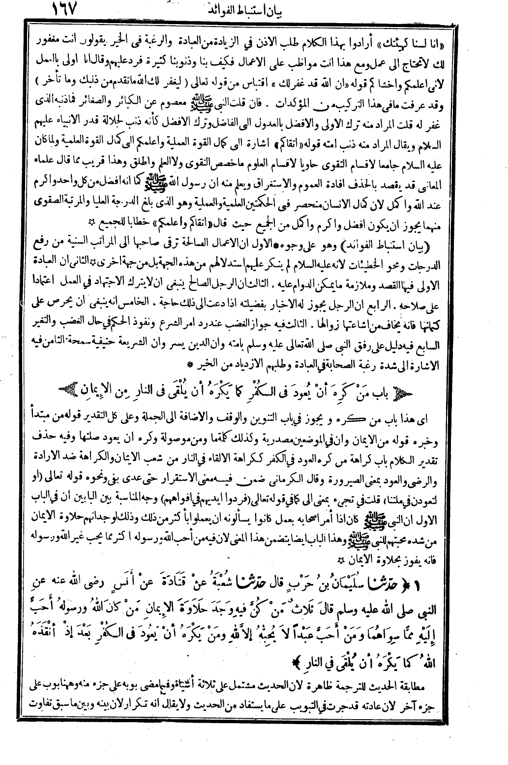 21 - حدّثنا سُلَيْمَانُ بنُ حَرْبٍ قَالَ حَدثنَا شُعْبَةُ عنْ قَتَادَةَ عنْ أَنَسٍ رَضِي الله عَنهُ عنِ النَّبِي صلى الله عَلَيْهِ وَسلم قالَ ثَلاثٌ مَنْ كُنَّ فيهِ وَجَدَ حَلاَوَةَ الإِيمانِ مَنْ كانَ اللَّهُ ورسولهُ أَحَبَّ إِلَيْهِ ممَّا سِوَاهُمَا وَمَنْ أَحَبَّ عَبْداً لاَ يُحِبُّهُ إلاَّ للَّهِ ومَنْ يَكرَهُ أنْ يَعُودَ فِي الكُفْرِ بَعْدَ إذْ أنْقَذَهُ اللَّهُ كَمَا يَكْرَهُ أَن يُلْقَى فِي النارِ.