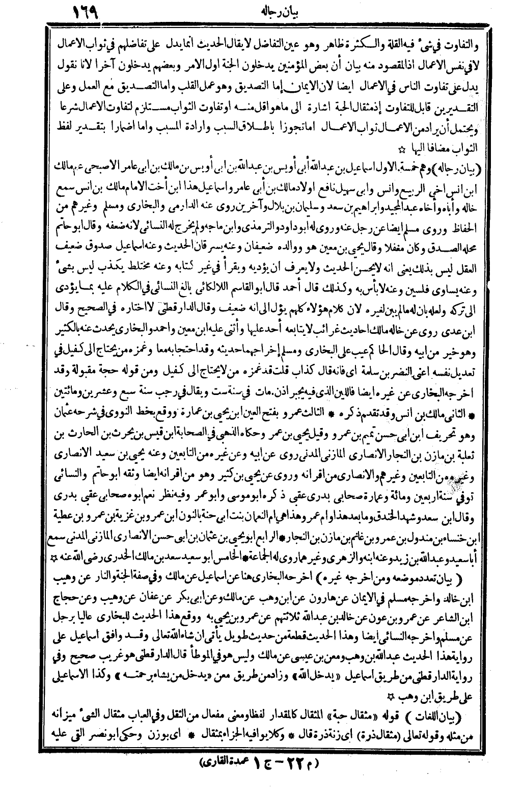 والتفاوت فِي شَيْء فِيهِ الْقلَّة وَالْكَثْرَة ظَاهر وَهُوَ عين التَّفَاضُل، لَا يُقَال: الحَدِيث إِنَّمَا يدل على تفاضلهم فِي ثَوَاب الْأَعْمَال لَا فِي نفس الْأَعْمَال، إِذْ الْمَقْصُود مِنْهُ بَيَان أَن بعض الْمُؤمنِينَ يدْخلُونَ الْجنَّة أول الْأَمر، وَبَعْضهمْ يدْخلُونَ آخرا لأَنا نقُول: يدل على تفَاوت النَّاس فِي الْأَعْمَال أَيْضا، لِأَن الْإِيمَان: إِمَّا التَّصْدِيق وَهُوَ عمل الْقلب، وَإِمَّا التَّصْدِيق مَعَ الْعَمَل، وعَلى التَّقْدِيرَيْنِ قَابل للتفاوت، إِذْ مِثْقَال الْحبَّة إِشَارَة إِلَى مَا هُوَ أقل مِنْهُ أَو تفَاوت الثَّوَاب مُسْتَلْزم لتَفَاوت الْأَعْمَال شرعا، وَيحْتَمل أَن يُرَاد من الْأَعْمَال ثَوَاب الْأَعْمَال، إِمَّا تجوزاً بِإِطْلَاق السَّبَب وَإِرَادَة الْمُسَبّب، وَإِمَّا إضماراً بِتَقْدِير لفظ الثَّوَاب مُضَافا إِلَيْهَا.