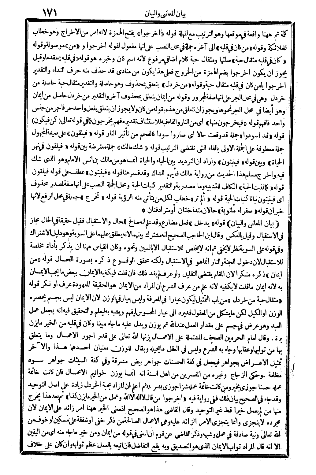 (بَيَان الْمعَانِي وَالْبَيَان) قَوْله: (يدْخل) فعل مضارع وَقد علم أَنه صَالح للْحَال والاستقبال، فَقيل: حَقِيقَة فِي الْحَال، مجَاز فِي الِاسْتِقْبَال، وَقيل: بِالْعَكْسِ. وَقَالَ ابْن الْحَاجِب: الصَّحِيح أَنه مُشْتَرك بَينهمَا لِأَنَّهُ يُطلق عَلَيْهِمَا على السوية، وَهُوَ دَلِيل الِاشْتِرَاك. وَفِي قَوْله: على السوية، نظر لَا يخفى، ثمَّ إِنَّه لَا يخلص للاستقبال إلاَّ بِالسِّين وَنَحْوه، وَكَانَ الْقيَاس هَهُنَا أَن يذكر بأداة مخلصة للاستقبال، لِأَن دُخُول الْجنَّة وَالنَّار إِنَّمَا هُوَ فِي الِاسْتِقْبَال، وَلكنه مُحَقّق الْوُقُوع ذكره بِصُورَة الْحَال. قَوْله: (من إِيمَان) ذكره مُنْكرا لِأَن الْمقَام يَقْتَضِي التقليل، وَلَو عرف لم يفد ذَلِك، فَإِن قلت: فيكفيه الْإِيمَان بِبَعْض مَا يجب الْإِيمَان بِهِ، لِأَنَّهُ إيمانٌ مَا. قلت: لَا يَكْفِيهِ لِأَنَّهُ علم، من عرف الشَّرْع أَن المُرَاد من الْإِيمَان هُوَ الْحَقِيقَة الْمَعْهُودَة عرف أَو نكر. قَوْله: (مِثْقَال حَبَّة من خَرْدَل) ، من بَاب التَّمْثِيل ليَكُون عياراً فِي الْمعرفَة، وَلَيْسَ بعيار فِي الْوَزْن، لِأَن الْإِيمَان لَيْسَ بجسم يحصره الْوَزْن أَو الْكَيْل، لَكِن مَا يشكل من الْمَعْقُول قد يرد إِلَى عيار المحسوس ليفهم، وَيُشبه بِهِ ليعلم، وَالتَّحْقِيق فِيهِ أَنه يَجْعَل عمل العَبْد، وَهُوَ عرض فِي جسم على مِقْدَار الْعَمَل عِنْد الله، ثمَّ يُوزن وَيدل عَلَيْهِ مَا جَاءَ مُبينًا، وَكَانَ فِي قلبه من الْخَيْر مَا يزن برة. وَقَالَ إِمَام الْحَرَمَيْنِ: الصُّحُف الْمُشْتَملَة على الْأَعْمَال يزنها الله تَعَالَى على قدر أجور الْأَعْمَال، وَمَا يتَعَلَّق بهَا من ثَوَابهَا وعقابها، وَجَاء بِهِ الشَّرْع وَلَيْسَ فِي الْعقل مَا يحيله، وَيُقَال: للوزن مَعْنيانِ: أَحدهمَا هَذَا، وَالْآخر تَمْثِيل الْأَعْرَاض بجواهر، فَيجْعَل فِي كفة الْحَسَنَات جَوَاهِر بيض مشرقة، وَفِي كفة السَّيِّئَات جَوَاهِر سود مظْلمَة. وَحكى الزّجاج وَغَيره من الْمُفَسّرين من أهل السّنة أَنه: إِنَّمَا يُوزن خَوَاتِيم الْأَعْمَال، فَإِن كَانَت خَاتِمَة عمله حسنا جوزي بِخَير، وَمن كَانَت خَاتِمَة عمله شرا جوزي بشر. ثمَّ علم: أَن المُرَاد بِحَبَّة الْخَرْدَل زِيَادَة على أصل التَّوْحِيد، وَقد جَاءَ فِي الصَّحِيح بَيَان ذَلِك، فَفِي رِوَايَة فِيهِ: (اخْرُجُوا من قَالَ لَا إِلَه إِلَّا الله وَعمل من الْخَيْر مَا يزن كَذَا) ، ثمَّ بعد هَذَا يخرج مِنْهَا من لم يعْمل خيرا قطّ غير التَّوْحِيد، وَقَالَ القَاضِي: هَذَا هُوَ الصَّحِيح، إِذْ معنى الْخَيْر هَهُنَا أَمر زَائِد على الْإِيمَان، لِأَن مجرده لَا يتجزى، وَإِنَّمَا يتجزى الْأَمر الزَّائِد عَلَيْهِ وَهِي الْأَعْمَال الصَّالِحَة، من: ذكر خَفِي، أَو شَفَقَة على مِسْكين، أَو خوف من الله تَعَالَى، وَنِيَّة صَادِقَة فِي عمل وَشبهه. وَذكر القَاضِي عَن قوم أَن الْمَعْنى فِي قَوْله: من إِيمَان وَمن خير: مَا جَاءَ مِنْهُ أَي: من الْيَقِين، إلاَّ أَنه قَالَ: المُرَاد ثَوَاب الْإِيمَان الَّذِي هُوَ التَّصْدِيق، وَبِه يَقع التَّفَاضُل، فَإِن اتبعهُ بِالْعَمَلِ عظم ثَوَابه، وَإِن كَانَ على خلاف