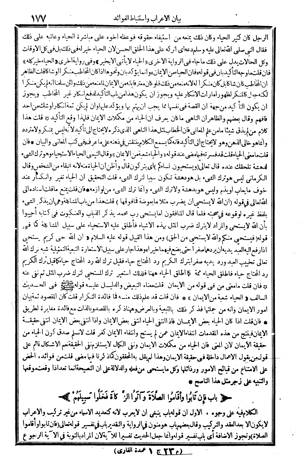 الْكَلَام فِيهِ على وُجُوه. الأول: أَن قَوْله: بَاب، يَنْبَغِي أَن لَا يعرب، لِأَنَّهُ كتعديد الْأَسْمَاء من غير تركيب، وَالْإِعْرَاب لَا يكون إلاَّ بعد العقد والتركيب. وَقَالَ بَعضهم: بَاب هُوَ منون فِي الرِّوَايَة، وَالتَّقْدِير: بَاب فِي تَفْسِير قَوْله تَعَالَى: {فَإِن تَابُوا وَأَقَامُوا الصَّلَاة} (التَّوْبَة: 5) وَتجوز الْإِضَافَة، أَي بَاب تَفْسِير قَوْله، وَإِنَّمَا جعل الحَدِيث تَفْسِيرا لِلْآيَةِ لِأَن المُرَاد بِالتَّوْبَةِ فِي الْآيَة الرُّجُوع