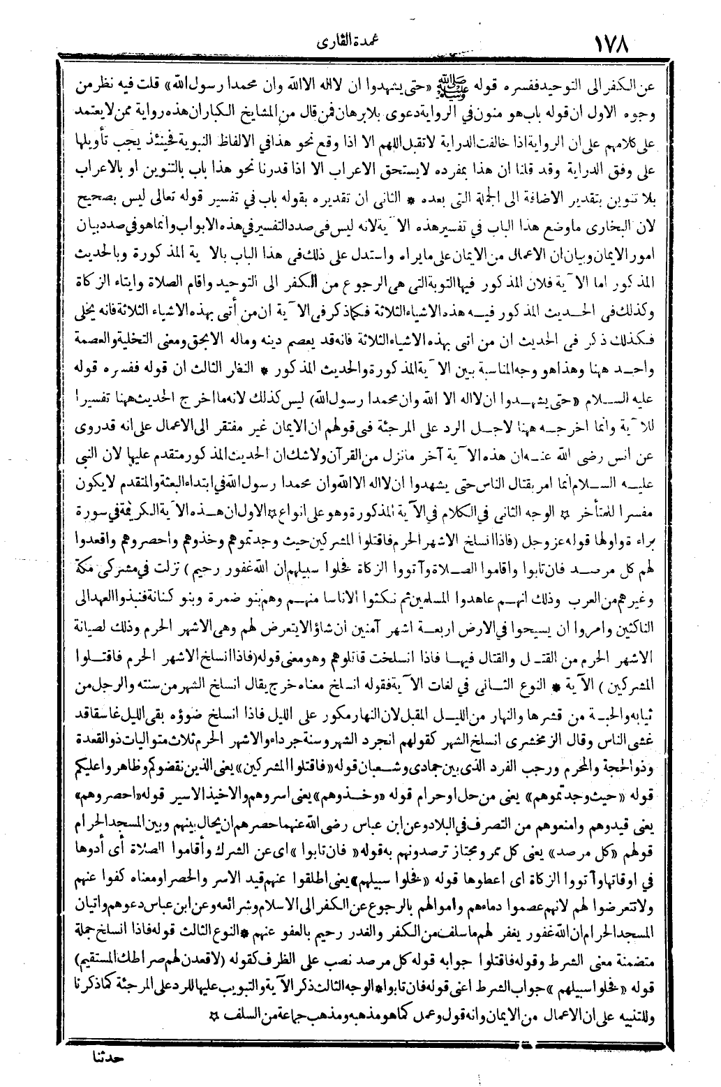 عَن الْكفْر إِلَى التَّوْحِيد ففسره قَوْله صلى الله عَلَيْهِ وَسلم: (حَتَّى يشْهدُوا أَن لَا إِلَه إِلَّا الله وَأَن مُحَمَّدًا رَسُول الله) قلت: فِيهِ نظر من وُجُوه: الأول: أَن قَوْله: بَاب، وَهُوَ منون فِي الرِّوَايَة دَعْوَى بِلَا برهَان. فَمن قَالَ من الْمَشَايِخ الْكِبَار: إِن هَذِه رِوَايَة مِمَّن لَا يعْتَمد على كَلَامهم على أَن الرِّوَايَة إِذا خَالَفت الدِّرَايَة لَا تقبل، اللَّهُمَّ إلاَّ إِذا وَقع نَحْو هَذَا فِي الْأَلْفَاظ النَّبَوِيَّة، فَحِينَئِذٍ يجب تَأْوِيلهَا على وفْق الدِّرَايَة، وَقد قُلْنَا: إِن هَذَا بمفرده لَا يسْتَحق الْإِعْرَاب إلاَّ إِذا قَدرنَا نَحْو: هَذَا بَاب، بِالتَّنْوِينِ، أَو بالإعراب بِلَا تَنْوِين بِتَقْدِير الْإِضَافَة إِلَى الْجُمْلَة الَّتِي بعده. الثَّانِي: أَن تَقْدِيره بقوله: بَاب فِي تَفْسِير قَوْله تَعَالَى، لَيْسَ بِصَحِيح، لِأَن البُخَارِيّ مَا وضع هَذَا الْبَاب فِي تَفْسِير هَذِه الْآيَة لِأَنَّهُ لَيْسَ فِي صدد التَّفْسِير فِي هَذِه الْأَبْوَاب، وَإِنَّمَا هُوَ فِي صدد بَيَان أُمُور الْإِيمَان، وَبَيَان أَن الْأَعْمَال من الْإِيمَان على مَا يرَاهُ وَاسْتدلَّ على ذَلِك فِي هَذَا الْبَاب بِالْآيَةِ الْمَذْكُورَة وَبِالْحَدِيثِ الْمَذْكُور، أما الْآيَة فَلِأَن الْمَذْكُور فِيهَا التَّوْبَة الَّتِي هِيَ الرُّجُوع من الْكفْر إِلَى التَّوْحِيد، وإقام الصَّلَاة وإيتاء الزَّكَاة وَكَذَلِكَ فِي الحَدِيث الْمَذْكُور فِيهِ هَذِه الْأَشْيَاء الثَّلَاثَة، فَكَمَا ذكر فِي الْآيَة: أَن من أَتَى بِهَذِهِ الْأَشْيَاء الثَّلَاث فَإِنَّهُ يخلي، فَكَذَلِك ذكر فِي الحَدِيث أَن من أَتَى بِهَذِهِ الْأَشْيَاء الثَّلَاثَة فَإِنَّهُ قد يعْصم دينه وَمَاله إلاَّ بِحَق، وَمعنى التَّخْلِيَة والعصمة وَاحِد هَهُنَا، وَهَذَا هُوَ وَجه الْمُنَاسبَة بَين الْآيَة الْمَذْكُورَة والْحَدِيث الْمَذْكُور. النّظر الثَّالِث: أَن قَوْله: ففسره قَوْله عَلَيْهِ السَّلَام: (حَتَّى يشْهدُوا أَن لَا إِلَّا الله وَأَن مُحَمَّدًا رَسُول الله صلى الله عَلَيْهِ وَسلم) لَيْسَ كَذَلِك، لِأَنَّهُ مَا أخرج الحَدِيث هَهُنَا تَفْسِيرا لِلْآيَةِ، وَإِنَّمَا أخرجه هَهُنَا لأجل الرَّد على المرجئة فِي قَوْلهم: إِن الْإِيمَان غير مفتقر إِلَى الْأَعْمَال، على أَنه قد رُوِيَ عَن أنس، رَضِي الله عَنهُ، أَن هَذِه الْآيَة آخر مَا نزل من الْقُرْآن وَلَا شكّ أَن الحَدِيث الْمَذْكُور مُتَقَدم عَلَيْهَا، لِأَن النَّبِي عَلَيْهِ السَّلَام، إِنَّمَا أَمر بِقِتَال النَّاس حَتَّى يشْهدُوا أَن لَا إِلَه إِلَّا الله وَأَن مُحَمَّدًا رَسُول الله فِي ابْتِدَاء الْبعْثَة، والمتقدم لَا يكون مُفَسرًا للمتأخر.