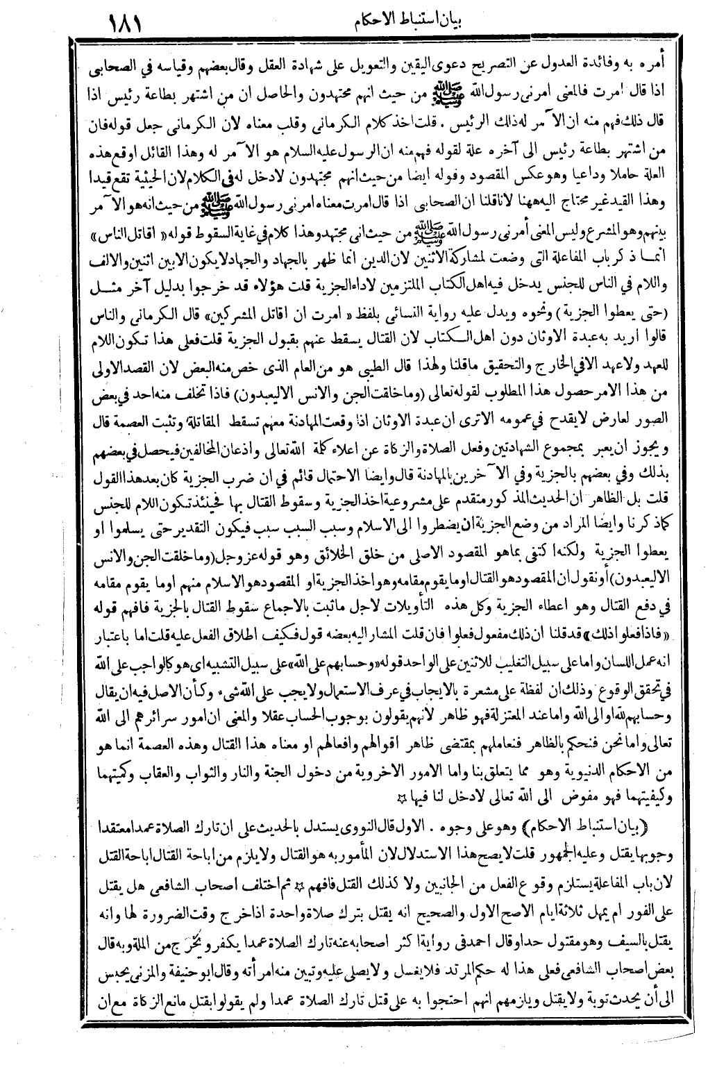 (بَيَان استنباط الْأَحْكَام) وَهُوَ على وُجُوه. الأول: قَالَ النَّوَوِيّ: يسْتَدلّ بِالْحَدِيثِ على أَن تَارِك الصَّلَاة عمدا مُعْتَقدًا وُجُوبهَا يقتل، وَعَلِيهِ الْجُمْهُور. قلت: لَا يَصح هَذَا الِاسْتِدْلَال لِأَن الْمَأْمُور بِهِ هُوَ الْقِتَال، وَلَا يلْزم من إِبَاحَة الْقِتَال إِبَاحَة الْقَتْل، لِأَن بَاب المفاعلة يسْتَلْزم وُقُوع الْفِعْل من الْجَانِبَيْنِ، وَلَا كَذَلِك الْقَتْل فَافْهَم. ثمَّ اخْتلف أَصْحَاب الشَّافِعِي: هَل يقتل على الْفَوْر أم يُمْهل ثَلَاثَة أَيَّام؟ الْأَصَح الأول، وَالصَّحِيح أَنه يقتل بترك صَلَاة وَاحِدَة إِذا خرج وَقت الضَّرُورَة لَهَا، وَأَنه يقتل بِالسَّيْفِ، وَهُوَ مقتول حدا. وَقَالَ أَحْمد فِي رِوَايَة أَكثر أَصْحَابه عَنهُ: تَارِك الصَّلَاة عمدا يكفر وَيخرج من الْملَّة، وَبِه قَالَ بعض أَصْحَاب الشَّافِعِي، فعلى هَذَا لَهُ حكم الْمُرْتَد، فَلَا يغسل وَلَا يصلى عَلَيْهِ، وَتبين مِنْهُ امْرَأَته. وَقَالَ أَبُو حنيفَة، والمزني: يحبس إِلَى أَن يحدث تَوْبَة وَلَا يقتل، ويلزمهم أَنهم احْتَجُّوا بِهِ على قتل تَارِك الصَّلَاة عمدا، وَلم يَقُولُوا بقتل مَانع الزَّكَاة، مَعَ أَن