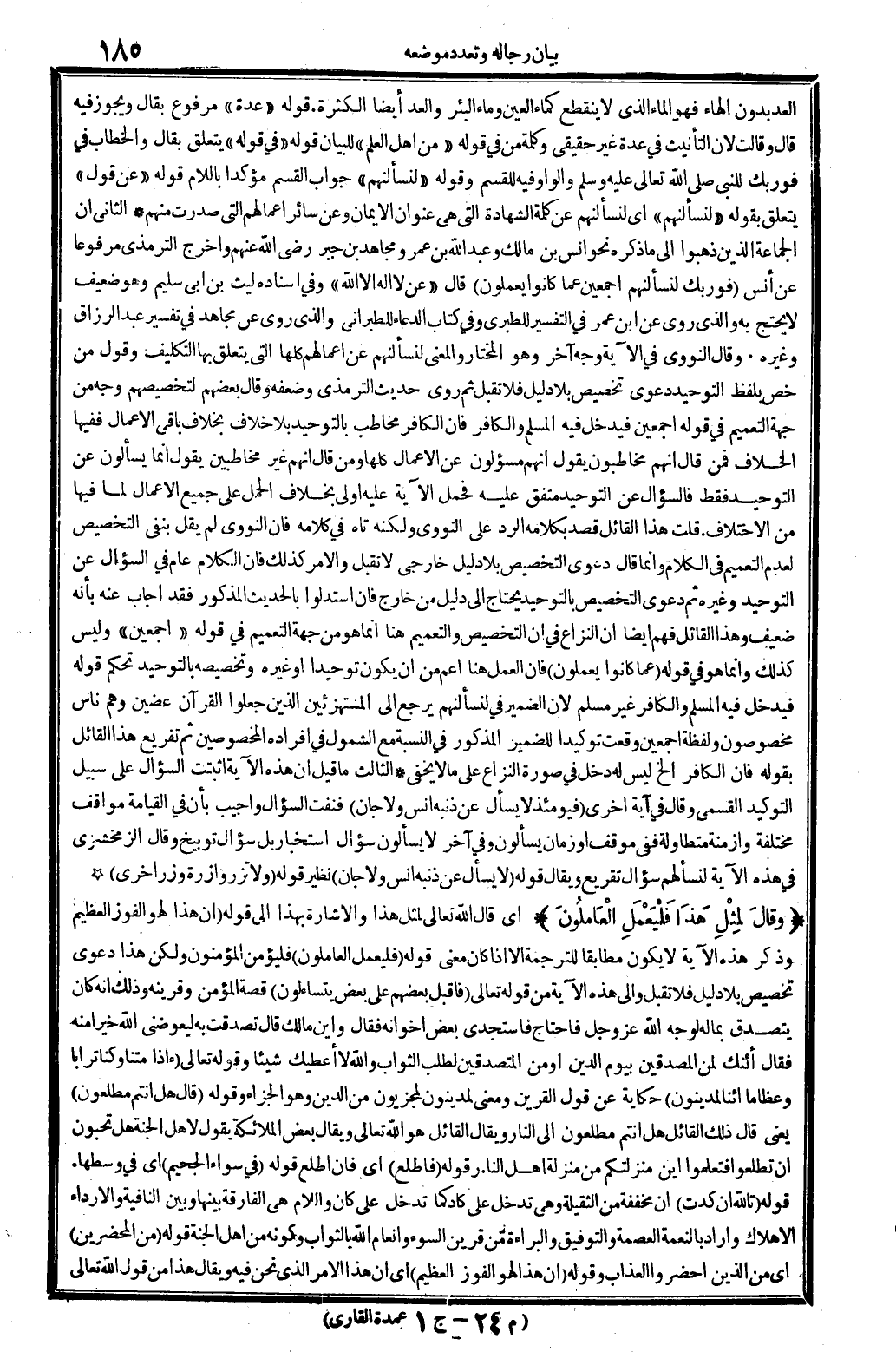 الْعد بِدُونِ الْهَاء فَهُوَ: المَاء الَّذِي لَا يَنْقَطِع، كَمَاء الْعين وَمَاء الْبِئْر. وَالْعد أَيْضا: الْكَثْرَة. قَوْله: (عدَّة) مَرْفُوع بقال، وَيجوز فِيهِ قَالَ وَقَالَت لِأَن التَّأْنِيث فِي عدَّة غير حَقِيقِيّ، وَكلمَة من فِي قَوْله: (من أهل الْعلم) للْبَيَان، قَوْله: (فِي قَوْله) يتَعَلَّق بقال، وَالْخطاب فِي: {فوربك} (الْحجر: 92) للنَّبِي صلى الله عَلَيْهِ وَسلم، وَالْوَاو فِيهِ للقسم، وَقَوله: {لنسألنهم} (الْحجر: 92) جَوَاب الْقسم مؤكدا بِاللَّامِ. قَوْله: {عَن قَول} (الْحجر: 92) يتَعَلَّق بقوله: {لنسألنهم} أَي: لنسألنهم عَن كلمة الشَّهَادَة الَّتِي هِيَ عنوان الْإِيمَان، وَعَن سَائِر أَعْمَالهم الَّتِي صدرت مِنْهُم. الثَّانِي: أَن الْجَمَاعَة الَّذين ذَهَبُوا إِلَى مَا ذكره نَحْو أنس بن مَالك وَعبد الله بن عمر وَمُجاهد بن جبر رَضِي الله عَنْهُم، وَأخرج التِّرْمِذِيّ مَرْفُوعا، عَن أنس: {فوربك لنسألنهم أَجْمَعِينَ عَمَّا كَانُوا يعْملُونَ} (الْحجر: 92) قَالَ: (عَن لَا إِلَه إِلَّا الله) وَفِي إِسْنَاده لَيْث بن أبي سليم وَهُوَ ضَعِيف لَا يحْتَج بِهِ، وَالَّذِي روى عَن ابْن عمر فِي (التَّفْسِير) للطبري وَفِي كتاب (الدُّعَاء) للطبراني، وَالَّذِي روى عَن مُجَاهِد فِي تَفْسِير عبد الرَّزَّاق وَغَيره. وَقَالَ النَّوَوِيّ: فِي الْآيَة وَجه آخر وَهُوَ الْمُخْتَار، وَالْمعْنَى لنسألنهم عَن أَعْمَالهم كلهَا الَّتِي يتَعَلَّق بهَا التَّكْلِيف؛ وَقَول من خص بِلَفْظ التَّوْحِيد دَعْوَى تَخْصِيص بِلَا دَلِيل فَلَا تقبل ثمَّ روى حَدِيث التِّرْمِذِيّ وَضَعفه، وَقَالَ بَعضهم: لتخصيصهم، وَجه من جِهَة التَّعْمِيم فِي قَوْله: أَجْمَعِينَ، فَيدْخل فِيهِ الْمُسلم وَالْكَافِر، فَإِن الْكَافِر مُخَاطب بِالتَّوْحِيدِ بِلَا خلاف، بِخِلَاف بَاقِي الْأَعْمَال فَفِيهَا الْخلاف، فَمن قَالَ إِنَّهُم مخاطبون يَقُول: إِنَّهُم مسؤولون عَن الْأَعْمَال كلهَا. وَمن قَالَ: إِنَّهُم غير مخاطبين، يَقُول: إِنَّمَا يسْأَلُون عَن التَّوْحِيد فَقَط، فالسؤال عَن التَّوْحِيد مُتَّفق عَلَيْهِ، فَحمل الْآيَة عَلَيْهِ أولى بِخِلَاف الْحمل على جَمِيع الْأَعْمَال لما فِيهَا من الِاخْتِلَاف. قلت: هَذَا الْقَائِل قصد بِكَلَامِهِ الرَّد على النَّوَوِيّ، وَلكنه تاه فِي كَلَامه، فَإِن النَّوَوِيّ لم يقل بِنَفْي التَّخْصِيص لعدم التَّعْمِيم فِي الْكَلَام، وَإِنَّمَا قَالَ: دَعْوَى التَّخْصِيص بِلَا دَلِيل خارجي لَا تقبل، وَالْأَمر كَذَلِك غإن الْكَلَام عَام فِي السُّؤَال عَن التَّوْحِيد وَغَيره ثمَّ دَعْوَى التَّخْصِيص بِالتَّوْحِيدِ يحْتَاج إِلَى دَلِيل من خَارج، فَإِن استدلوا بِالْحَدِيثِ الْمَذْكُور فقد أجَاب عَنهُ بِأَنَّهُ ضَعِيف، وَهَذَا الْقَائِل فهم أَيْضا أَن النزاع فِي أَن التَّخْصِيص والتعميم هُنَا إِنَّمَا هُوَ من جِهَة التَّعْمِيم هُنَا إِنَّمَا هُوَ من جِهَة التَّعْمِيم فِي قَوْله: {أَجْمَعِينَ} (الْحجر: 92) وَلَيْسَ كَذَلِك، وَإِنَّمَا هُوَ فِي قَوْله: {عَمَّا كَانُوا يعْملُونَ} (الْحجر: 92) فَإِن الْعَمَل هُنَا أَعم من أَن يكون توحيدا أَو غَيره، وتخصيصه بِالتَّوْحِيدِ تحكم قَوْله فَيدْخل فِيهِ الْمُسلم، وَالْكَافِر غير مُسلم، لِأَن الضَّمِير فِي لنسألنهم، يرجع إِلَى الْمُسْتَهْزِئِينَ الَّذين جعلُوا الْقُرْآن عضين، وهم نَاس مخصوصون. وَلَفْظَة أَجْمَعِينَ، وَقعت توكيدا للضمير الْمَذْكُور فِي النِّسْبَة مَعَ الشُّمُول فِي أَفْرَاده المخصوصين، ثمَّ تَفْرِيع هَذَا الْقَائِل بقوله: فَإِن الْكَافِر إِلَخ لَيْسَ لَهُ دخل فِي صُورَة النزاع على مَا لَا يخفى. الثَّالِث: مَا قيل: إِن هَذِه الْآيَة أَثْبَتَت السُّؤَال على سَبِيل التوكيد القسمي، وَقَالَ فِي آيَة أُخْرَى {فَيَوْمئِذٍ لَا يسْأَل عَن ذَنبه أنس وَلَا جَان} (الرَّحْمَن: 39) فنفت السُّؤَال. 
