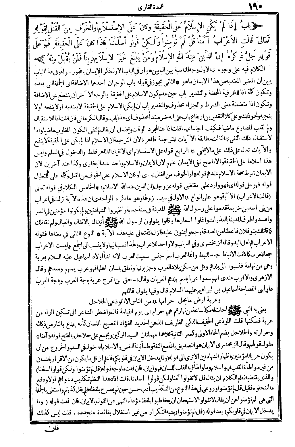 الْكَلَام فِيهِ على وُجُوه الاول: وَجه الْمُنَاسبَة بَين الْبَابَيْنِ هُوَ أَن فِي الْبَاب الأول ذكر الْإِيمَان بِاللَّه وَرَسُوله، وَفِي هَذَا الْبَاب يبين ان الْمُعْتَبر المعتد بِهِ من هَذَا الْإِيمَان مَا هُوَ. الثَّانِي: يجوز فِي قَوْله بَاب، الْوَجْهَانِ: أَحدهمَا الْإِضَافَة إِلَى الْجُمْلَة الَّتِي بعده، وَتَكون كلمة إِذا، للظرفية الْمَحْضَة، وَالتَّقْدِير: بَاب حِين عدم كَون الْإِسْلَام على الْحَقِيقَة. وَالْوَجْه الآخر: أَن يَنْقَطِع عَن الْإِضَافَة وَتَكون، إِذا، متضمنة معنى الشَّرْط، وَالْجَزَاء مَحْذُوف. وَالتَّقْدِير: بَاب إِن لم يكن الْإِسْلَام على الْحَقِيقَة لَا يعْتد بِهِ، أَو لَا يَنْفَعهُ، أَو لَا ينجيه، وَنَحْو ذَلِك. وعَلى كلا التَّقْدِيرَيْنِ ارْتِفَاع بَاب على انه خبر مُبْتَدأ مَحْذُوف. اي: هَذَا بَاب. وَقَالَ الْكرْمَانِي: فان قلت إِذا، للاستقبال، وَلم، لقلب الْمُضَارع مَاضِيا، فَكيف اجْتِمَاعهمَا؟ قلت: إِذا، هُنَا لمُجَرّد الْوَقْت، وَيحْتَمل أَن يُقَال: لم، لنفي الْكَوْن المقلوب مَاضِيا، و: اذا، لاستقبال ذَلِك النَّفْي. الثَّالِث: مُطَابقَة الْآيَات للتَّرْجَمَة ظَاهِرَة، لِأَن التَّرْجَمَة أَن الْإِسْلَام إِذا لم يكن على الْحَقِيقَة لَا ينفع، والآيات تدل على ذَلِك على مَا لَا يخفى. الرَّابِع: قَوْله: (على الاستسلام) اي الانقياد الظَّاهِر فَقَط وَالدُّخُول فِي السّلم وَلَيْسَ هَذَا إسلاما على الْحَقِيقَة، وإلاَّ لما صَحَّ نفي الايمان عَنْهُم، لَان الْإِيمَان والاسلام وَاحِد عِنْد البُخَارِيّ، وَكَذَا عِنْد آخَرين، لِأَن الْإِيمَان شَرط صِحَة الْإِسْلَام عِنْدهم. قَوْله: (أَو الْخَوْف أَو الْقَتْل) أَي وَكَانَ الْإِسْلَام على الْخَوْف من الْقَتْل، وَكلمَة على التَّعْلِيل، قَوْله: (فَهُوَ على قَوْله) اي: فَهُوَ وَارِد على مُقْتَضى قَوْله، عز وَجل {ان الدّين عِنْد الله الاسلام} (آل عمرَان: 19) الْخَامِس: الْكَلَام فِي قَوْله تَعَالَى: {قَالَت الاعراب} (الحجرات: 14) الْآيَة، وَهُوَ على انواع. الأول: فِي سَبَب نُزُولهَا، وَهُوَ مَا ذكره الواحدي: أَن هَذِه الْآيَة نزلت فِي أَعْرَاب من بني أَسد بن خُزَيْمَة قدمُوا على رَسُول الله صلى الله عَلَيْهِ وَسلم الْمَدِينَة فِي سنة جدبة، واظهروا الشَّهَادَتَيْنِ وَلم يَكُونُوا مُؤمنين فِي السِّرّ، وافسدوا طرق الْمَدِينَة بالعذرات، واغلوا أسعارها، وَكَانُوا يَقُولُونَ لرَسُول لله صلى الله عَلَيْهِ وَسلم: أَتَيْنَاك بالاثقال والعيال وَلم نقاتلك كَمَا قَاتلك بَنو فلَان، فَأَعْطِنَا من الصَّدَقَة، وَجعلُوا يمنون عَلَيْهِ، فَانْزِل الله تَعَالَى عَلَيْهِ هَذِه الْآيَة. النَّوْع الثَّانِي: فِي مَعْنَاهَا، فَقَوله: (الاعراب) هم: أهل البدو قَالَه الزَّمَخْشَرِيّ وَفِي (الْعباب) : وَلَا وَاحِد للأعراب، وَلِهَذَا نسب إِلَيْهَا وَلَا ينْسب إِلَى الْجمع وَلَيْسَت الْأَعْرَاب جمعا للْعَرَب كَمَا كَانَت الأنباط جمعا للنبط، وَإِنَّمَا الْعَرَب اسْم جنس، سميت الْعَرَب لِأَنَّهُ نَشأ أَوْلَاد أسماعيل، عَلَيْهِ السَّلَام، بعربة، وَهِي من تهَامَة، فنسبوا إِلَى بلدهم، وكل من سكن بِلَاد الْعَرَب وجزيرتها ونطق بِلِسَان اهلها فَهُوَ عرب: يمنهم ومعدهم، وَقَالَ الْأَزْهَرِي: وَالْأَقْرَب عِنْدِي أَنهم سموا عربا باسم بلدهم العربات. وَقَالَ اسحق بن الْفرج: عربة باجة الْعَرَب، وباجة الْعَرَب دَار أبي الفصاحة اسماعيل بن ابراهيم عَلَيْهِمَا السَّلَام، قَالَ: وفيهَا يَقُول قَائِلهمْ: