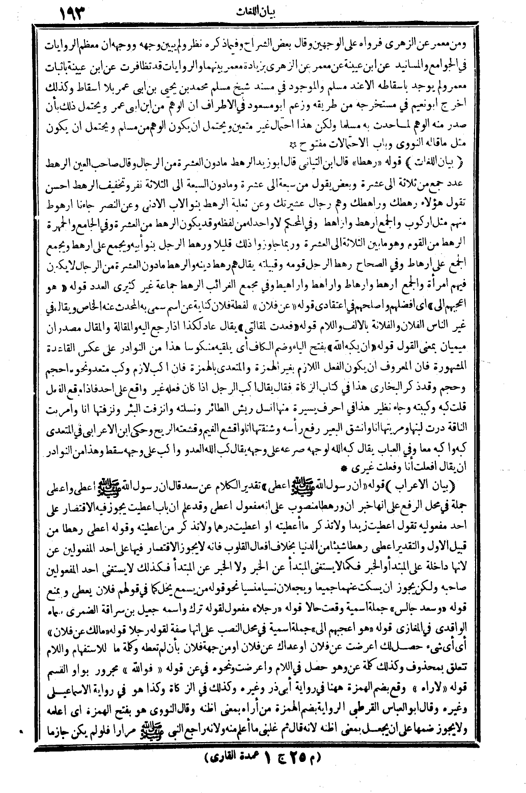 بَيَان الْإِعْرَاب: قَوْله: (إِن رَسُول الله صلى الله عَلَيْهِ وَسلم اعطى) تَقْدِير الْكَلَام عَن سعد، قَالَ: إِن رَسُول الله صلى الله عَلَيْهِ وَسلم اعطى، و: أعْطى، جملَة فِي مَحل الرّفْع على أَنَّهَا خبر إِن، و: رهطاً، مَنْصُوب على انه مفعول: أعْطى، وَقد علم أَن بَاب: اعطيت، يجوز فِيهِ الِاقْتِصَار على أحد مفعوليه، تَقول: اعطيت زيدا، وَلَا تذكر مَا أَعْطيته، أَو أَعْطَيْت درهما، وَلَا تذكر من أعطتيه. وَقَوله: (اعطى رهطا) ، من قبيل الأول، وَالتَّقْدِير: أعْطى رهطاً شَيْئا من الدُّنْيَا؛ بِخِلَاف أَفعَال الْقُلُوب فَإِنَّهُ لَا يجوز الِاقْتِصَار فِيهَا على أحد المفعولين عَن لِأَنَّهَا دَاخِلَة على الْمُبْتَدَأ وَالْخَبَر، فَكَمَا لَا يَسْتَغْنِي الْمُبْتَدَأ عَن الْخَبَر وَلَا الْخَبَر عَن الْمُبْتَدَأ، فَكَذَلِك لَا يَسْتَغْنِي أحد المفعولين عَن صَاحبه، وَلَكِن يجوز أَن يسكت عَنْهُمَا جَمِيعًا، ويجعلان نسياً منسياً، نَحْو قَوْله: من يسمع يخل، كَمَا فِي قَوْلهم: فلَان يُعْطي وَيمْنَع. قَوْله: (وَسعد جَالس) ، جملَة إسمية وَقعت حَالا. قَوْله: (رجلا) ، مفعول لقَوْله: (ترك) واسْمه جعيل بن سراقَة الضمرِي، سَمَّاهُ الْوَاقِدِيّ فِي الْمَغَازِي. قَوْله: (هُوَ أعجبهم إِلَيّ) ، جملَة اسمية فِي مَحل النصب على أَنَّهَا صفة لقَوْله: (رجلا) ، قَوْله: (مَا لَك عَن فلَان) ، أَي: أَي شَيْء حصل لَك أَعرَضت عَن فلَان، أَو عداك عَن فلَان، أَو من جِهَة فلَان، بِأَن لم تعطه؟ وَكلمَة: مَا، للاستفهام، و: اللَّام، تتَعَلَّق بِمَحْذُوف، وَكَذَلِكَ كلمة: عَن، وَهُوَ حصل فِي اللَّام، وأعرضت وَنَحْوه فِي: عَن قَوْله: (فوَاللَّه) مجرور بواو الْقسم. قَوْله: (لأُراه) ، وَقع بِضَم الْهمزَة هَهُنَا فِي رِوَايَة أبي ذَر وَغَيره، وَكَذَلِكَ فِي الزَّكَاة، وَكَذَا هُوَ فِي رِوَايَة الْإِسْمَاعِيلِيّ وَغَيره. وَقَالَ ابو الْعَبَّاس الْقُرْطُبِيّ: الرِّوَايَة بِضَم الْهمزَة من: أرَاهُ، بِمَعْنى: أَظُنهُ. وَقَالَ النووى: هُوَ بِفَتْح الْهمزَة، أَي: أعلمهُ، وَلَا يجوز ضمهَا على أَن يَجْعَل بِمَعْنى أَظُنهُ، لِأَنَّهُ قَالَ: ثمَّ غلبني مَا أعلم مِنْهُ، ولانه رَاجع النَّبِي صلى الله عَلَيْهِ وَسلم مرَارًا، فَلَو لم يكن جَازِمًا