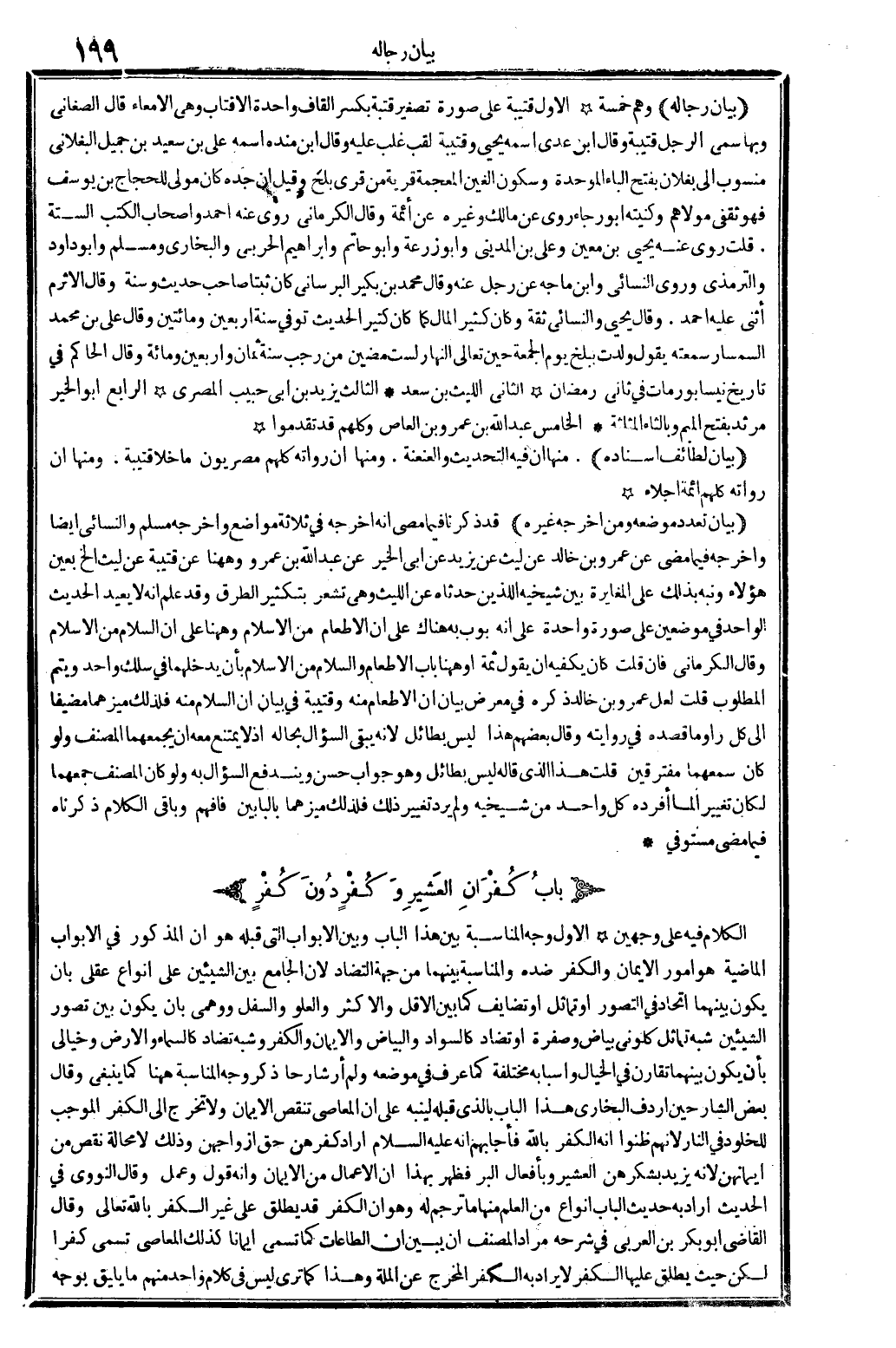 الْكَلَام فِيهِ على وَجْهَيْن: الأول: وَجه الْمُنَاسبَة بَين هَذَا الْبَاب وَبَين الْأَبْوَاب الَّتِي قبله هُوَ: أَن الْمَذْكُور فِي الْأَبْوَاب الْمَاضِيَة هُوَ أُمُور الْإِيمَان، وَالْكفْر ضِدّه، والمناسبة بَينهمَا من جِهَة التضاد، لِأَن الْجَامِع بَين الشَّيْئَيْنِ على أَنْوَاع: عَقْلِي: بِأَن يكون بَينهمَا اتِّحَاد فِي التَّصَوُّر أَو تماثل أَو تضايف، كَمَا بَين الْأَقَل وَالْأَكْثَر، والعلو والسفل. و: وهمي: بِأَن يكون بَين تصور الشَّيْئَيْنِ شبه تماثل، كلوني بَيَاض وصفرة، أَو تضَاد كالسواد وَالْبَيَاض، وَالْإِيمَان وَالْكفْر، وَشبه تضَاد: كالسماء وَالْأَرْض، و: خيالي: بِأَن يكون بَينهمَا تقارن فِي الخيال، وأسبابه مُخْتَلفَة كَمَا عرف فِي مَوْضِعه، وَلم أر شارحا ذكر وَجه الْمُنَاسبَة هَهُنَا كَمَا يَنْبَغِي، وَقَالَ بعض الشَّارِحين: أرْدف البُخَارِيّ هَذَا الْبَاب بِالَّذِي قبله لينبه على أَن الْمعاصِي تنقص الْإِيمَان وَلَا تخرج إِلَى الْكفْر الْمُوجب للخلود فِي النَّار، لأَنهم ظنُّوا أَنه الْكفْر بِاللَّه، فأجابهم أَنه، عَلَيْهِ السَّلَام، أَرَادَ كفرهن حق أَزوَاجهنَّ، وَذَلِكَ لَا محَالة نقص من إيمانهن، لِأَنَّهُ يزِيد بشكرهن العشير وبأفعال الْبر، فَظهر بِهَذَا أَن الْأَعْمَال من الْإِيمَان، وَأَنه قَول وَعمل. وَقَالَ النَّوَوِيّ فِي الحَدِيث، أَرَادَ بِهِ حَدِيث الْبَاب أَنْوَاع من الْعلم: مِنْهَا مَا ترْجم لَهُ، وَهُوَ أَن الْكفْر قد يُطلق على غير الْكفْر بِاللَّه تَعَالَى؛ وَقَالَ القَاضِي أَبُو بكر بن الْعَرَبِيّ فِي شَرحه: مُرَاد المُصَنّف أَن يبين أَن الطَّاعَات كَمَا تسمى إِيمَانًا كَذَلِك الْمعاصِي تسمى كفرا، لَكِن حَيْثُ يُطلق عَلَيْهَا الْكفْر لَا يُرَاد بِهِ الْكفْر الْمخْرج عَن الْملَّة، وَهَذَا كَمَا ترى لَيْسَ فِي كَلَام وَاحِد مِنْهُم مَا يَلِيق بِوَجْه