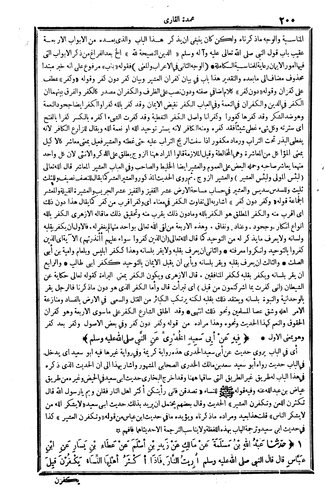 الْوَجْه الثَّانِي: فِي الْإِعْرَاب وَالْمعْنَى: فَقَوله: (بَاب) مَرْفُوع على أَنه خبر مُبْتَدأ مَحْذُوف مُضَاف إِلَى مَا بعده، وَالتَّقْدِير: هَذَا بَاب فِي بَيَان كفران العشير وَبَيَان كفر دون كفر. وَقَوله: (وَكفر) ، عطف على كفران. وَقَوله: (دون كفر) كَلَام إضافي فِي صفته، وَدون، نصب على الظّرْف، و: الكفران، مصدر كالكفر، وَالْفرق بَينهمَا أَن الْكفْر فِي الدّين، والكفران فِي النِّعْمَة. وَفِي (الْعباب) : الْكفْر نقيض الْإِيمَان، وَقد كفر بِاللَّه كفرا، وَالْكفْر أَيْضا جحود النِّعْمَة وَهُوَ ضد الشُّكْر، وَقد كفرها كفورا وكفرانا، وأصل الْكفْر التغطية، وَقد كفرت الشَّيْء أكفره، بالكسرة، كفرا، بِالْفَتْح، أَي: سترته، وكل شَيْء غطى شَيْئا فقد كفره، وَمِنْه: الْكَافِر، لِأَنَّهُ يستر تَوْحِيد الله، أَو نعْمَة الله، وَيُقَال للزارع: الْكَافِر لِأَنَّهُ يُغطي الْبذر تَحت التُّرَاب، و: رماد مكفور، إِذا سفت الرّيح التُّرَاب عَلَيْهِ حَتَّى غطته؛ والعشير: فعيل بِمَعْنى معاشر، كالأكيل بِمَعْنى المؤاكل، من المعاشرة وَهِي المخالطة، وَقيل: الْمُلَازمَة. قَالُوا: المُرَاد هَهُنَا الزَّوْج، يُطلق على الذّكر وَالْأُنْثَى، لِأَن كل وَاحِد مِنْهُمَا يعاشر صَاحبه، وَحمله الْبَعْض على الْعُمُوم. والعشير أَيْضا الخليط والصاحب، وَفِي (الْعباب) : العشير: المعاشر، قَالَ الله تَعَالَى: {لبئس الْمولى ولبئس العشير} (الْحَج: 13) والعشير: الزَّوْج. ثمَّ روى الحَدِيث الْمَذْكُور، والعشير: الْعشْر، كَمَا يُقَال لِلنِّصْفِ: نصيف، وللثلث: ثليث، وللسدس: سديس. والعشير فِي حِسَاب مساحة الأَرْض: عشر القفيز، والقفيز: عشر الجريب، وَالْعشيرَة: الْقَبِيلَة، والمعشر: الْجَمَاعَة. قَوْله: (وَكفر دون كفر) أَشَارَ بِهِ إِلَى تفَاوت الْكفْر فِي مَعْنَاهُ، أَي: وَكفر أقرب من كفر، كَمَا يُقَال: هَذَا دون ذَلِك، أَي: أقرب مِنْهُ. وَالْكفْر الْمُطلق هُوَ الْكفْر بِاللَّه، وَمَا دون ذَلِك يقرب مِنْهُ، وَتَحْقِيق ذَلِك مَا قَالَه الْأَزْهَرِي: الْكفْر بِاللَّه أَنْوَاع: إِنْكَار، وجحود، وعناد، ونفاق. وَهَذِه الْأَرْبَعَة من لقى الله تَعَالَى بِوَاحِد مِنْهَا لم يغْفر لَهُ. فَالْأول: أَن يكفر بِقَلْبِه وَلسَانه، وَلَا يعرف مَا يذكر لَهُ من التَّوْحِيد، كَمَا قَالَ الله تَعَالَى: {إِن الَّذين كفرُوا سَوَاء عَلَيْهِم أأنذرتهم} (الْبَقَرَة: 6) الْآيَة أَي: الَّذين كفرُوا بِالتَّوْحِيدِ وأنكروا مَعْرفَته. وَالثَّانِي: أَن يعرف بِقَلْبِه وَلَا يقر بِلِسَانِهِ، وَهَذَا ككفر إِبْلِيس وبلعام وَأُميَّة بن أبي الصَّلْت. وَالثَّالِث: أَن يعرف بِقَلْبِه ويقر بِلِسَانِهِ، ويأبى أَن يقبل الْإِيمَان بِالتَّوْحِيدِ ككفر أبي طَالب. وَالرَّابِع: أَن يقر بِلِسَانِهِ وَيكفر بِقَلْبِه ككفر الْمُنَافِقين. قَالَ الْأَزْهَرِي: وَيكون الْكفْر بِمَعْنى الْبَرَاءَة، كَقَوْلِه تَعَالَى، حِكَايَة عَن الشَّيْطَان: {إِنِّي كفرت بِمَا أشركتمون من قبل} (إِبْرَاهِيم: 22) أَي: تبرأت. قَالَ: وَأما الْكفْر الَّذِي هُوَ دون مَا ذكرنَا، فالرجل يقر بالوحدانية والنبوة بِلِسَانِهِ، ويعتقد ذَلِك بِقَلْبِه، لكنه يرتكب الْكَبَائِر من الْقَتْل، وَالسَّعْي فِي الأَرْض بِالْفَسَادِ، ومنازعة الْأَمر أَهله، وشق عَصا الْمُسلمين وَنَحْو ذَلِك انْتهى. وَقد أطلق الشَّارِع الْكفْر على مَا سوى الْأَرْبَعَة، وَهُوَ: كفران الْحُقُوق وَالنعَم، كَهَذا الحَدِيث وَنَحْوه، وَهَذَا مُرَاده من قَوْله: (وَكفر دون كفر) وَفِي بعض الْأُصُول: وَكفر بعد كفر، وَهُوَ بِمَعْنى الأول.