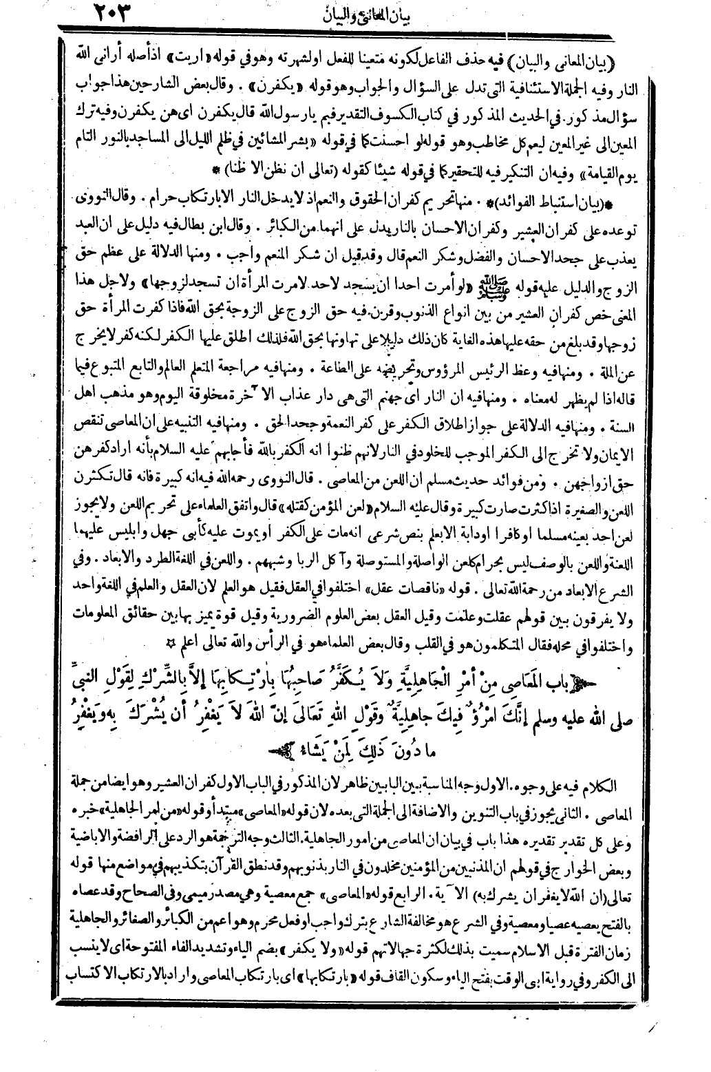 الْكَلَام فِيهِ على وُجُوه: الأول: وَجه الْمُنَاسبَة بَين الْبَابَيْنِ ظَاهر، لِأَن الْمَذْكُور فِي الْبَاب الأول كفران العشير، وَهُوَ أَيْضا من جملَة الْمعاصِي. الثَّانِي: يجوز فِي بَاب التَّنْوِين وَالْإِضَافَة إِلَى الْجُمْلَة الَّتِي بعده، لِأَن قَوْله: (الْمعاصِي) مُبْتَدأ، وَقَوله: (من أَمر الْجَاهِلِيَّة) ، خَبره وعَلى كل تَقْدِير تَقْدِيره: هَذَا بَاب فِي بَيَان أَن الْمعاصِي من أُمُور الْجَاهِلِيَّة. الثَّالِث: وَجه التَّرْجَمَة هُوَ الرَّد على الرافضة والأباضية وَبَعض الْخَوَارِج فِي قَوْلهم: إِن المذنبين من الْمُؤمنِينَ مخلدون فِي النَّار بِذُنُوبِهِمْ، وَقد نطق الْقُرْآن بتكذيبهم فِي مَوَاضِع، مِنْهَا قَوْله تَعَالَى: {إِن الله لَا يغْفر أَن يُشْرك بِهِ} (النِّسَاء: 48 و 116) الْآيَة. الرَّابِع: قَوْله: (الْمعاصِي) ، جمع مَعْصِيّة، وَهِي مصدر ميمي. وَفِي (الصِّحَاح) وَقد عَصَاهُ، بِالْفَتْح، يعصيه عصيا ومعصية. وَفِي الشَّرْع: هُوَ مُخَالفَة الشَّارِع بترك وَاجِب أَو فعل محرم، وَهُوَ أَعم من الْكَبَائِر والصغائر. و: (الْجَاهِلِيَّة) : زمَان الفترة قبل الْإِسْلَام، سميت بذلك لِكَثْرَة جهالاتهم. قَوْله (وَلَا يكفر) ، بِضَم الْيَاء وَتَشْديد الْفَاء الْمَفْتُوحَة، أَي: لَا ينْسب إِلَى الْكفْر، وَفِي رِوَايَة أبي الْوَقْت، بِفَتْح الْيَاء وَسُكُون الْقَاف. قَوْله: (بارتكابها) أَي: بارتكاب الْمعاصِي، وَأَرَادَ بالارتكاب الِاكْتِسَاب