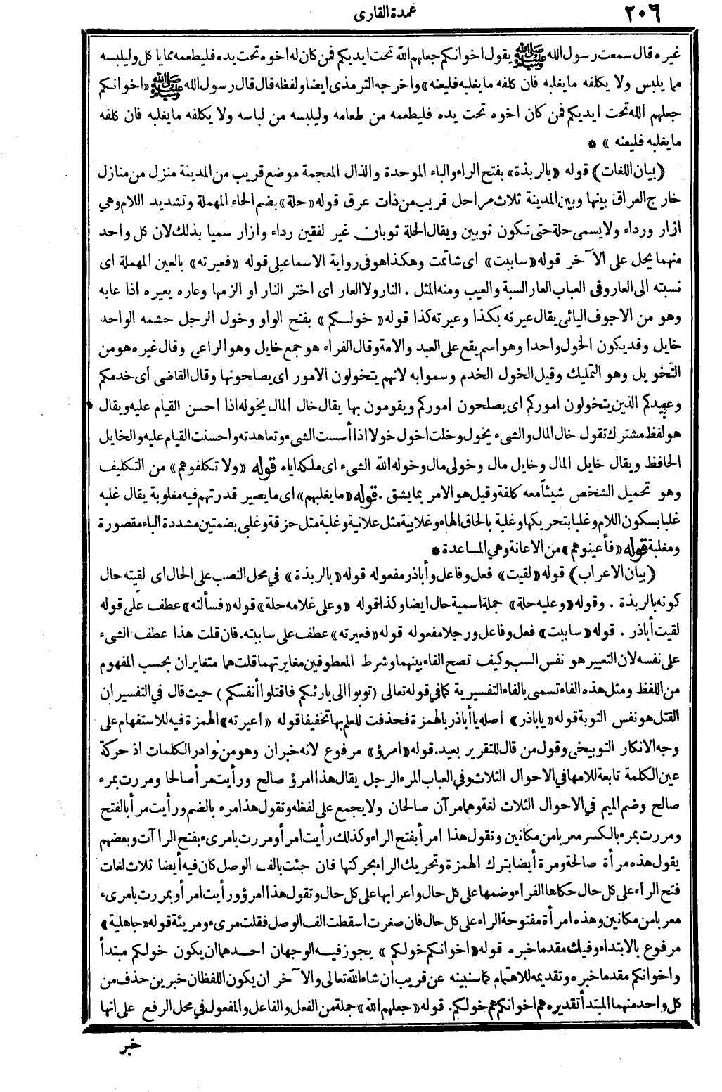 بَيَان الْإِعْرَاب: قَوْله: (لقِيت) فعل وفاعل، وَأَبا ذَر مَفْعُوله. قَوْله: (بالربذة) فِي مَحل النصب على الْحَال، أَي: لَقيته حَال كَونه بالربذة. وَقَوله: (وَعَلِيهِ حلَّة) ، جملَة إسمية حَال أَيْضا، وَكَذَا قَوْله: (وعَلى غُلَامه حلَّة) . قَوْله: (فَسَأَلته) عطف على قَوْله: (لقِيت أَبَا ذَر) . قَوْله: (ساببت) فعل وفاعل و: (رجلا) مَفْعُوله. قَوْله: (فَعَيَّرْته) ، عطف على (ساببته) . فَإِن قلت: هَذَا عطف الشَّيْء على نَفسه لِأَن التعيير هُوَ نفس السب، وَكَيف تصح الْفَاء بَينهمَا، وَشرط المعطوفين مغايرتهما؟ قلت: هما متغايران بِحَسب الْمَفْهُوم من اللَّفْظ، وَمثل هَذِه الْفَاء تسمى بِالْفَاءِ التفسيرية، كَمَا فِي قَوْله تَعَالَى: {تُوبُوا إِلَى بارئكم فَاقْتُلُوا أَنفسكُم} (الْبَقَرَة: 54) حَيْثُ قَالَ فِي التَّفْسِير: إِن الْقَتْل هُوَ نفس التَّوْبَة. قَوْله: (يَا باذر) أَصله، يَا أَبَا ذَر، بِالْهَمْزَةِ فحذفت للْعلم بهَا تَخْفِيفًا. قَوْله: (أعيرته) ؟ الْهمزَة فِيهِ للاستفهام على وَجه الْإِنْكَار التوبيخي، وَقَول من قَالَ للتقرير، بعيد. قَوْله: (امْرُؤ) مَرْفُوع لِأَنَّهُ خبر: إِن، وَهُوَ من نَوَادِر الْكَلِمَات، إِذْ حَرَكَة عين الْكَلِمَة تَابِعَة للامها فِي الْأَحْوَال الثَّلَاث وَفِي (الْعباب) : الْمَرْء، الرجل، يُقَال: هَذَا امْرُؤ صَالح، وَرَأَيْت مرأ صَالحا، ومررت بمره صَالح، وَضم الْمِيم فِي الْأَحْوَال الثَّلَاث لُغَة، وهما مرآن صالحان، وَلَا يجمع على لَفظه، وَتقول: هَذَا مرء، بِالضَّمِّ، و: رَأَيْت مرأ،، بِالْفَتْح ومررت بمرء بِالْكَسْرِ معربا من مكانين. وَتقول: هَذَا أمرأ، بِفَتْح الرَّاء، وَكَذَلِكَ: رَأَيْت أمرأ، أَو مَرَرْت بأمرى بِفَتْح الراءآت. وَبَعْضهمْ يَقُول هَذِه: مرأة صَالِحَة وَمرَّة أَيْضا بترك الْهمزَة وتحريك الرَّاء بحركتها، فَإِن جِئْت بِأَلف الْوَصْل كَانَ فِيهِ أَيْضا ثَلَاث لُغَات: فتح الرَّاء على كل حَال حَكَاهَا الْفراء، وَضمّهَا على كل حَال، وإعرابها على كل حَال، وَتقول: هَذَا أمرؤ وَرَأَيْت أمرأ، أَو بمررت بامرىء، معربا من مكانين، وَهَذِه امْرَأَة، مَفْتُوحَة الرَّاء على كل حَال، وإعرابها على كل حَال، فَإِن صغرت أسقطت ألف الْوَصْل فَقلت: مرىء ومريئة. قَوْله: (جَاهِلِيَّة) مَرْفُوع بِالِابْتِدَاءِ (وفيك) مقدما خَبره. قَوْله: (إخْوَانكُمْ خولكم) يجوز فِيهِ الْوَجْهَانِ. أَحدهمَا: أَن يكون (خولكم) مُبْتَدأ و (إخْوَانكُمْ) مقدما خَبره، وتقديمه للاهتمام كَمَا سنبينه عَن قريب إِن شَاءَ الله تَعَالَى. وَالْآخر: أَن يكون اللفظان خبرين حذف من كل وَاحِد مِنْهُمَا الْمُبْتَدَأ، تَقْدِيره: هم إخْوَانكُمْ هم خولكم. قَوْله: (جعلهم الله) جملَة من الْفِعْل وَالْفَاعِل وَالْمَفْعُول فِي مَحل الرّفْع على أَنَّهَا