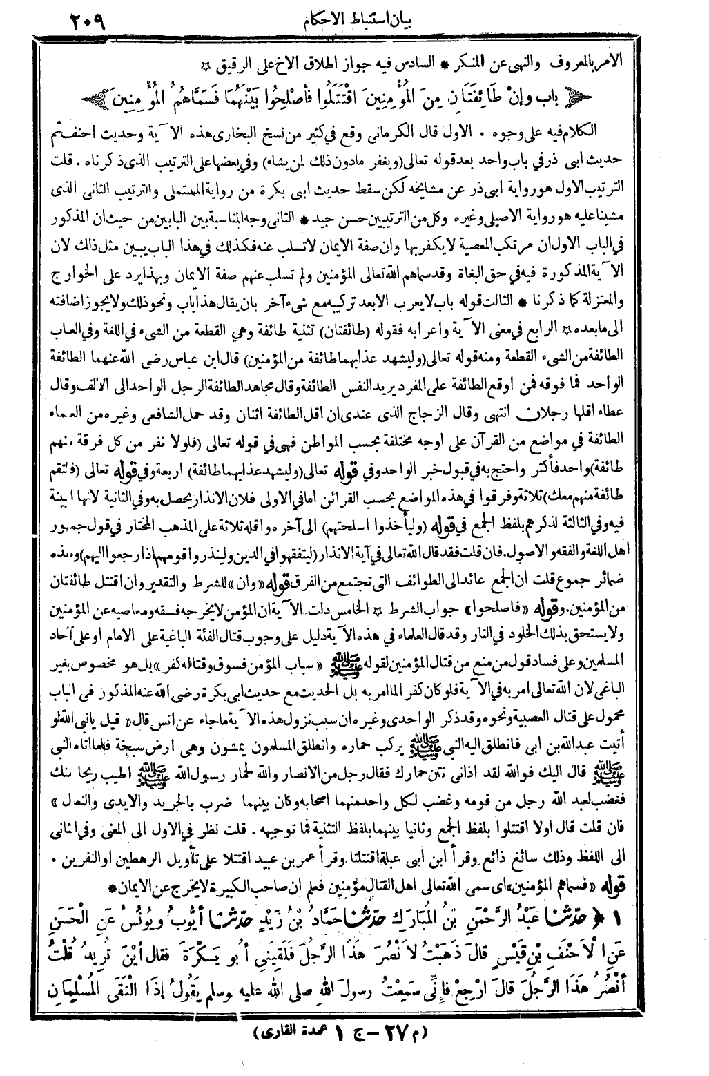 الْكَلَام فِيهِ على وُجُوه. الأول: قَالَ الْكرْمَانِي: وَقع فِي كثير من نسخ البُخَارِيّ هَذِه الْآيَة، وَحَدِيث أحنف، ثمَّ حَدِيث أبي ذَر فِي بَاب وَاحِد بعد قَوْله تَعَالَى: {وَيغْفر مَا دون ذَلِك لمن يَشَاء} (النِّسَاء: 48 و 116) وَفِي بَعْضهَا على التَّرْتِيب الَّذِي ذَكرْنَاهُ. قلت: التَّرْتِيب الأول وَهُوَ رِوَايَة أبي ذَر عَن مشايخه، لَكِن سقط حَدِيث أبي بكرَة من رِوَايَة الْمُسْتَمْلِي، وَالتَّرْتِيب الثَّانِي الَّذِي مشينا عَلَيْهِ هُوَ رِوَايَة الْأصيلِيّ وَغَيره، وكل من الترتيبين حسن جيد. الثَّانِي: وَجه الْمُنَاسبَة بَين الْبَابَيْنِ من حَيْثُ إِن الْمَذْكُور فِي الْبَاب الأول أَن مرتكب الْمعْصِيَة لَا يكفر بهَا، وَأَن صفة الْإِيمَان لَا تسلب عَنهُ، فَكَذَلِك فِي هَذَا الْبَاب يبين مثل ذَلِك، لِأَن الْآيَة الْمَذْكُورَة فِيهِ فِي حق الْبُغَاة، وَقد سماهم الله تَعَالَى الْمُؤمنِينَ وَلم تسلب عَنْهُم صفة الْإِيمَان، وَبِهَذَا يرد على الْخَوَارِج والمعتزلة كَمَا ذكرنَا. الثَّالِث: قَوْله: (بَاب) لَا يعرب إلاَّ بعد تركيبه مَعَ شَيْء آخر، بِأَن يُقَال: هَذَا بَاب، وَنَحْو ذَلِك، ولايجوز إِضَافَته إِلَى مَا بعده. الرَّابِع: فِي معنى الْآيَة وَإِعْرَابه. فَقَوله {طَائِفَتَانِ} (الحجرات: 9) تَثْنِيَة طَائِفَة، وَهِي الْقطعَة من الشَّيْء فِي اللُّغَة. وَفِي (الْعباب) : الطَّائِفَة من الشَّيْء الْقطعَة، وَمِنْه قَوْله تَعَالَى: {وليشهد عذابهما طَائِفَة من الْمُؤمنِينَ} (النُّور: 2) قَالَ ابْن عَبَّاس، رَضِي الله عَنْهُمَا: الطَّائِفَة الْوَاحِد فَمَا فَوْقه، فَمن أوقع الطَّائِفَة على الْمُفْرد يُرِيد النَّفس الطَّائِفَة وَقَالَ مُجَاهِد: الطَّائِفَة الرجل الْوَاحِد إِلَى الْألف. وَقَالَ عَطاء: أقلهَا رجلَانِ. انْتهى. وَقَالَ الزّجاج: الَّذِي عِنْدِي أَن أقل الطَّائِفَة اثْنَان، وَقد حمل الشَّافِعِي وَغَيره من الْعلمَاء الطَّائِفَة فِي مَوَاضِع من الْقُرْآن على أوجه مُخْتَلفَة بِحَسب المواطن، فَهِيَ فِي قَوْله تَعَالَى: {فلولا نفر من كل فرقة مِنْهُم طَائِفَة} (التَّوْبَة: 122) وَاحِد فَأكْثر، وَاحْتج بِهِ فِي قبُول خبر الْوَاحِد، وَفِي قَوْله تَعَالَى: {وليشهد عذابهما طَائِفَة} (النُّور: 2) أَرْبَعَة، وَفِي قَوْله تَعَالَى: {فلتقم طَائِفَة مِنْهُم مَعَك} (النِّسَاء: 102) ثَلَاثَة، وَفرقُوا فِي هَذِه الْمَوَاضِع بِحَسب الْقَرَائِن، أما فِي الأولى، فَلِأَن الْإِنْذَار يحصل بِهِ، وَفِي الثَّانِيَة لِأَنَّهَا لبينة فِيهِ، وَفِي الثَّالِثَة لذكرهم بِلَفْظ الْجمع فِي قَوْله: {وليأخذوا أسلحتهم} (النِّسَاء: 102) إِلَى آخِره، وَأقله ثَلَاثَة على الْمَذْهَب الْمُخْتَار فِي قَول جُمْهُور أهل اللُّغَة وَالْفِقْه وَالْأُصُول. فَإِن قلت: فقد قَالَ الله تَعَالَى فِي آيَة الانذار: {ليتفقهوا فِي الدّين ولينذروا قَومهمْ إِذا رجعُوا إِلَيْهِم} (التَّوْبَة: 122) وَهَذِه ضمائر جموع! قلت: إِن الْجمع عَائِد إِلَى الطوائف الَّتِي تَجْتَمِع من الْفرق قَوْله: (وَإِن) للشّرط. وَالتَّقْدِير: وَإِن اقتتل طَائِفَتَانِ من الْمُؤمنِينَ. وَقَوله: (فأصلحوا) جَوَاب الشَّرْط. الْخَامِس: دلّت الْآيَة أَن الْمُؤمن لَا يُخرجهُ فسقه ومعاصيه عَن الْمُؤمنِينَ، وَلَا يسْتَحق بذلك الخلود فِي النَّار، وَقد قَالَ الْعلمَاء: فِي هَذِه الْآيَة دَلِيل على وجوب قتال الفئة الباغية على الإِمَام أَو على آحَاد الْمُسلمين، وعَلى فَسَاد قَول من منع من قتال الْمُؤمنِينَ لقَوْله صلى الله عَلَيْهِ وَسلم: (سباب الْمُؤمن فسوق وقتاله كفر) ، بل هُوَ مَخْصُوص بِغَيْر الْبَاغِي لِأَن الله تَعَالَى أَمر بِهِ فِي الْآيَة، فَلَو كَانَ كفرا لما أَمر بِهِ، بل الحَدِيث مَعَ حَدِيث أبي بكرَة، رَضِي الله عَنهُ، الْمَذْكُور فِي الْبَاب مَحْمُول على قتال العصبية وَنَحْوه، وَقد ذكر الواحدي وَغَيره أَن 