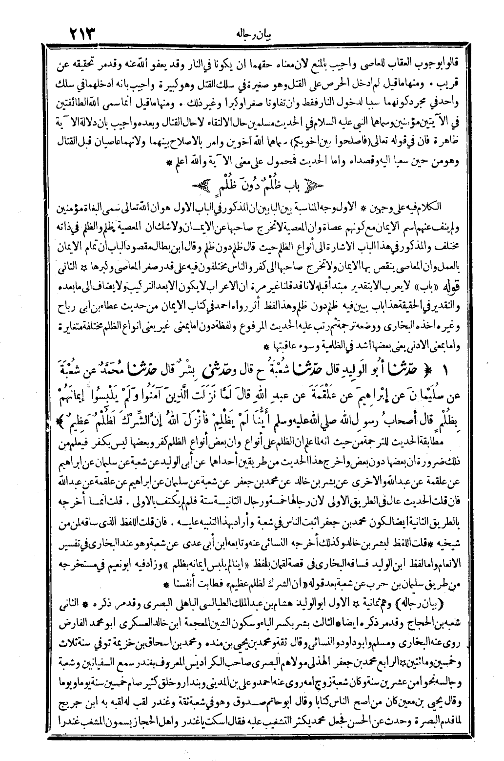 32 - حدّثنا أبُو الوَلِيدِ قَالَ حدّثنا شُعْبَةُ ح قَالَ وحدّثني بِشْرٌ قَالَ حدّثنا مُحَمَّدٌ عَن شُعْبَةَ عَن سُلَيْمَانَ عَن إبْراهِيمَ عَن عَلْقَمَةَ عَن عبدِ اللَّهِ قالَ لَمَّا نَزَلَت الَّذِينَ آمَنُوا وَلَمْ يَلْبِسُوا إيمانَهُمْ بِظُلْمٍ} قَالَ أصحابُ رسولِ الله صلى الله عَلَيْهِ وَسلم أَيُّنَا لَمْ يَظْلِمْ فأنْزَلَ {اللَّهُ إنَّ الشِّرْكَ لَظُلْمٌ عَظِيمٌ} ..