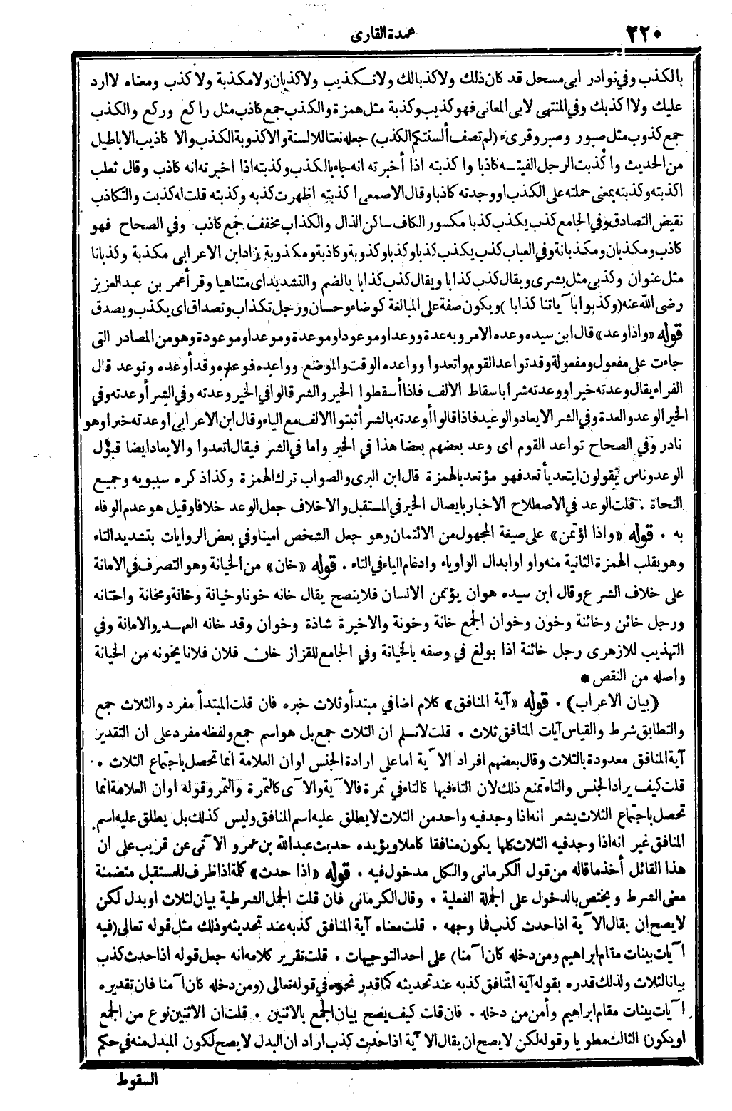 بَيَان الْإِعْرَاب: قَوْله: (آيَة الْمُنَافِق) ، كَلَام إضافي مُبْتَدأ، و (ثَلَاث) خَبره، فَإِن قلت: الْمُبْتَدَأ مُفْرد، وَالثَّلَاث جمع، والتطابق شَرط. وَالْقِيَاس: آيَات الْمُنَافِق ثَلَاث. قلت: لَا نسلم أَن الثَّلَاث جمع، بل هُوَ اسْم جمع وَلَفظه مُفْرد، على أَن التَّقْدِير: آيَة الْمُنَافِق مَعْدُودَة بِالثلَاثِ، وَقَالَ بَعضهم: إِفْرَاد الْآيَة إِمَّا على إِرَادَة الْجِنْس، أَو أَن الْعَلامَة إِنَّمَا تحصل باجتماع الثَّلَاث. قلت: كَيفَ يُرَاد الْجِنْس وَالتَّاء تمنع ذَلِك، لِأَنَّهَا التَّاء فِيهَا كالتاء فِي تَمْرَة، فالآية والآي كالتمرة وَالتَّمْر، وَقَوله: أَو أَن الْعَلامَة إِنَّمَا تحصل باجتماع الثَّلَاث، يشْعر أَنه إِذا وجد فِيهِ وَاحِد من الثَّلَاث لَا يُطلق عَلَيْهِ اسْم الْمُنَافِق، وَلَيْسَ كَذَلِك، بل يُطلق عَلَيْهِ اسْم الْمُنَافِق، غير أَنه إِذا وجد فِيهِ الثَّلَاث كلهَا يكون منافقا كَامِلا، وَيُؤَيِّدهُ حَدِيث عبد الله بن عَمْرو الْآتِي عَن قريب، على أَن هَذَا الْقَائِل أَخذ مَا قَالَه من قَول الْكرْمَانِي، وَالْكل مَدْخُول فِيهِ. قَوْله: (إِذا حدث) ، كلمة إِذا، ظرف للمستقبل متضمنة معنى الشَّرْط، وَيخْتَص بِالدُّخُولِ على الْجُمْلَة الفعلية. وَقَالَ الْكرْمَانِي: فَإِن قلت: الْجمل الشّرطِيَّة بَيَان لثلاث، أَو بدل، لَكِن لَا يَصح أَن يُقَال: الْآيَة إِذا حدث كذب، فَمَا وَجهه؟ قلت: مَعْنَاهُ آيَة الْمُنَافِق كذبه عِنْد تحديثه، وَذَلِكَ مثل قَوْله تَعَالَى: {فِيهِ آيَات بَيِّنَات مقَام إِبْرَاهِيم وَمن دخله كَانَ آمنا} (آل عمرَان: 97) على أحد التوجيهات. قلت: تَقْرِير كَلَامه أَنه جعل قَوْله: إِذا حدث كذب، بَيَانا لثلاث، وَلذَلِك قدره بقوله: آيَة الْمُنَافِق كذبه عِنْد تحديثه، كَمَا قدر نَحوه فِي قَوْله تَعَالَى: {وَمن دخله كَانَ آمنا} (آل عمرَان: 97) فَإِن تَقْدِيره: آيَات بَيِّنَات مقَام إِبْرَاهِيم وَأمن من دخله. فَإِن قلت: كَيفَ يَصح بَيَان الْجمع بالاثنين؟ . قلت: إِن الْإِثْنَيْنِ نوع من الْجمع أَو يكون الثَّالِث مطويا. وَقَوله: لَكِن لَا يَصح أَن يُقَال الْآيَة إِذا حدث كذب، أَرَادَ: أَن الْبَدَل لَا يَصح لكَون الْمُبدل مِنْهُ فِي حكم