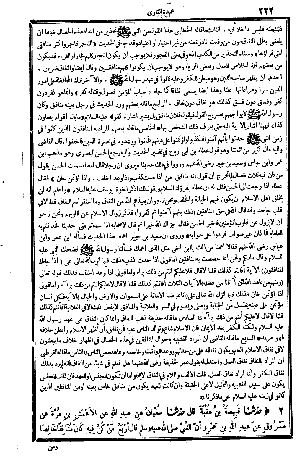 34 - حدّثنا قَبِيصَةُ بنُ عُقْبَةَ قَالَ حدّثنا سُفْيانُ عنِ عبدِ اللَّهِ عَن الأعْمَشِ بنِ مُرَّةَ عَن مَسْرُوقٍ عَن عبدِ اللَّهِ بنِ عَمْرٍ وأنّ النَّبيَّ صلى الله عَلَيْهِ وَسلم قَالَ أرْبَعٌ مَنْ كُنَّ فِيه كَانَ مُنَافِقا خَالِصا