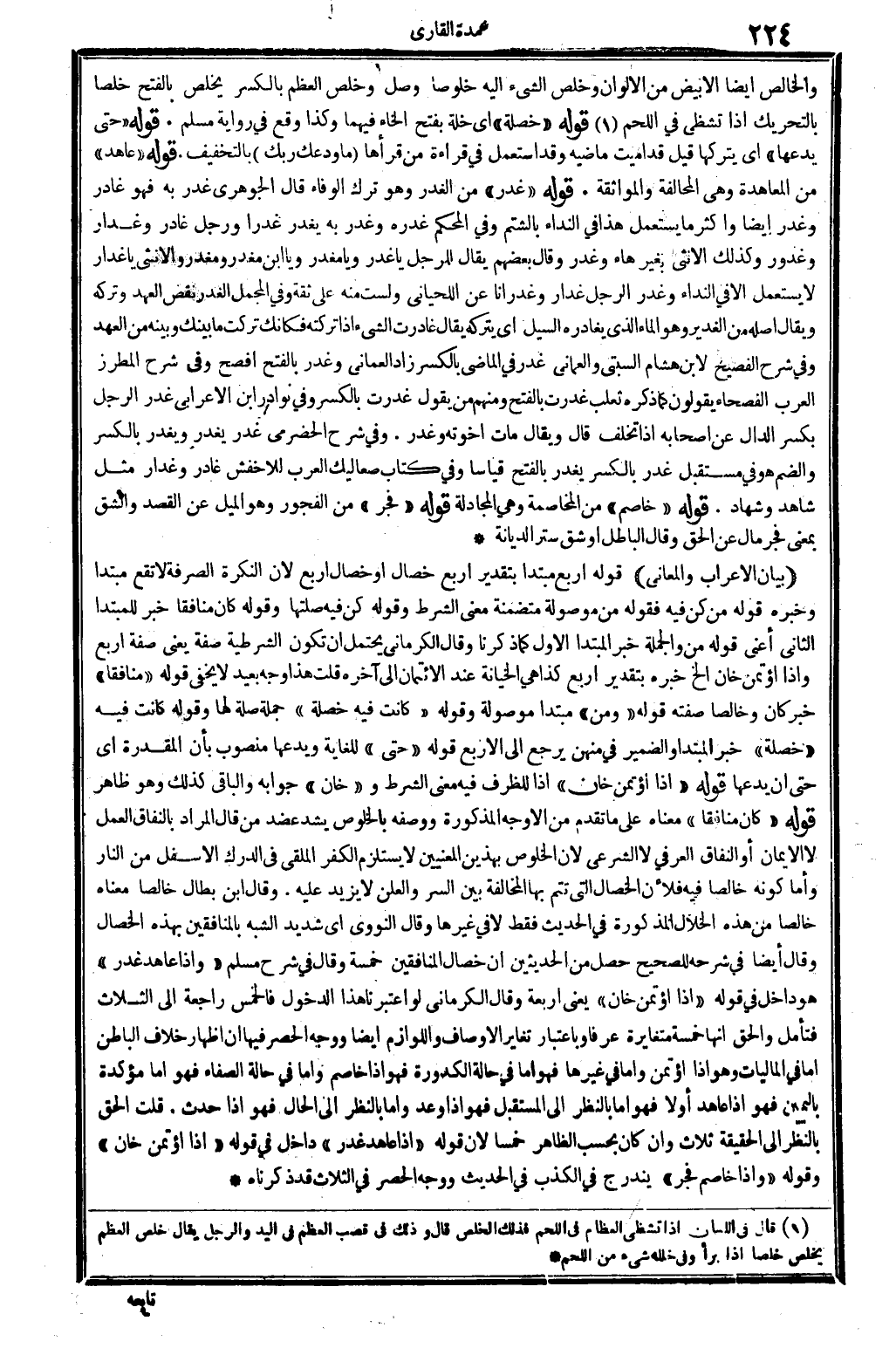والخالص أَيْضا الْأَبْيَض من الألوان، وخلص الشَّيْء إِلَيْهِ خلوصا؛ وصل، وخلص الْعظم، بِالْكَسْرِ، يخلص بِالْفَتْح خلصا بِالتَّحْرِيكِ، إِذا تشظى فِي اللَّحْم. قَوْله: (خصْلَة) أَي خلة، بِفَتْح الْخَاء فيهمَا، وَكَذَا وَقع فِي رِوَايَة مُسلم. قَوْله: (حَتَّى يَدعهَا) ، أَي: يَتْرُكهَا. . قيل: قد أميت ماضيه، وَقد اسْتعْمل فِي قِرَاءَة من قَرَأَهَا {مَا وَدعك رَبك} (الضُّحَى: 3) بِالتَّخْفِيفِ. قَوْله: (عَاهَدَ) من المعاهدة. وَهِي المحالفة والمواثقة. قَوْله: (غدر) من الْغدر، وَهُوَ ترك الْوَفَاء. قَالَ الْجَوْهَرِي: غدر بِهِ فَهُوَ غادر، وغدر أَيْضا، وَأكْثر مَا يسْتَعْمل هَذَا فِي النداء بالشتم. وَفِي (الْمُحكم) : غدره وغدر بِهِ يغدر عدرا، وَرجل غادر وغدار وغدور، وَكَذَلِكَ الْأُنْثَى بِغَيْر هَاء، وغدرة. وَقَالَ بَعضهم: يُقَال للرجل: يَا غدر، وَيَا مغدر، وَيَا ابْن مغدر، ومغدر، وَالْأُنْثَى: يَا غدار. لَا يسْتَعْمل إلاَّ فِي النداء، وغذر الرجل غدار وغدرانا، عَن اللحياني، وَلست مِنْهُ على ثِقَة، وَفِي (الْمُجْمل) : الْغدر نقض الْعَهْد وَتَركه، وَيُقَال: أَصله من الغدير. وَهُوَ المَاء الَّذِي يغادره السَّيْل، أَي: يتْركهُ يُقَال: غادرت الشَّيْء إِذا تركته، فكأنك تركت مَا بَيْنك وَبَينه من الْعَهْد. وَفِي (شرح الفصيح) لِابْنِ هِشَام السبتي والعماني: غدر فِي الْمَاضِي بِالْكَسْرِ، زَاد الْعمانِي: وغدر بِالْفَتْح أفْصح، وَفِي (شرح الْمُطَرز) : الْعَرَب الفصحاء يَقُولُونَ، كَمَا ذكره ثَعْلَب: غدرت بِالْفَتْح. وَمِنْهُم من يَقُول: غدرت، بِالْكَسْرِ. وَفِي (نَوَادِر ابْن الْأَعرَابِي) غدر الرجل، بِكَسْر الدَّال، عَن أَصْحَابه إِذا تخلف. قَالَ: وَيُقَال مَاتَ إخْوَته وغدر. وَفِي (شرح الْحَضْرَمِيّ) : غدر يغدر ويغدر، بِالْكَسْرِ وَالضَّم، هُوَ فِي مُسْتَقْبل غدر بِالْكَسْرِ، يغدر بِالْفَتْح، قِيَاسا. وَفِي كتاب (صعاليك الْعَرَب) للأخفش: غادر وغدار، مثل شَاهد وشهاد. قَوْله: (خَاصم) من الْمُخَاصمَة، وَهِي المجادلة. قَوْله: (فجر) من الْفُجُور، وَهُوَ الْميل عَن الْقَصْد، والشق بِمَعْنى: فجر، مَال عَن الْحق وَقَالَ الْبَاطِل، أَو شقّ ستر الدّيانَة.